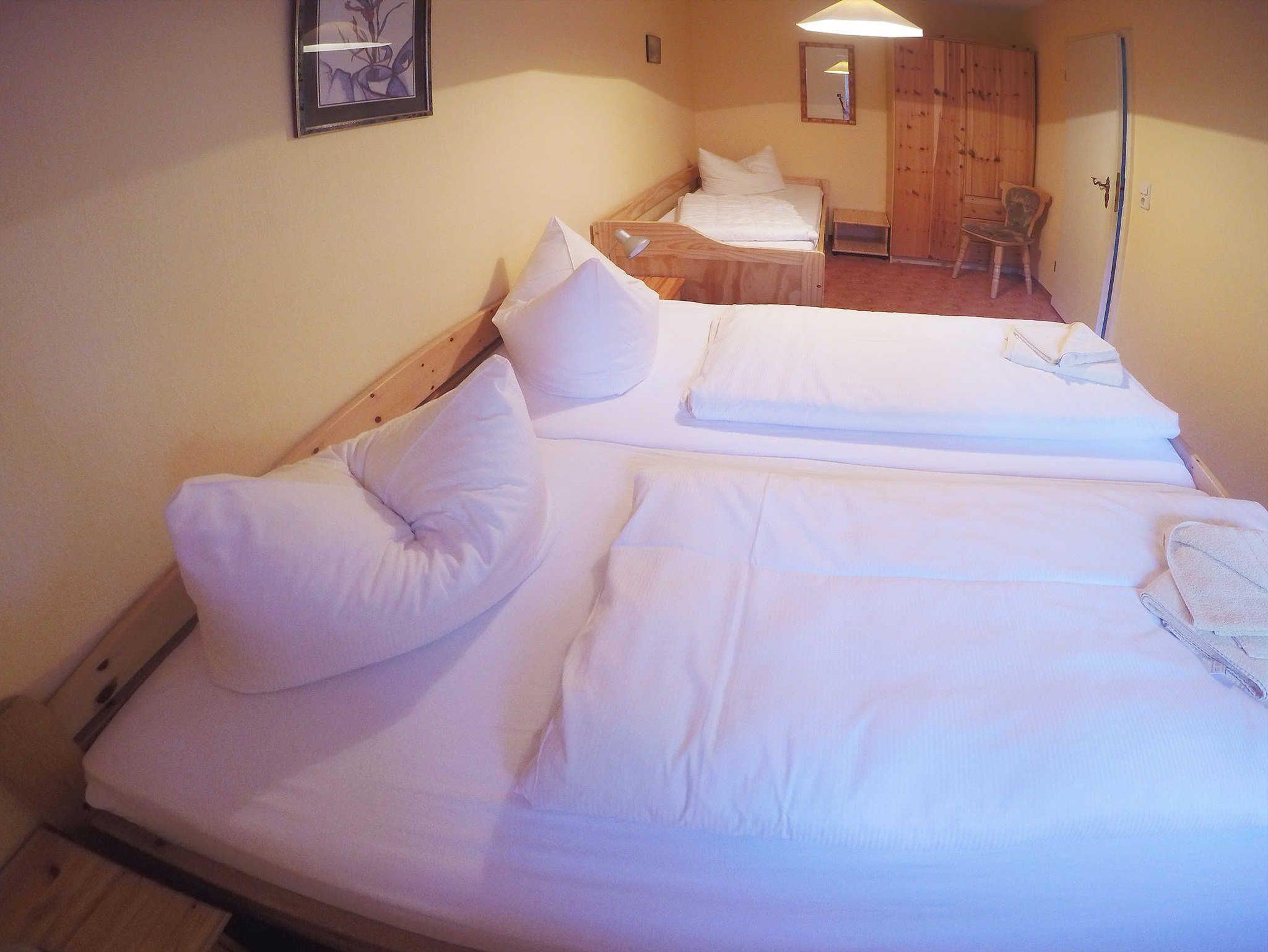 1 Schlafzimmer mit Doppelbett und Einzelbett.