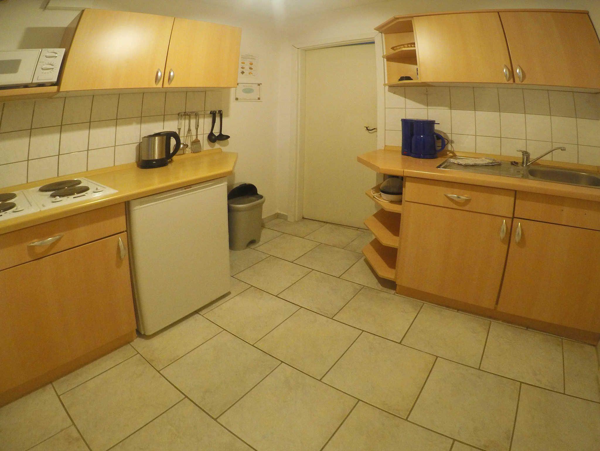 Küche mit 4 Plattenherd, Mikrowelle, Kühlschrank, Kaffeemaschine, Toaster,