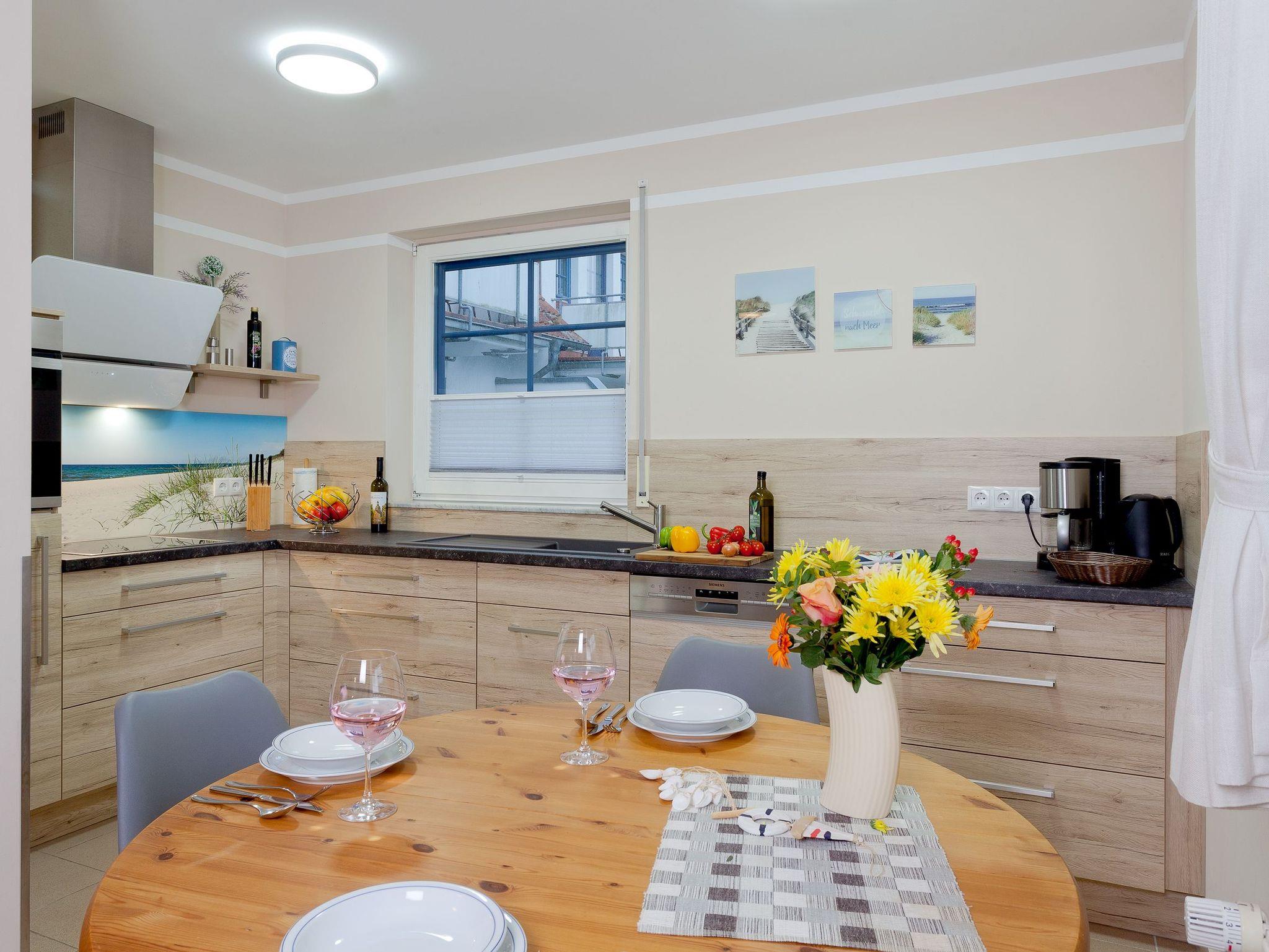 • Küchenzeile: Herd, Backofen, Kühlschrank, mit Tiefkühlfach, Geschirrspülmaschine, Kaffeemaschine, Toaster, Wasserkocher