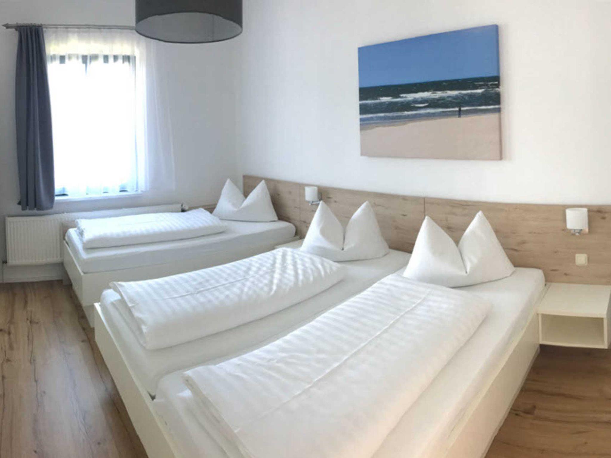 1x zweites Schlafzimmer mit Doppelbett und einem zusätzlichen Einzelbett