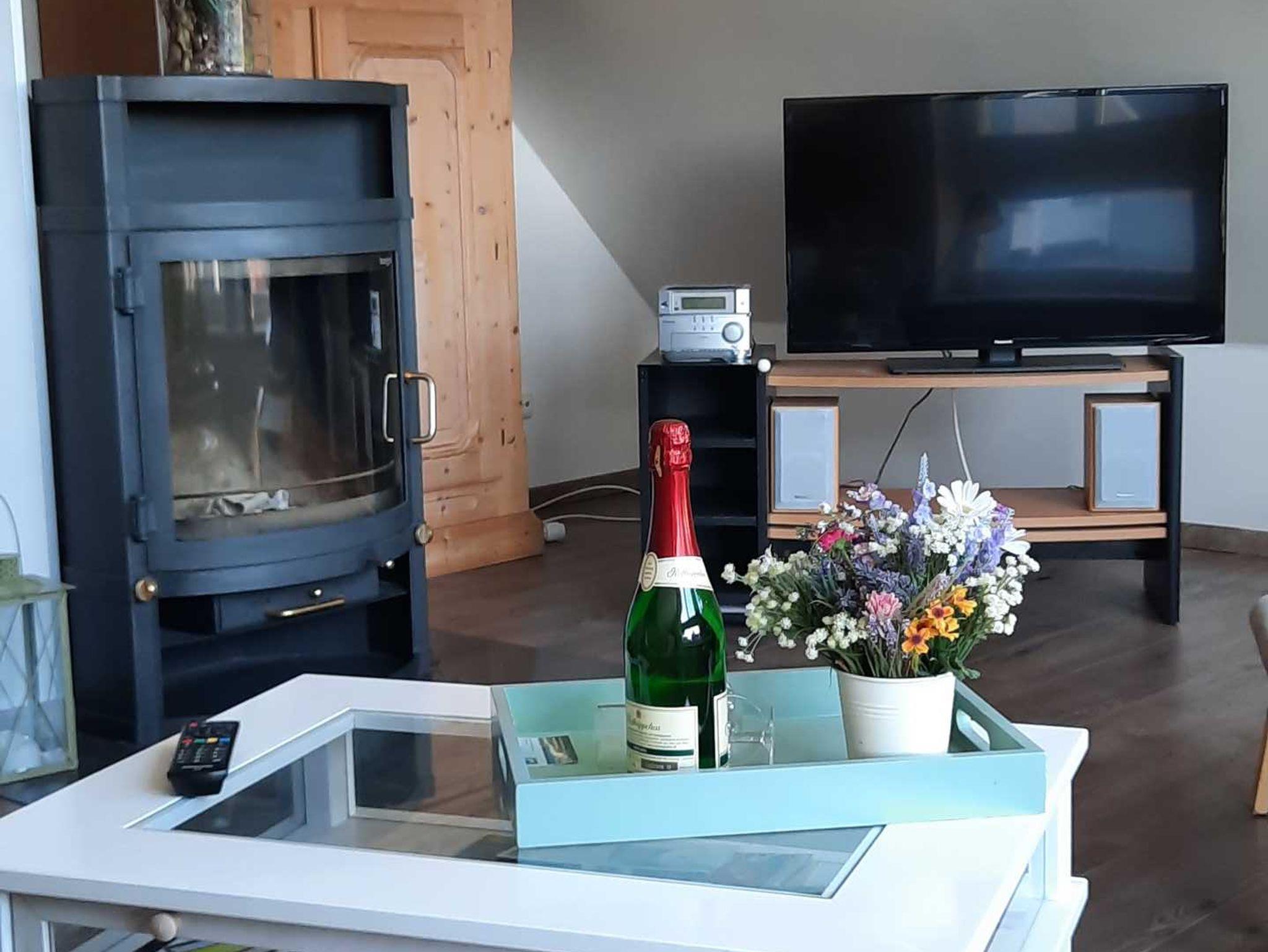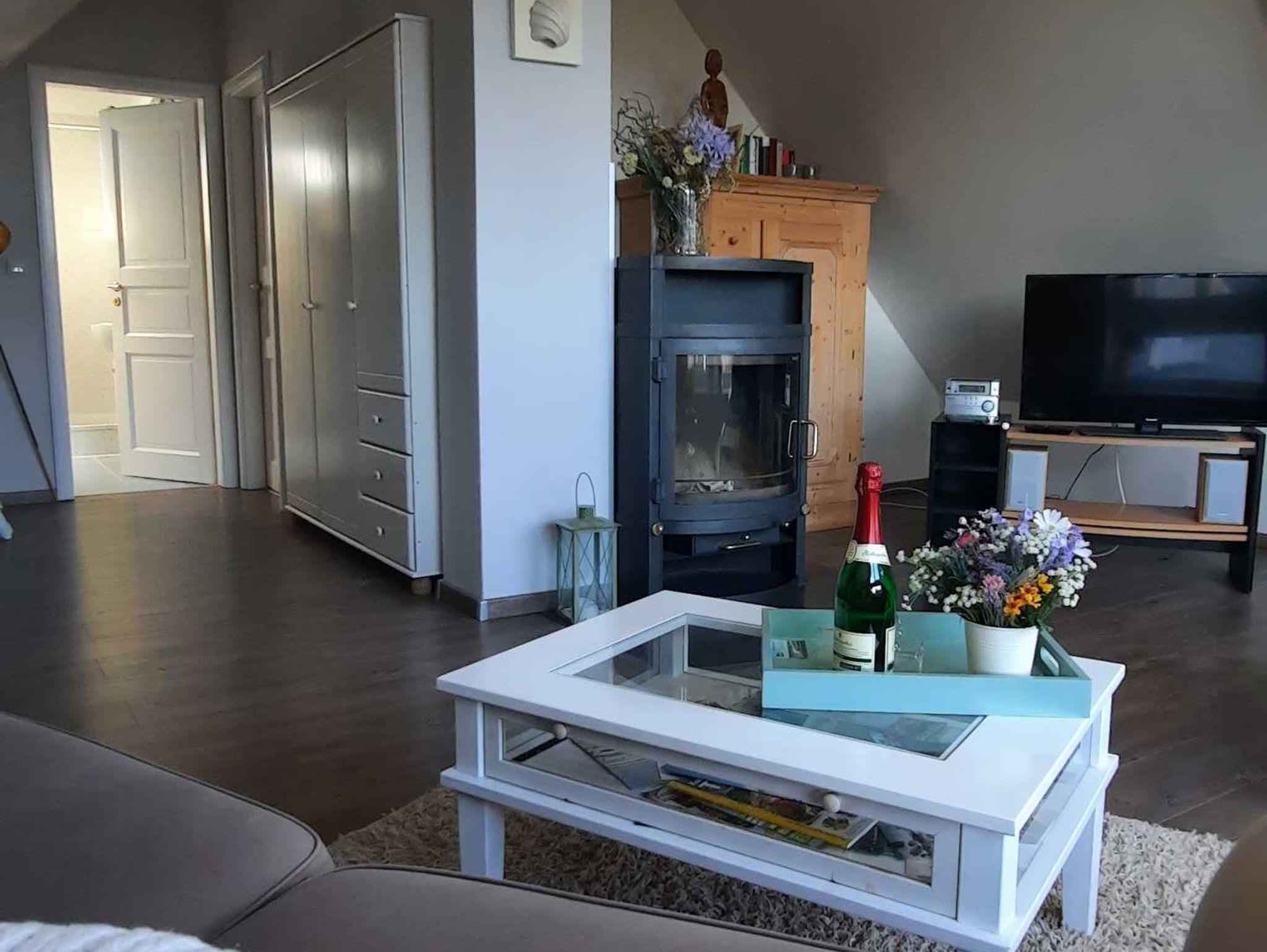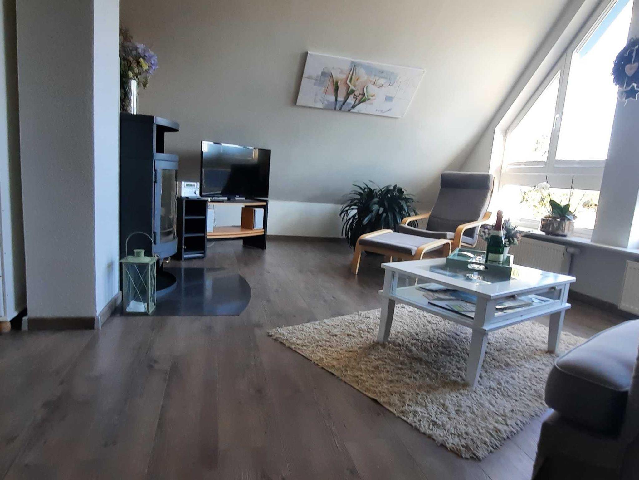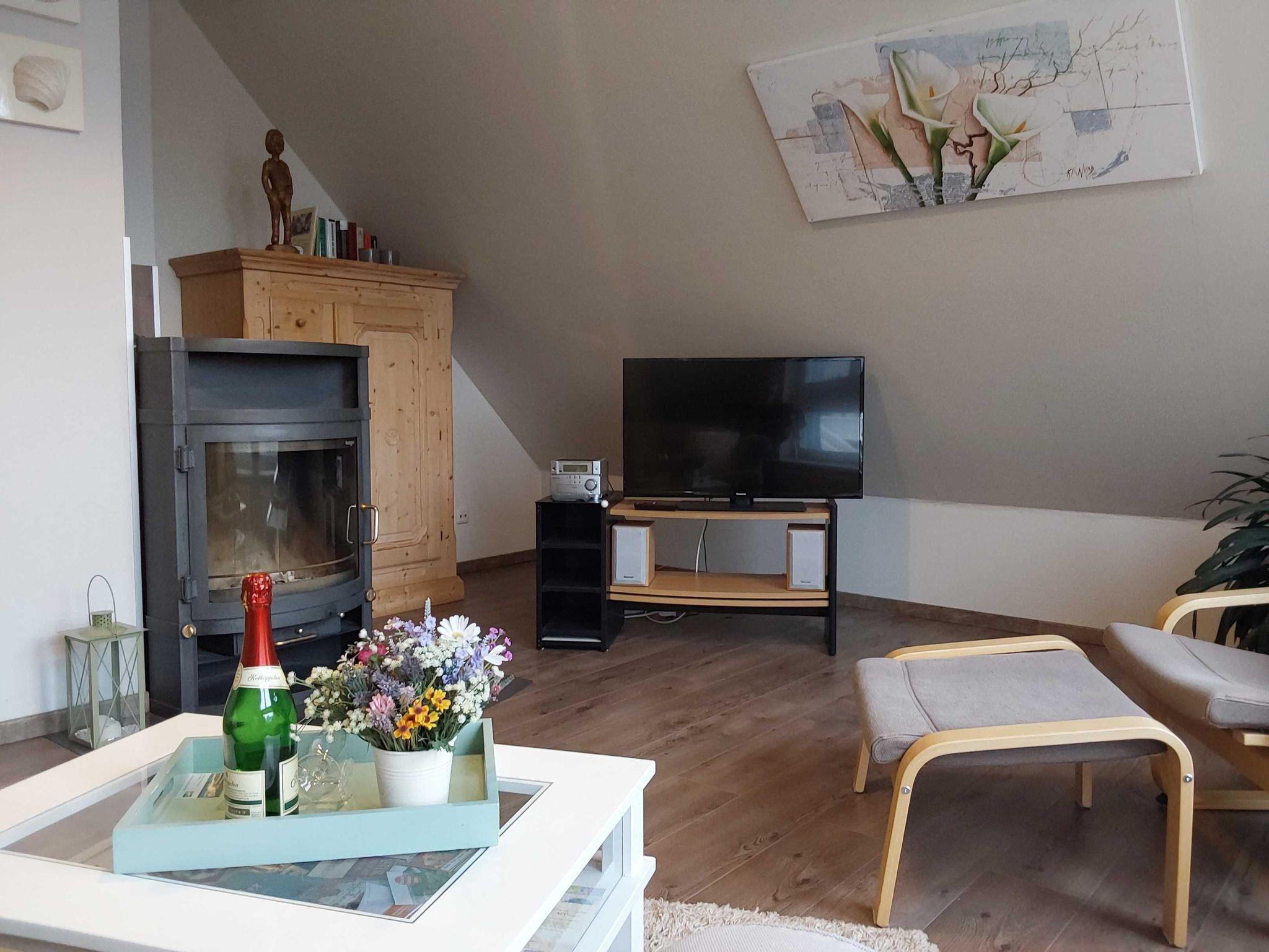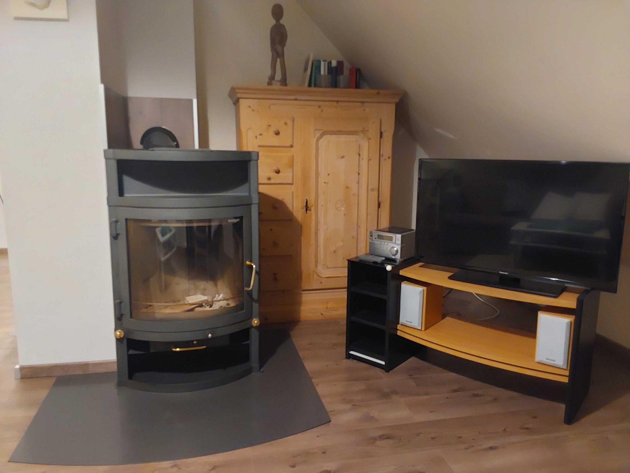 Einen großen hellen Wohnbereich mit einem Kaminofen. Sat-TV, Radio/CD-Anlage,DVD-Player .
