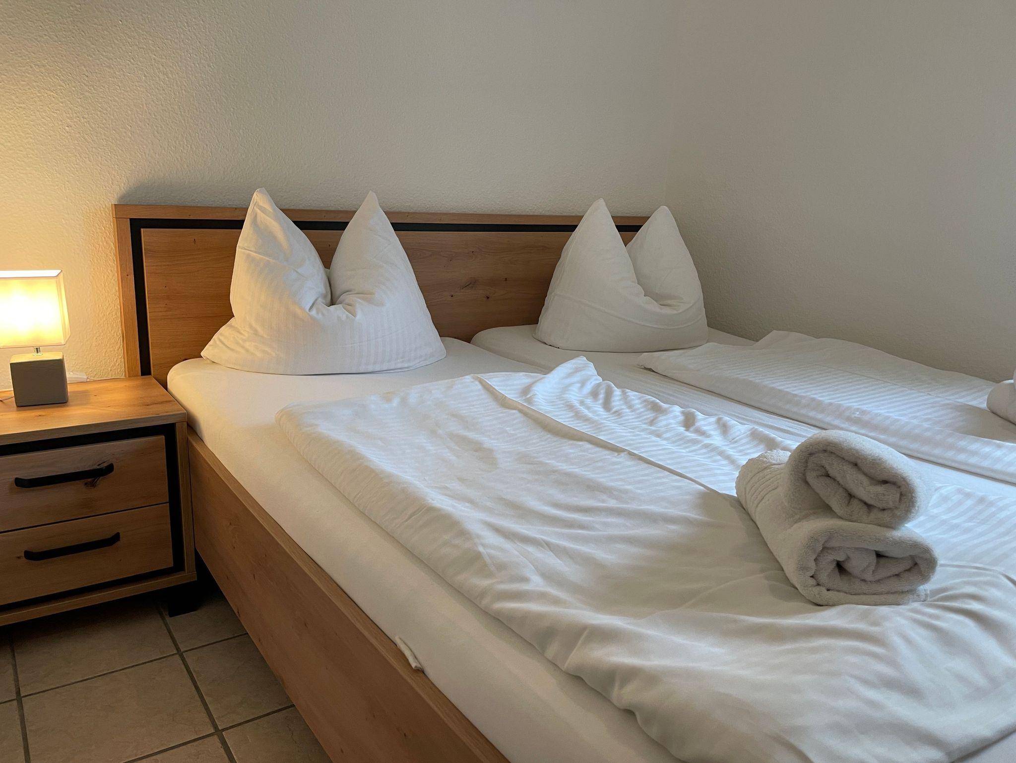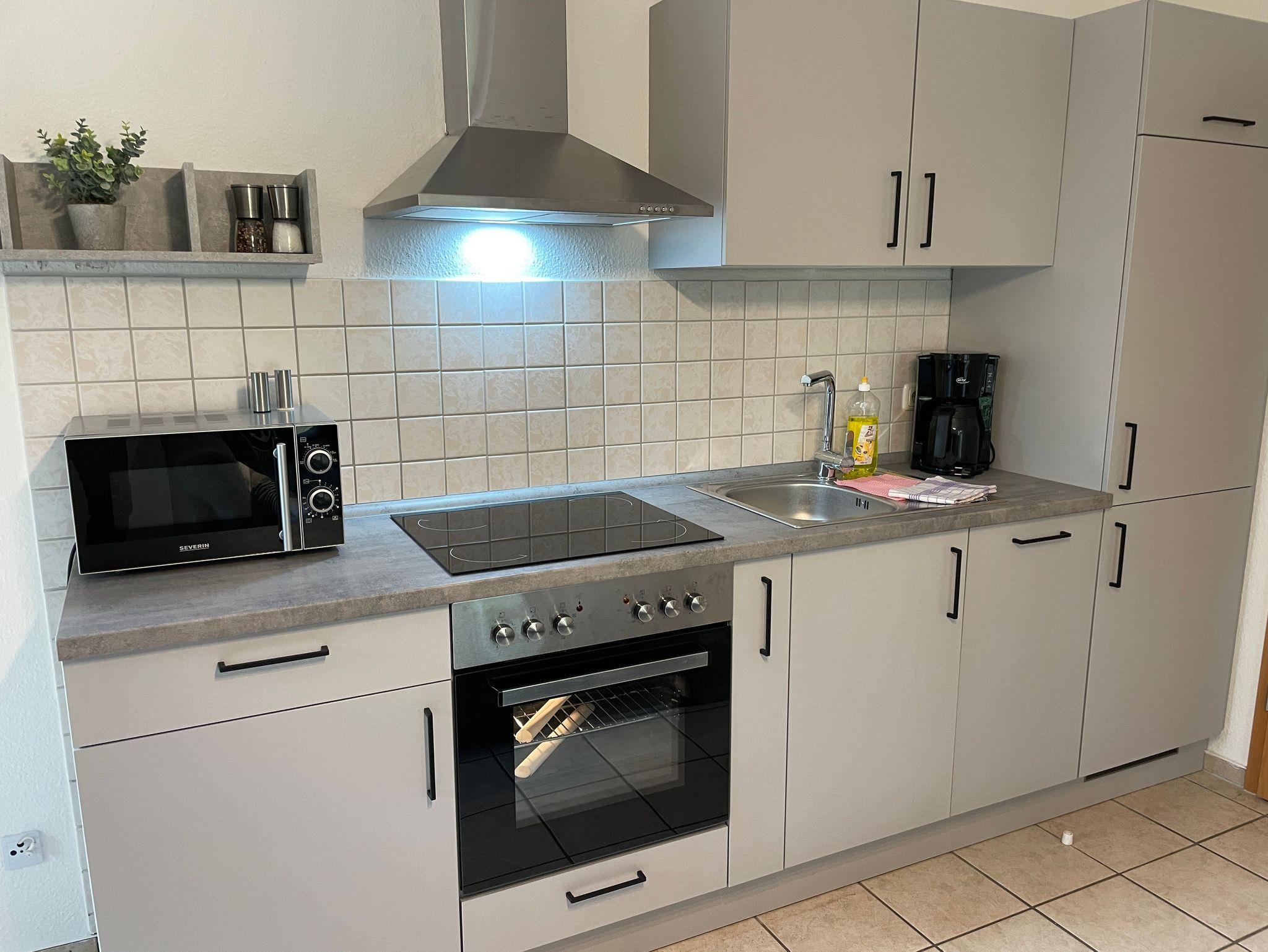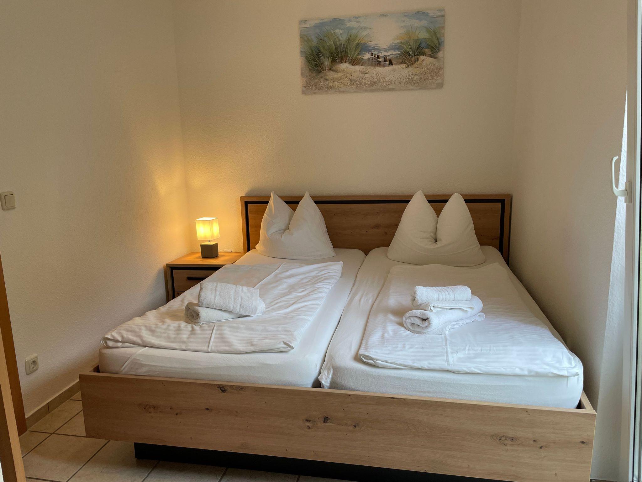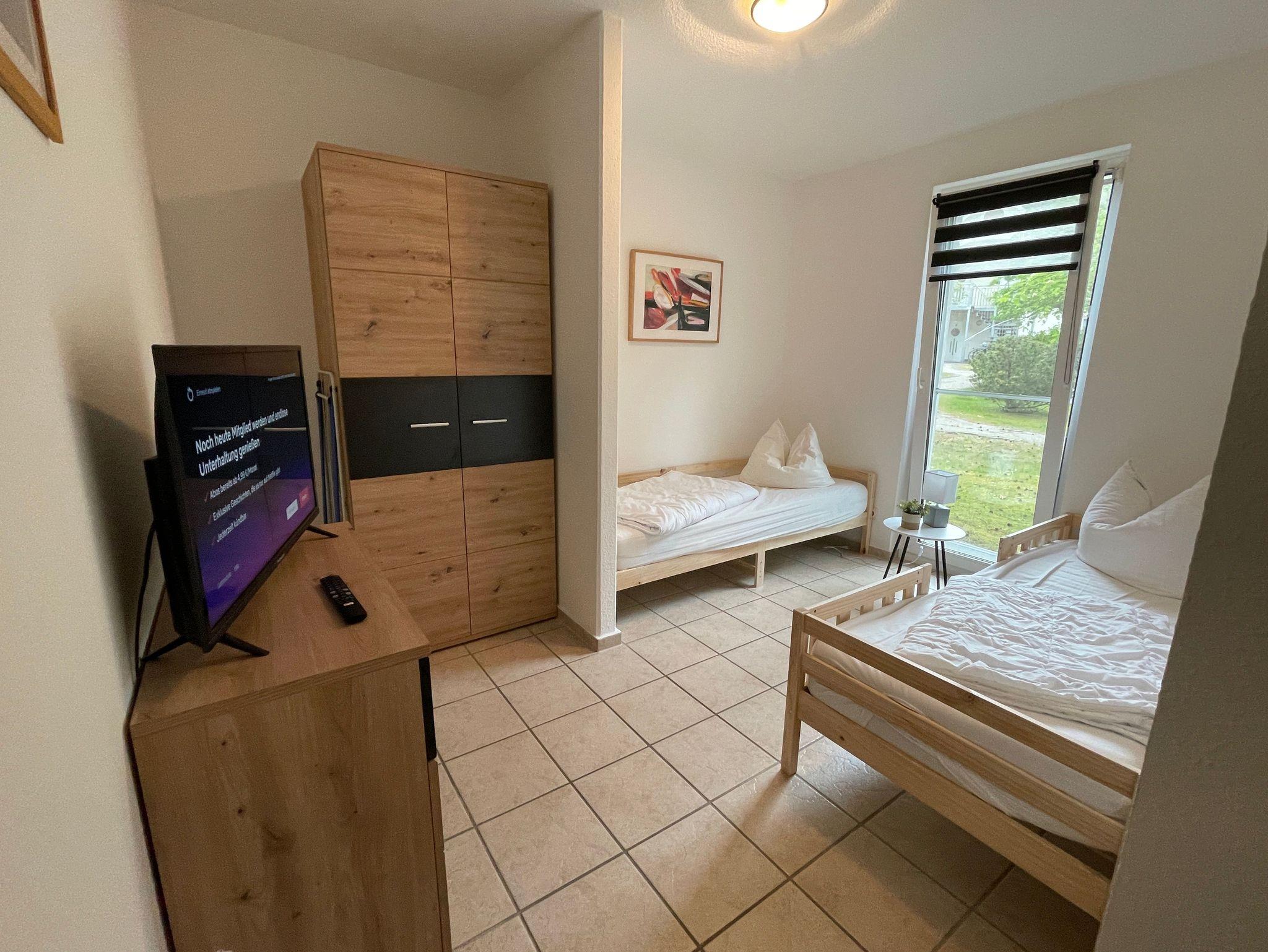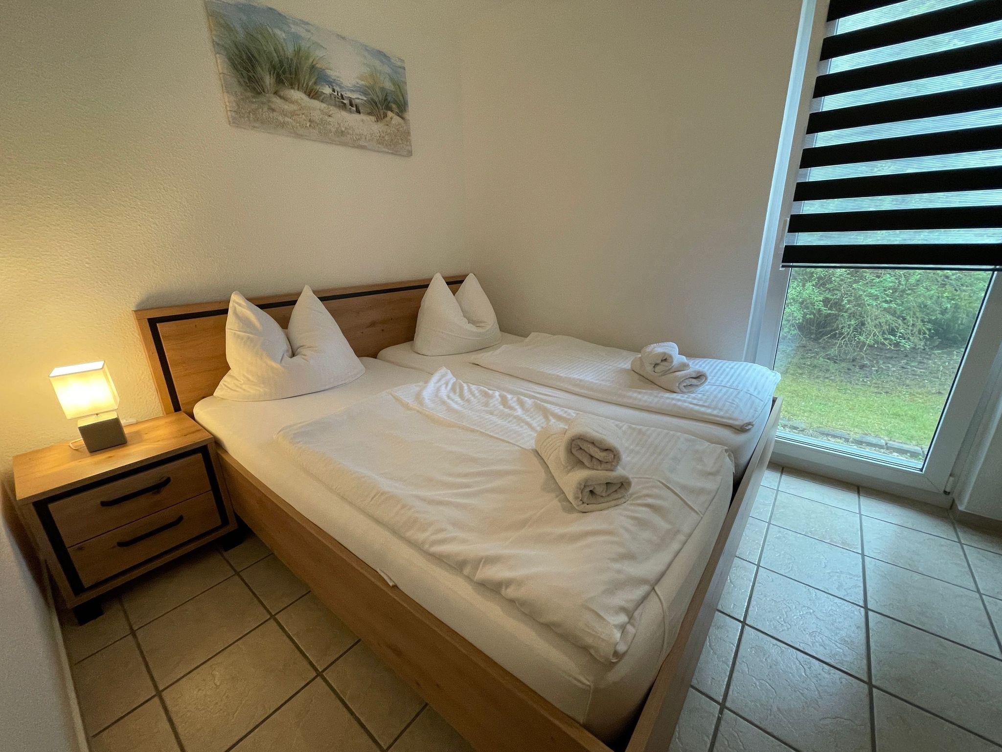 1 Wohnzimmer mit Küche (ausgestattet E-Herd, Geschirrspüler, Mikrowelle, Kühlschrank, Kaffeemaschine,Wasserkocher,Toaster..) 2 Schlafzimmer einmal mit einem 1 Doppelbett 90+90 x 200cm und das 2. Schlafzimmer mit Einzelbetten 100 x 200cm, 1 DU/WC ,Terrasse (mit Gartenmöbeln) PKW-Stellplatz und Fahrradabstellmöglichkeiten vor dem Haus, Wohnung ist für 4+1 Personen (Kind bis 3 Jahre im Kinderbett) geeignet, Kindereisebett und Kinderhochstuhl inklusive