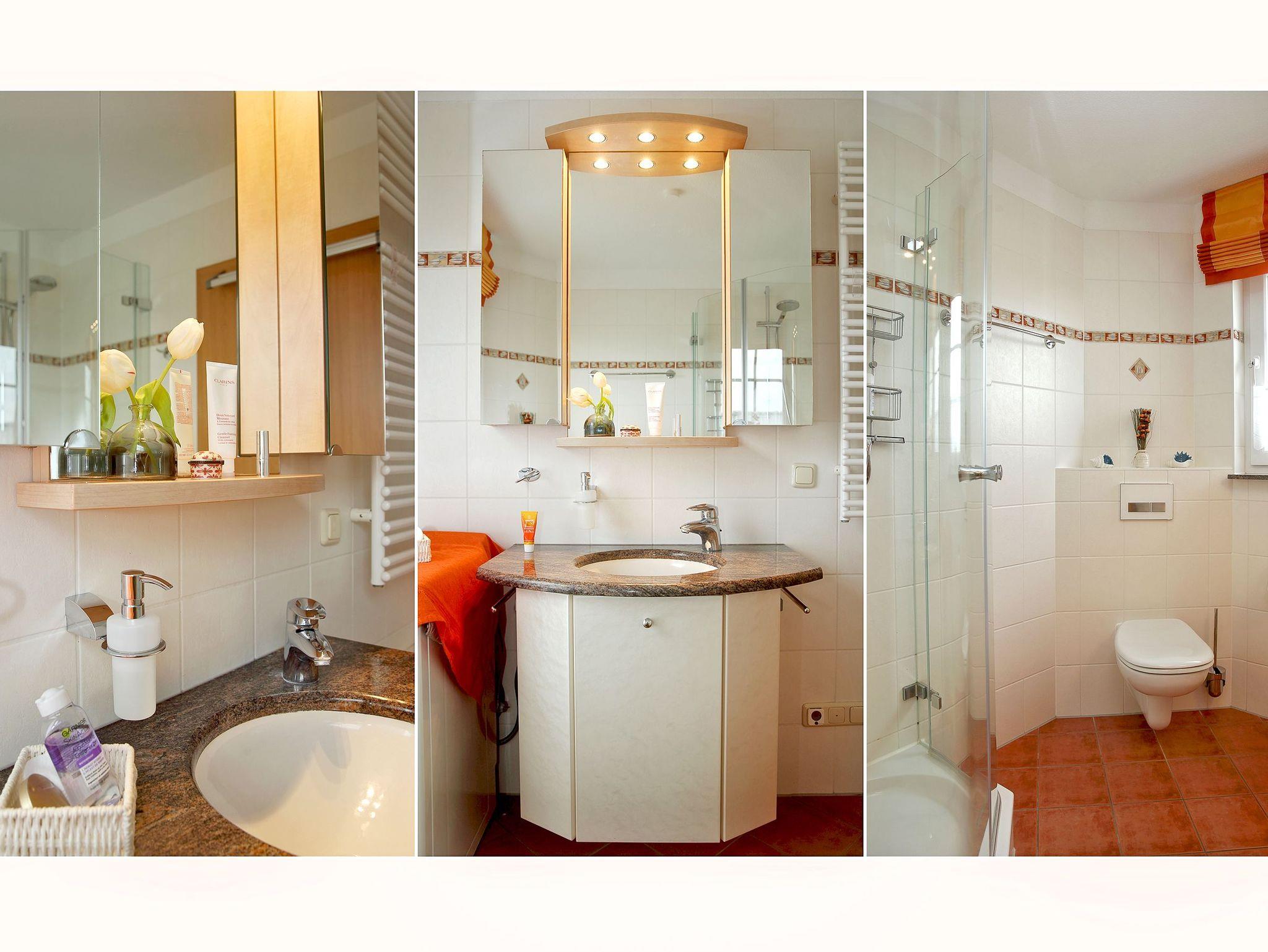 Das Badezimmer ist mit einer Dusche, WC und Fußbodenheizung ausgestattet und beherbergt zusätzlich eine Waschmaschine mit integriertem Trockner.