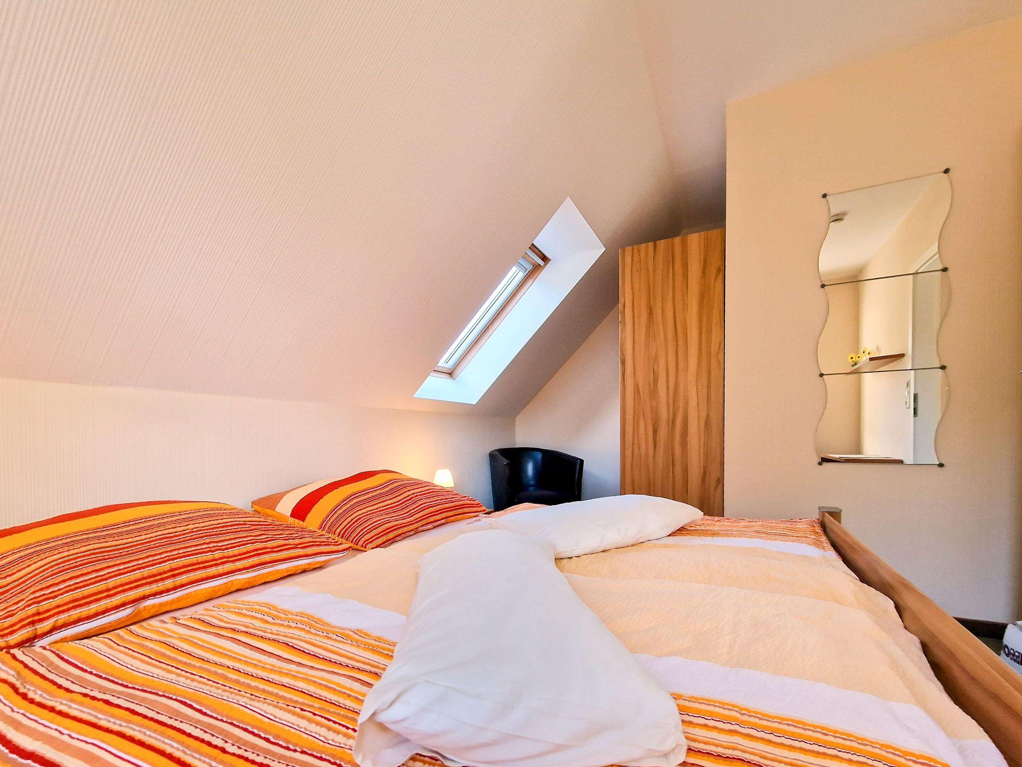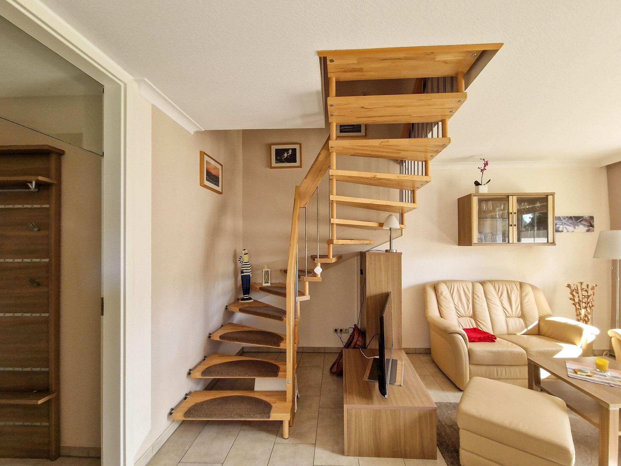 Die liebevoll eingerichteten Ferienwohnungen erstrecken sich über zwei Etagen. Im Erdgeschoss erwartet Sie ein einladender Wohnraum mit einer komplett ausgestatteten Küche sowie einem praktischen Hauswirtschaftsraum, in dem Ihnen auch eine Waschmaschine für kleinere Wäschearbeiten zur Verfügung steht. Zudem finden Sie im Erdgeschoss das Badezimmer mit WC und Dusche.