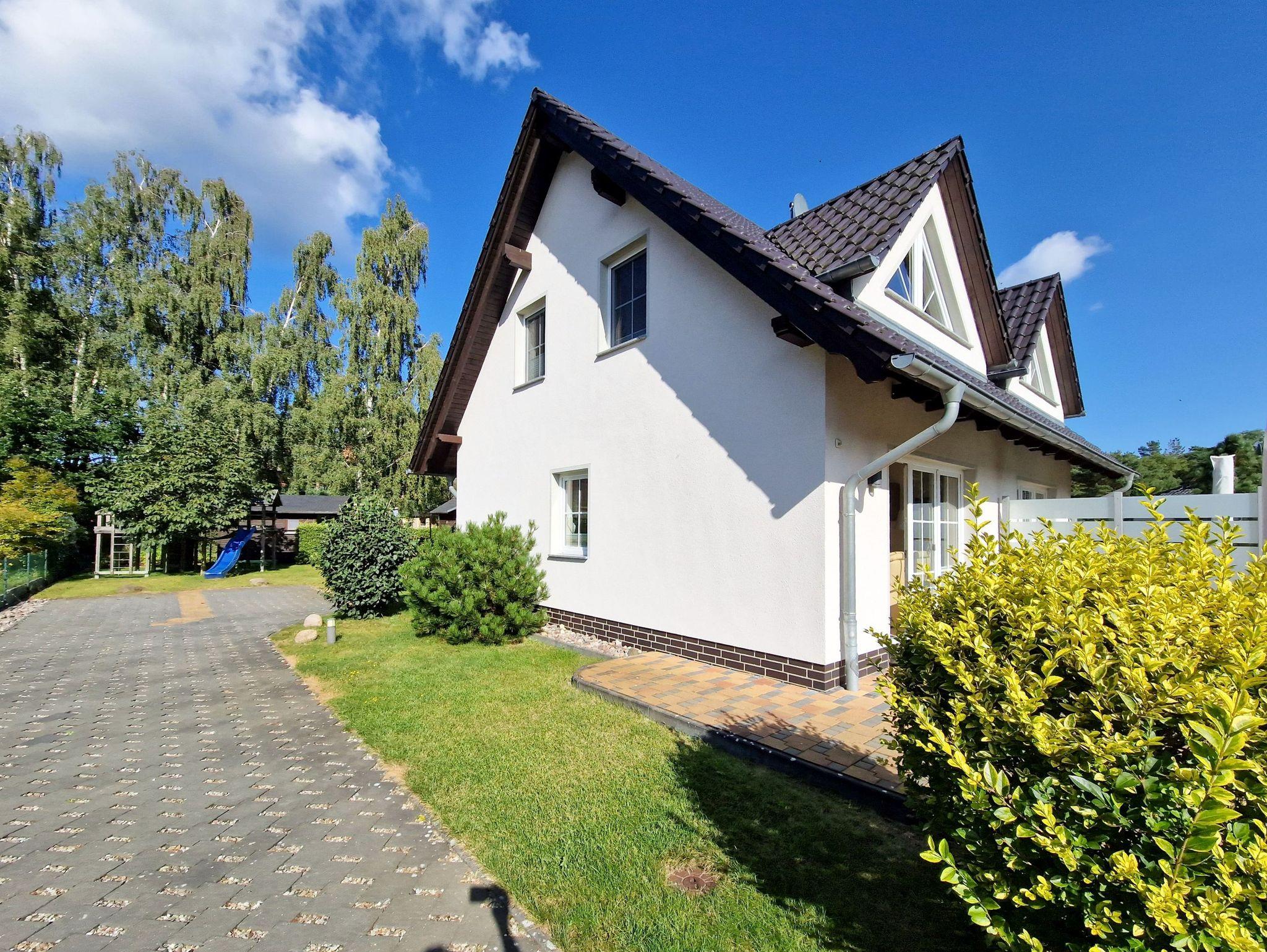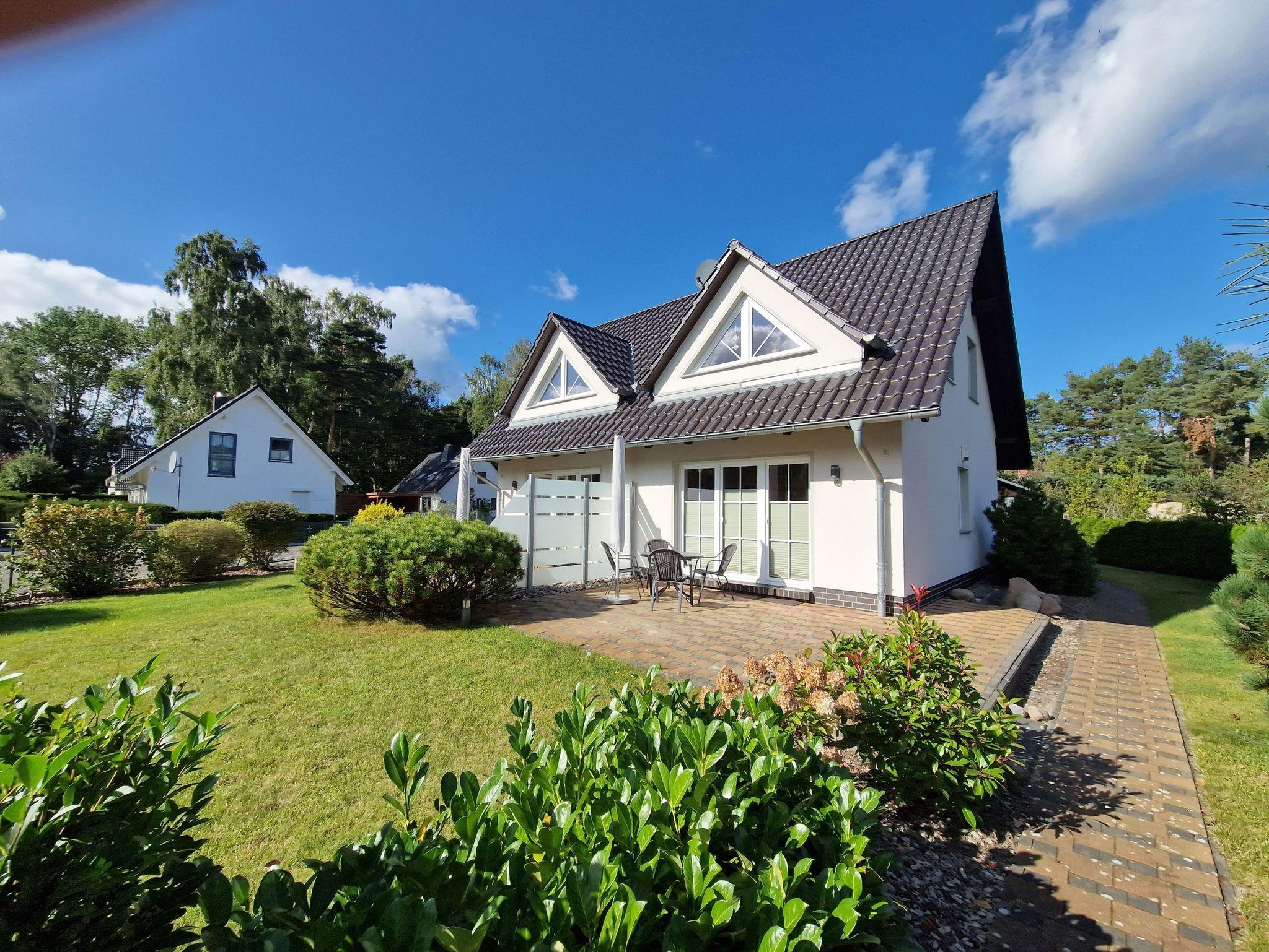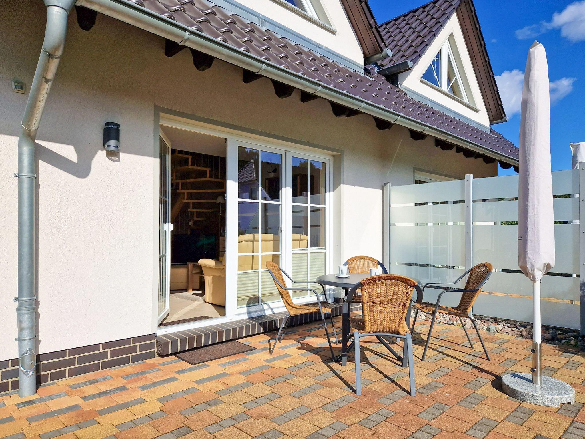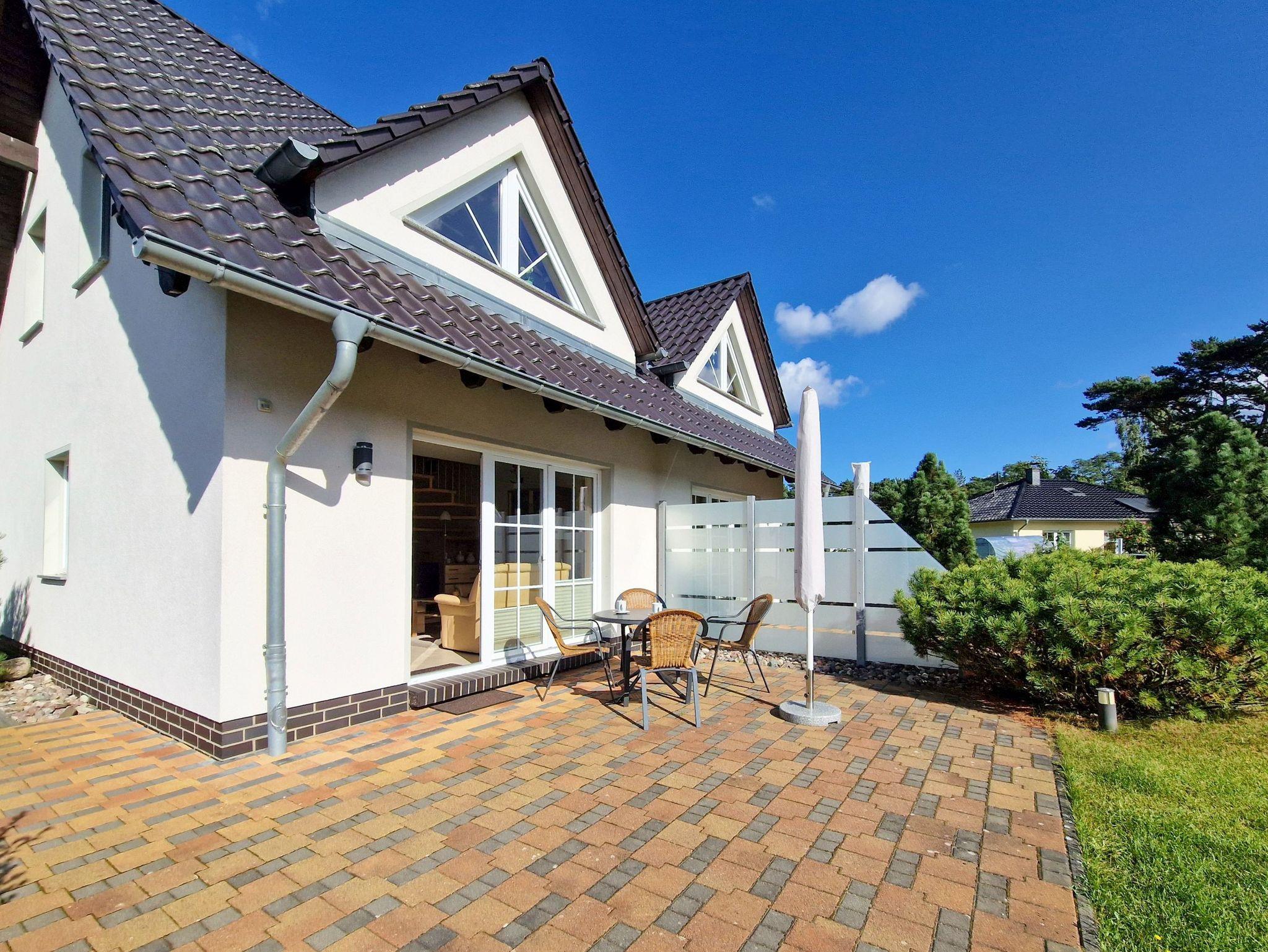Modernes Ferienhaus in Trassenheide mit zwei separaten Wohnungen, Terrasse und Parkplatz, ideal für Familien und Radfahrer.