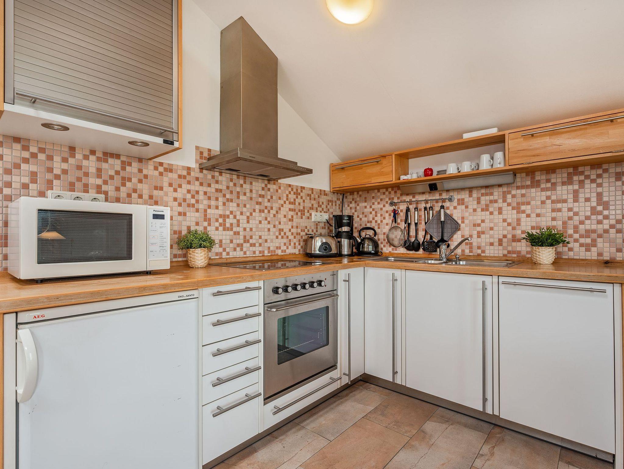 Die angrenzende voll ausgestattete Küche bietet alles, was für einen komfortablen Aufenthalt benötigt wird: Backofen, Mikrowelle, Geschirrspüler, Kühlschrank mit Gefrierfach, Kaffeemaschine und ein großer Esstisch.