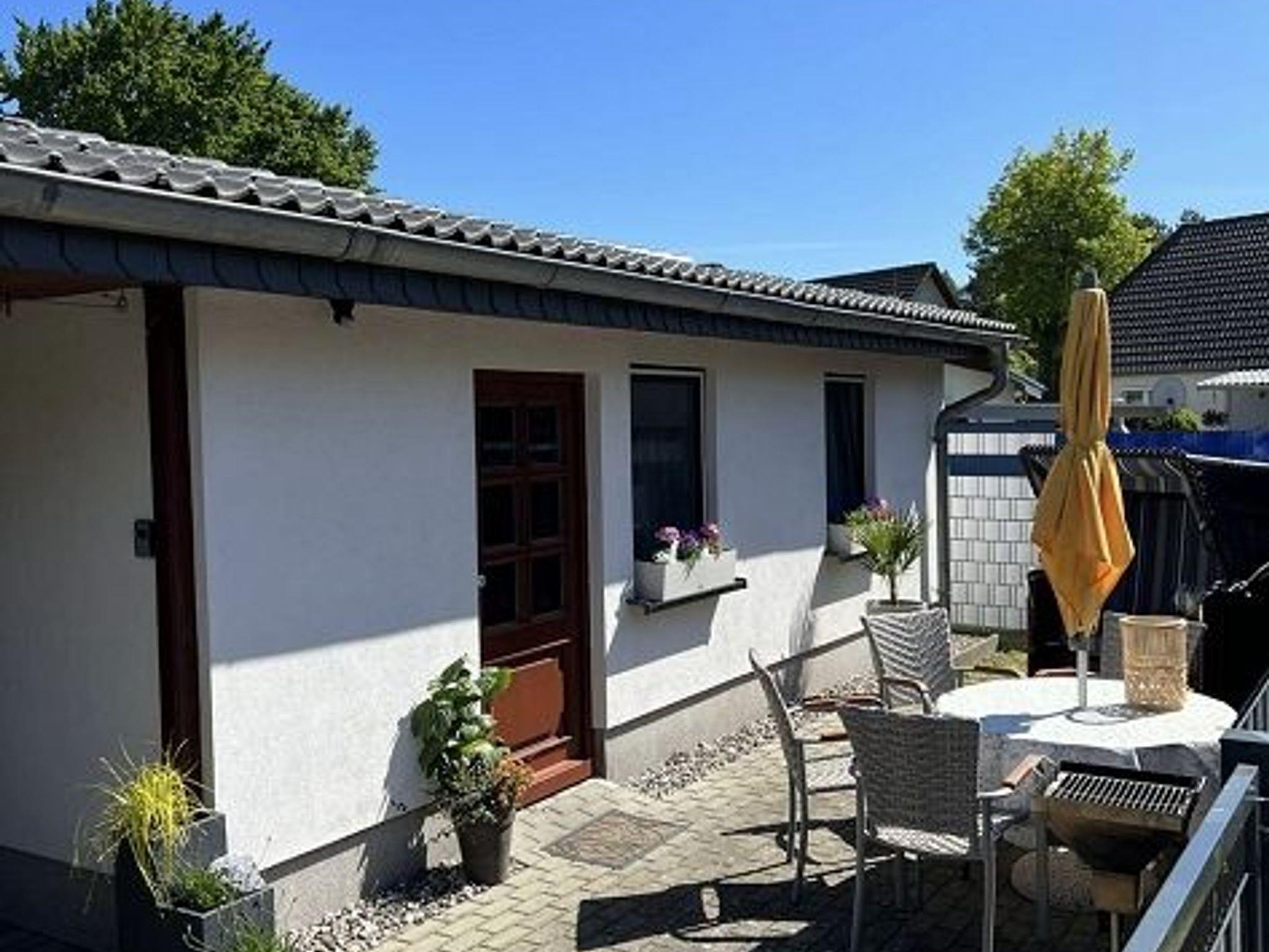 Gemütlicher Ferienbungalow mit Terrasse, Strandkorb und Carport in ruhiger Lage nahe dem Strand.
