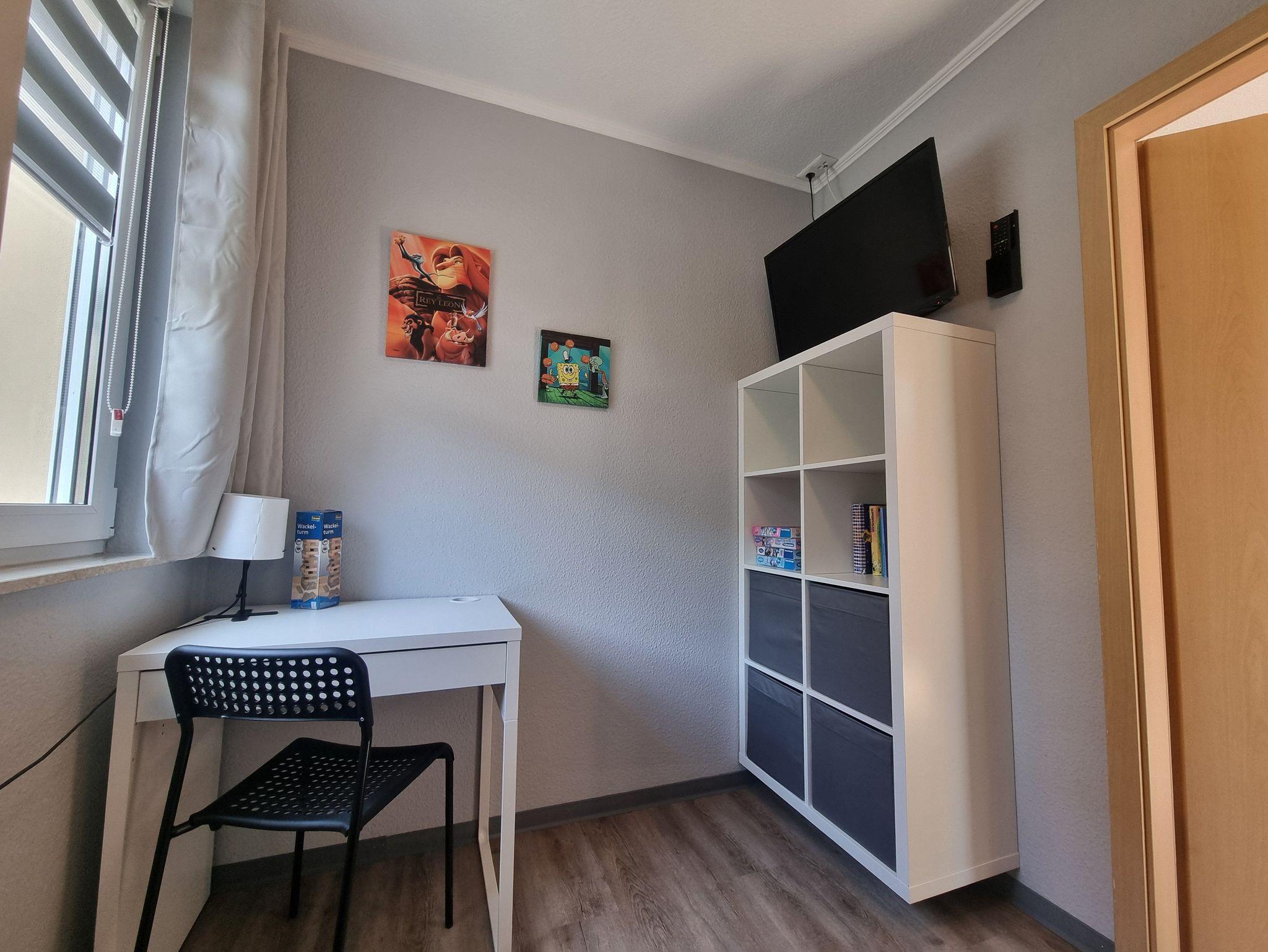Die Ferienwohnung verfügt über 2 Schlafräume (1x Doppelbett, 1x 1 Doppelstockbett und zus. TV), einer voll ausgestatteten Küche mit Backofen, Kühlschrank mit Gefrierfach, Wasserkocher, Toaster und Kaffeemaschine. Der Wohn- und Essbereich verfügt über einen Flat-TV und einen Kamin für gemütliche Stunden. Das Badezimmer ist mit Dusche/WC, Waschmaschine und Fön ausgestattet. Die Fußböden sind teilweise mit Teppich im Wohn- und Schlafbereich, mit Linoleum im Küchen- und Essbereich und mit Fliesen im Bad ausgelegt. Die Wohnung hat eine separate Sitzmöglichkeit im Außenbereich. Ein PKW-Stellplatz und WLAN stehen Ihnen kostenfrei zur Verfügung.