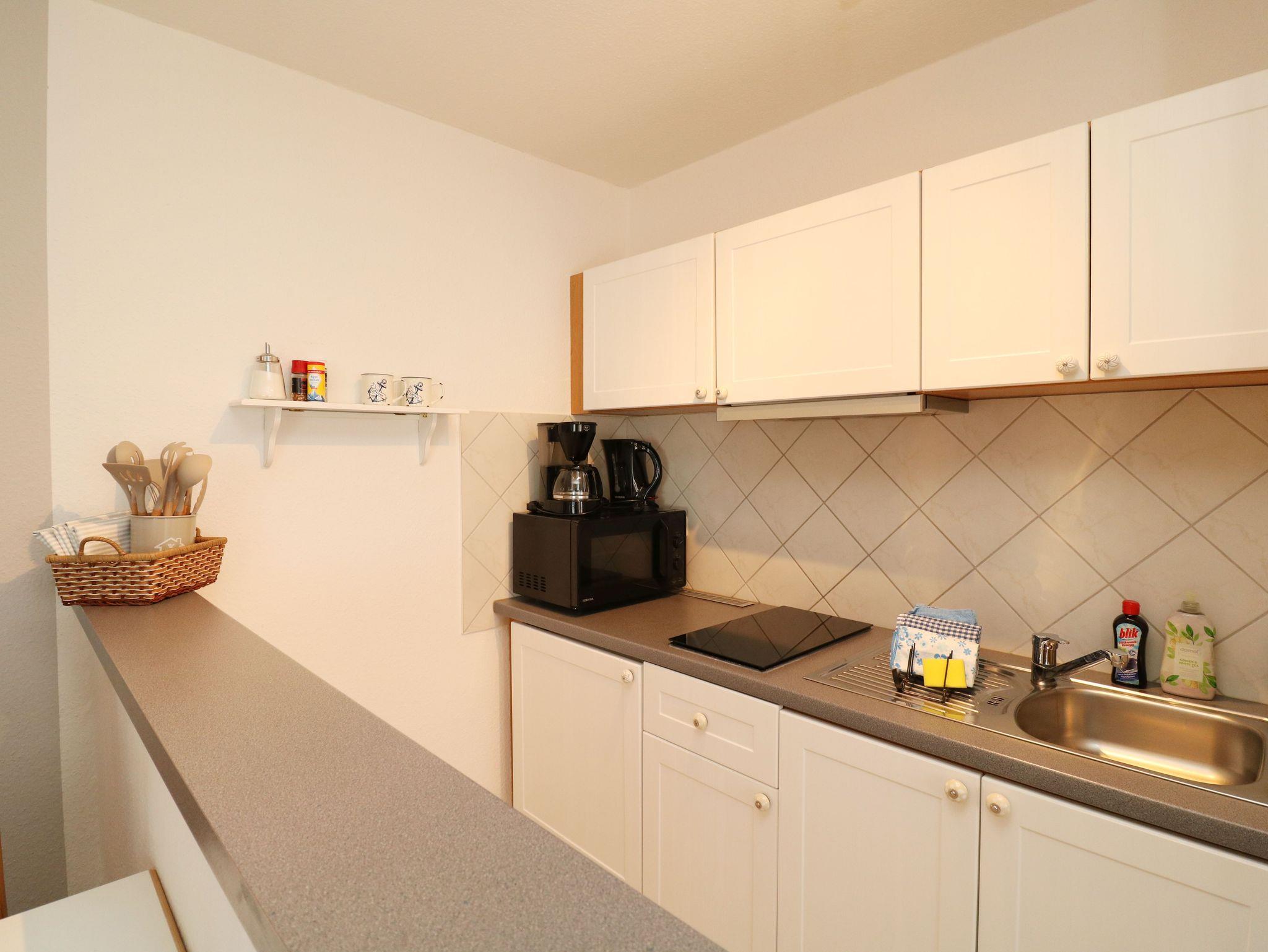 wie ein Cerankochfeld, ein Kühlschrank und einer kompletten Küchenausstattung. Dazu gehören auch Kaffeemaschine, Wasserkocher und Toaster.