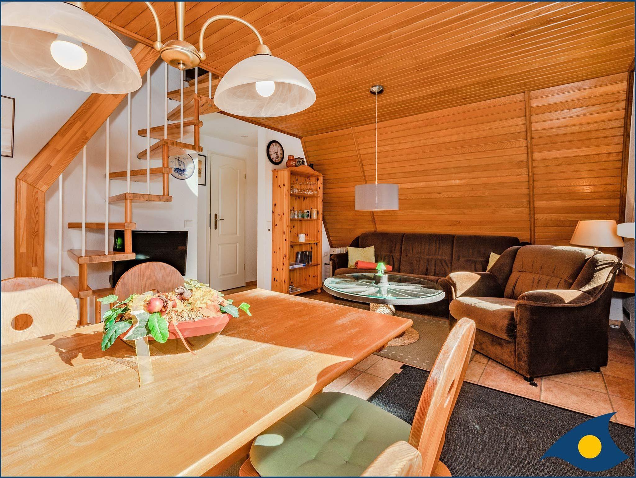 Das große Wohnzimmer im Erdgeschoss mit Ess- und Sitzecke, SAT-TV, DVD-Player, Radio mit CD und einer Garderobe mit Safe ist der Mittelpunkt des Appartements. Eine neu installierte Fußbodenheizung sorgt für wohlige Wärme auch an kühleren Tagen.