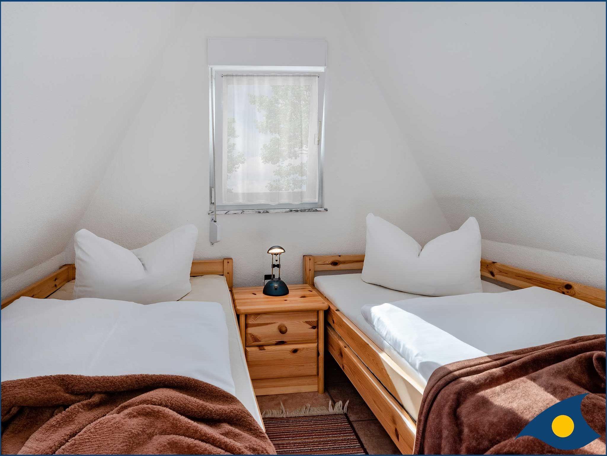 Die zwei kuscheligen Schlafzimmer mit Dachschrägen und je 2 Einzelbetten in der oberen Etage sorgen für erholsamen Schlaf. Diese erreichen Sie über eine schmale Sambatreppe. Außenjalousien im gesamten Haus lassen Sie ausschlafen, während die Sonne den Tag begrüßt und sorgen für angenehme Kühle an heißen Tagen.