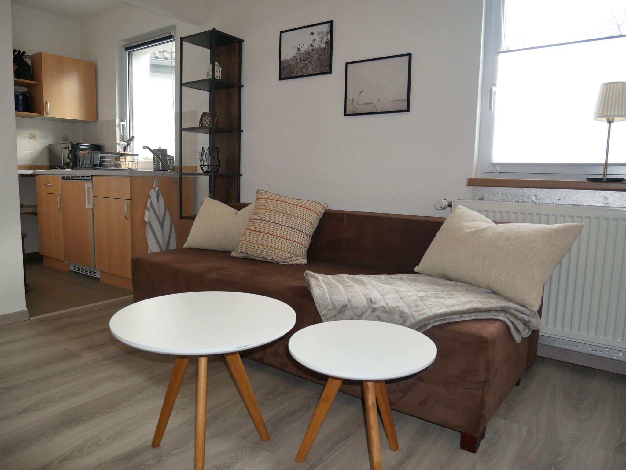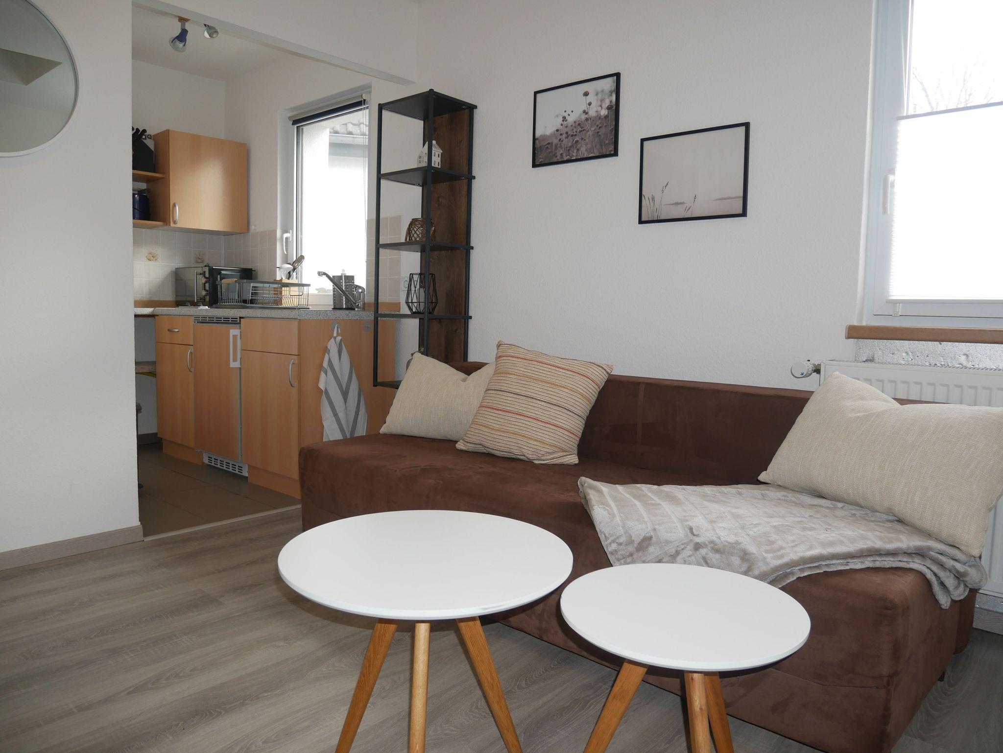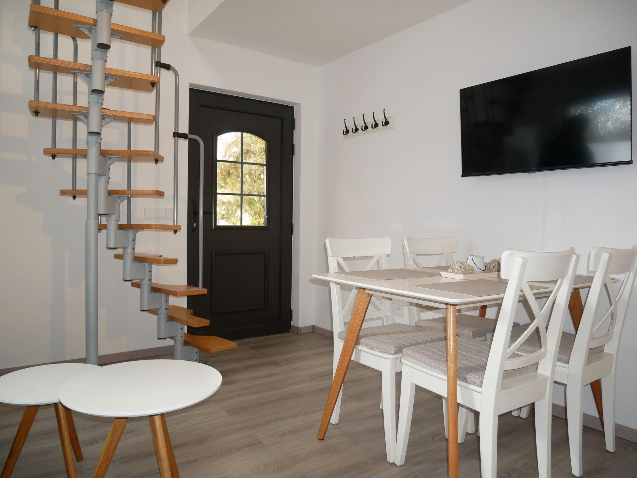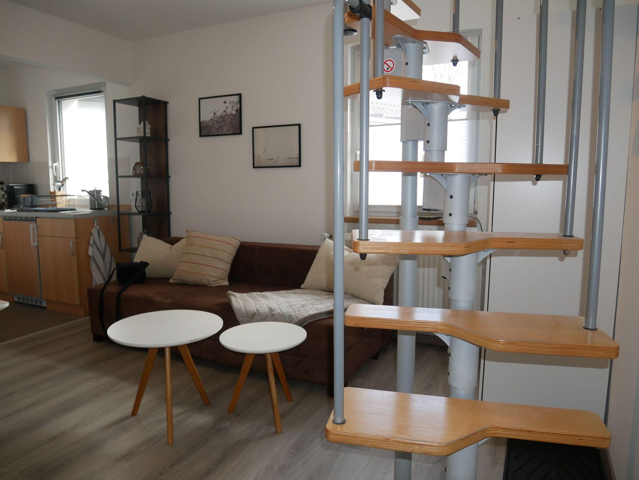 Die ruhig gelegene 35 m² große Ferienwohnung erstreckt sich über zwei Ebenen. Im Erdgeschoss lädt der offene Wohnraum mit Esstisch, Stühlen und Smart-TV zum Verweilen ein. Das Schlafsofa bietet eine bequeme Aufbettung für die 3. und 4. Person (Liegefläche 1,40 x 1,90 m). Angrenzend befindet sich eine offene Pantryküche mit 2-Platten-Herd, Kühlschrank inklusive Gefrierfach, Mikrowelle, Wasserkocher, Toaster und Kaffeemaschine.