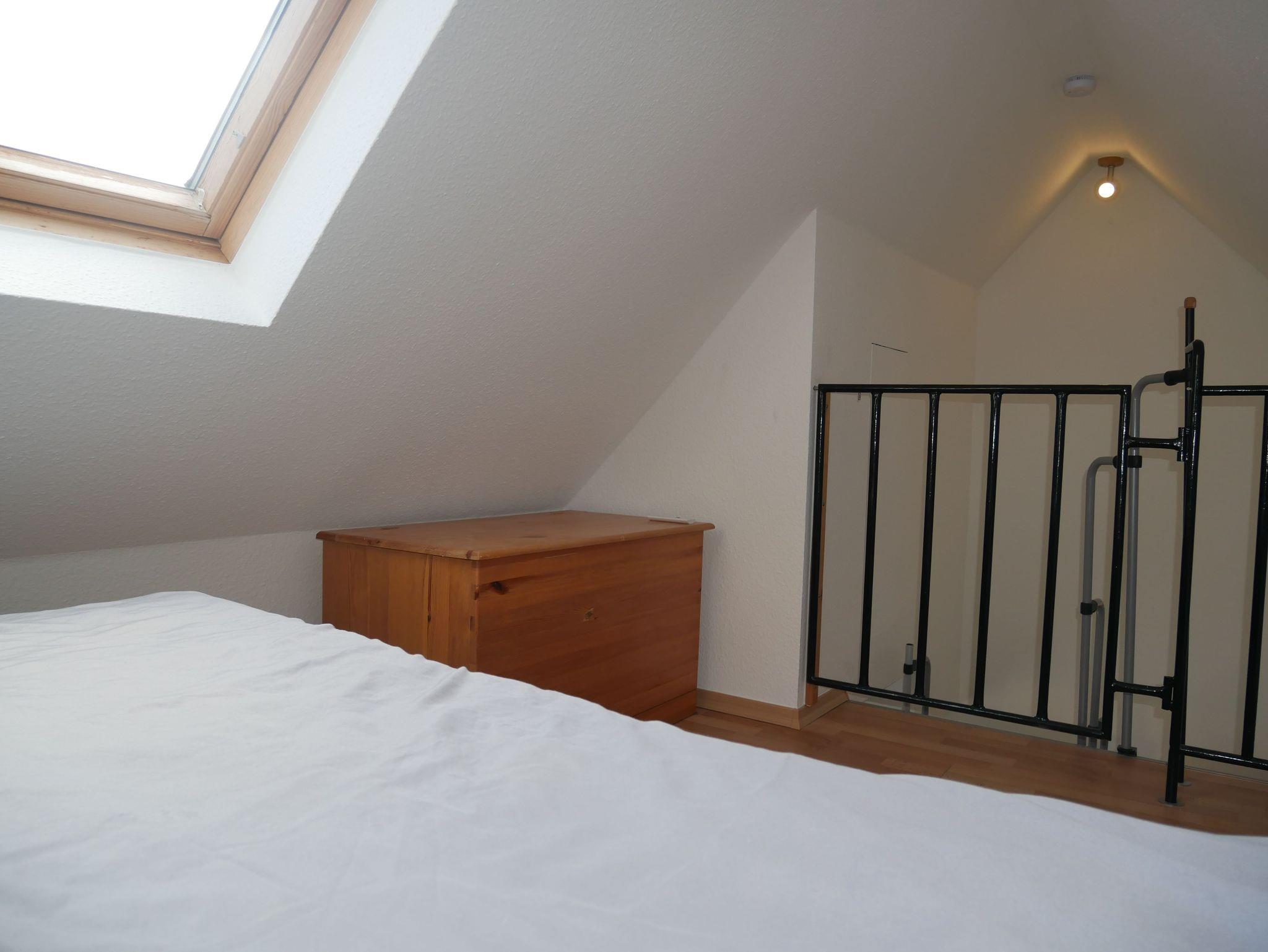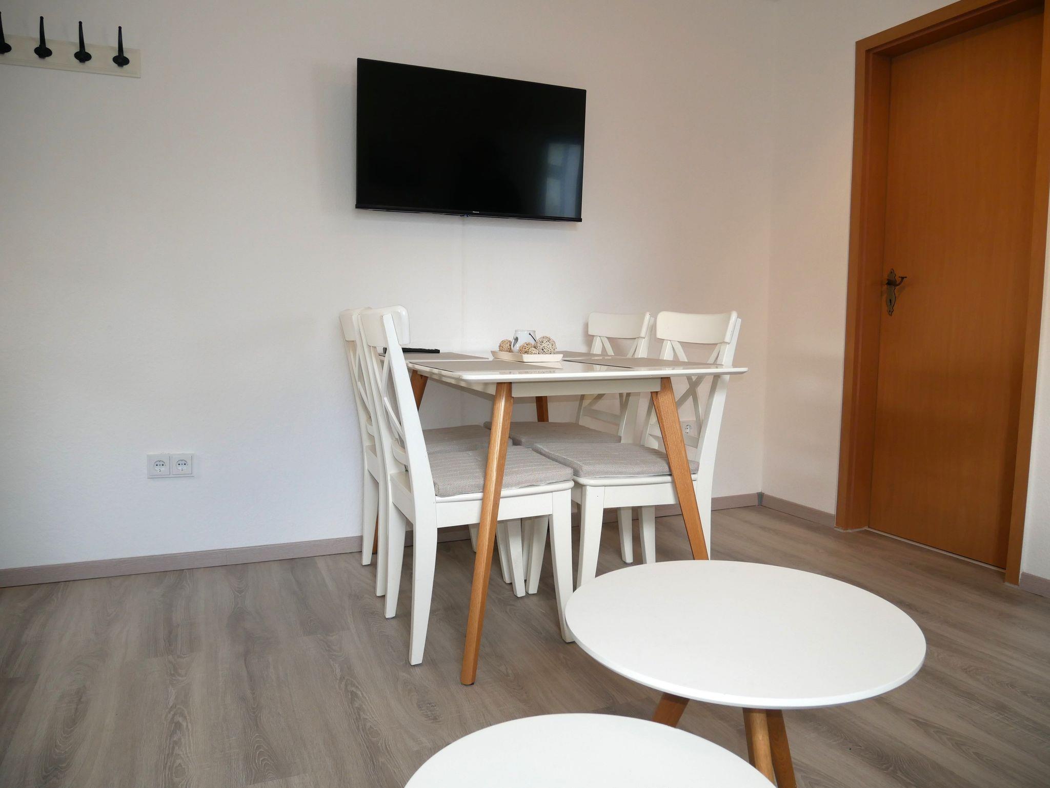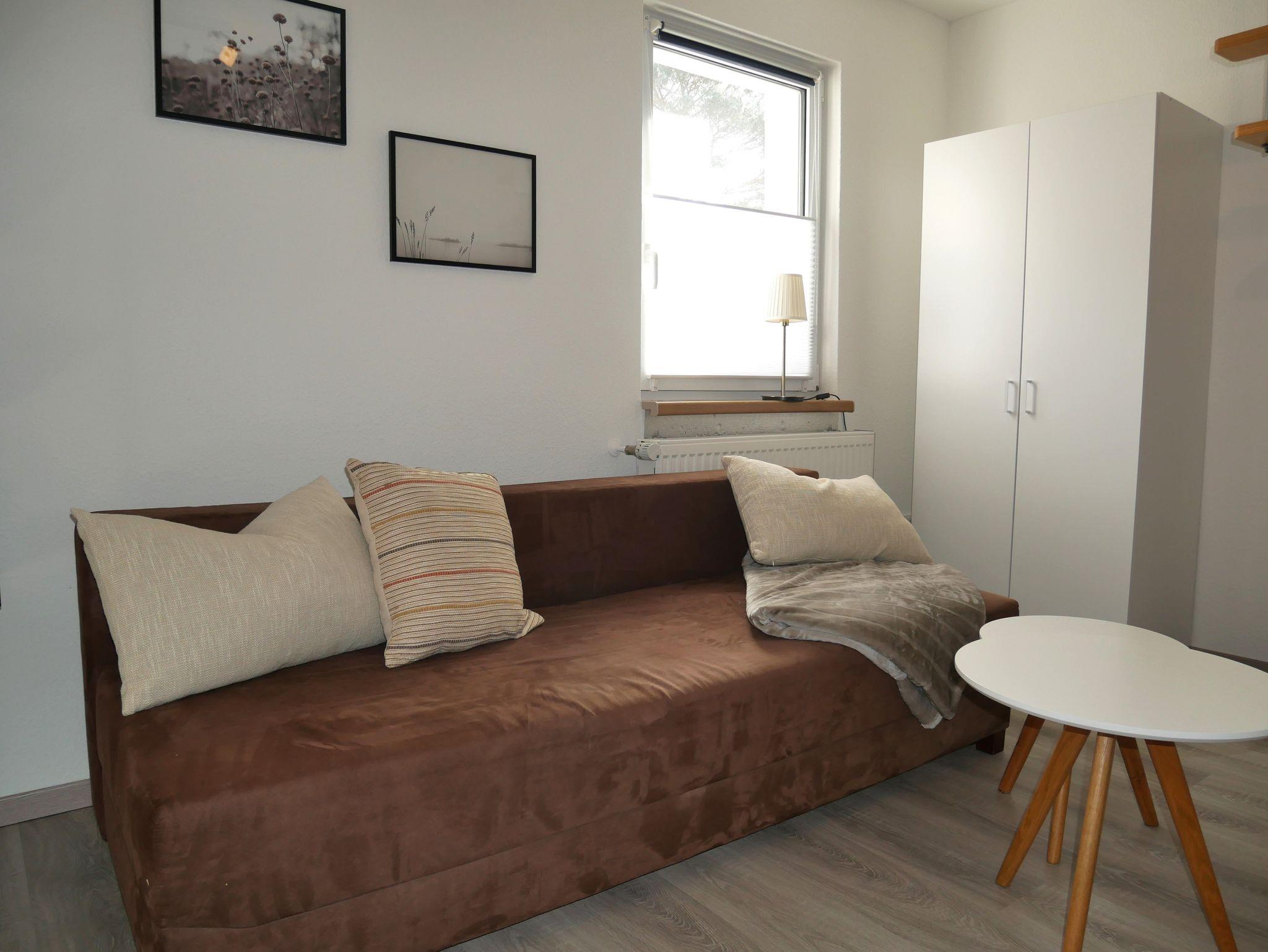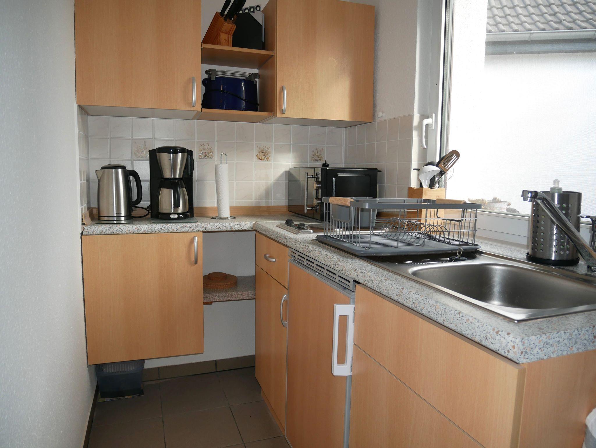 Die ruhig gelegene 35 m² große Ferienwohnung erstreckt sich über zwei Ebenen. Im Erdgeschoss lädt der offene Wohnraum mit Esstisch, Stühlen und Smart-TV zum Verweilen ein. Das Schlafsofa bietet eine bequeme Aufbettung für die 3. und 4. Person (Liegefläche 1,40 x 1,90 m). Angrenzend befindet sich eine offene Pantryküche mit 2-Platten-Herd, Kühlschrank inklusive Gefrierfach, Mikrowelle, Wasserkocher, Toaster und Kaffeemaschine.