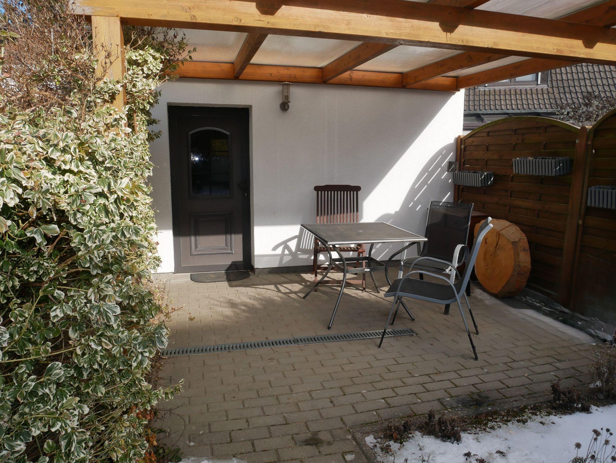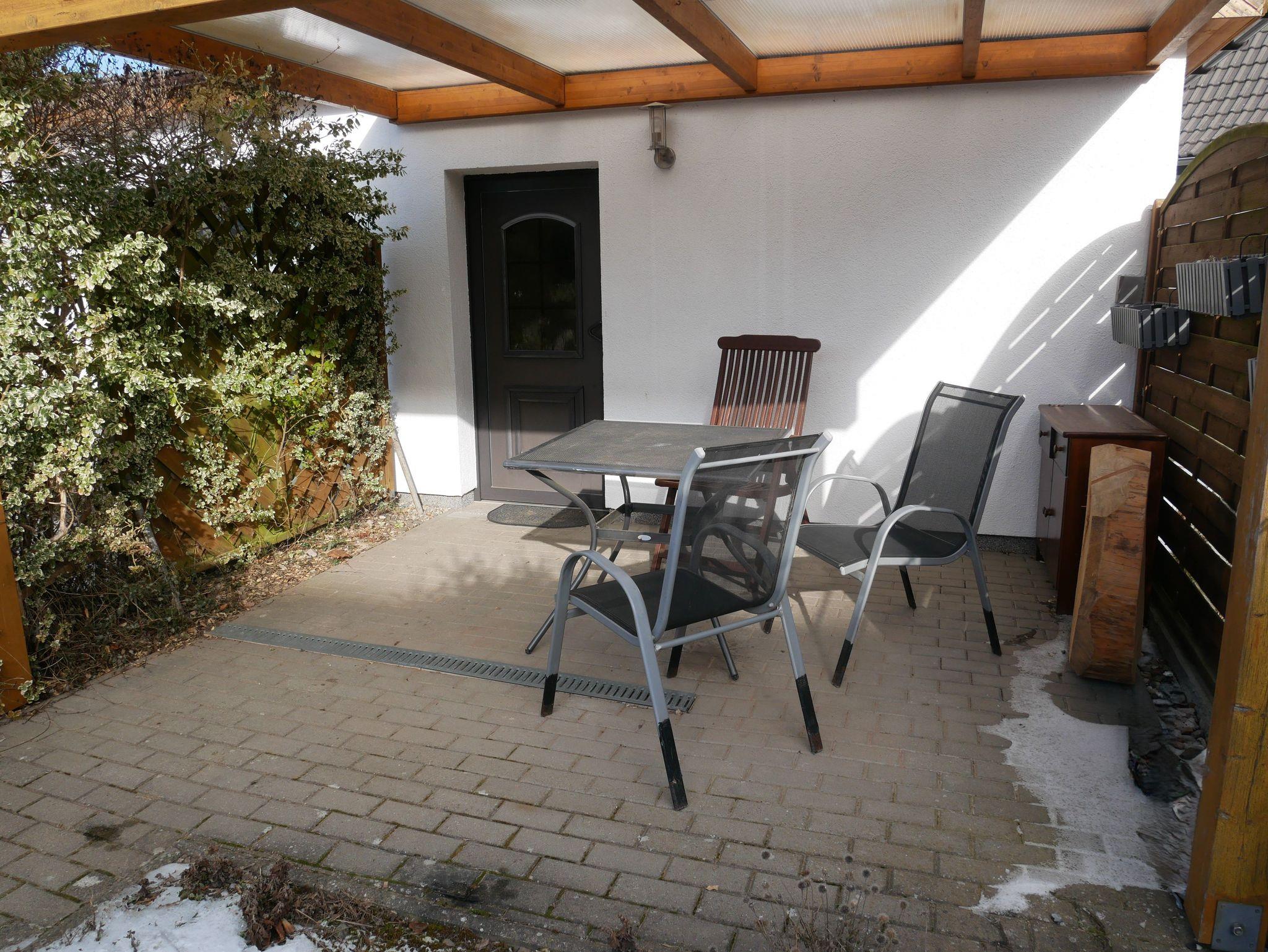 Vor der Ferienwohnung lädt eine überdachte Terrasse mit Tisch und Stühlen zum Verweilen im Freien ein.