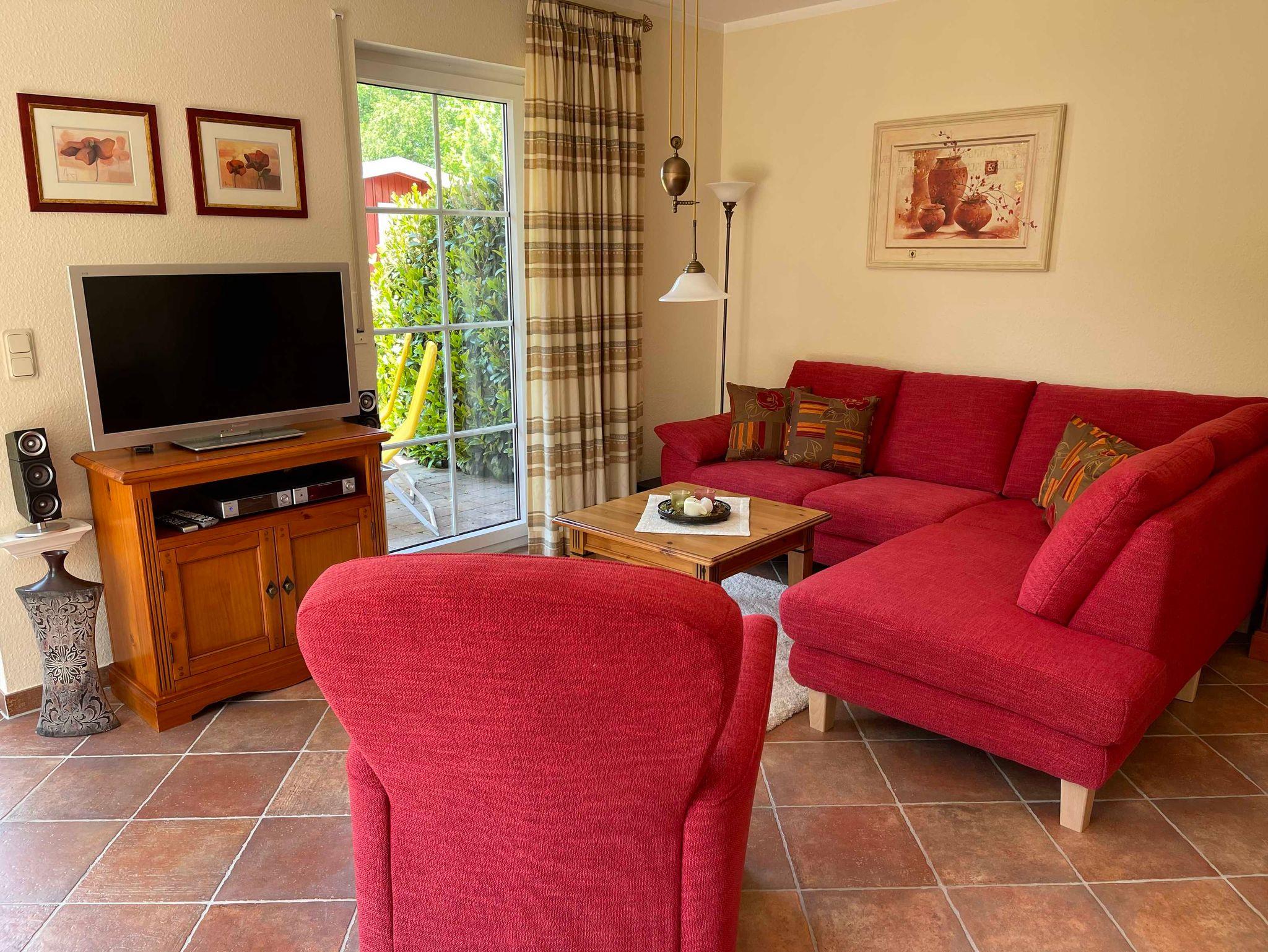 Urgemütliches Wohnzimmer mit Echtholzmöbeln, 2 Schlafzimmer, 2 Bäder, sonnige Terrasse, Garten, PKW-Stellplatz, Strandnähe.