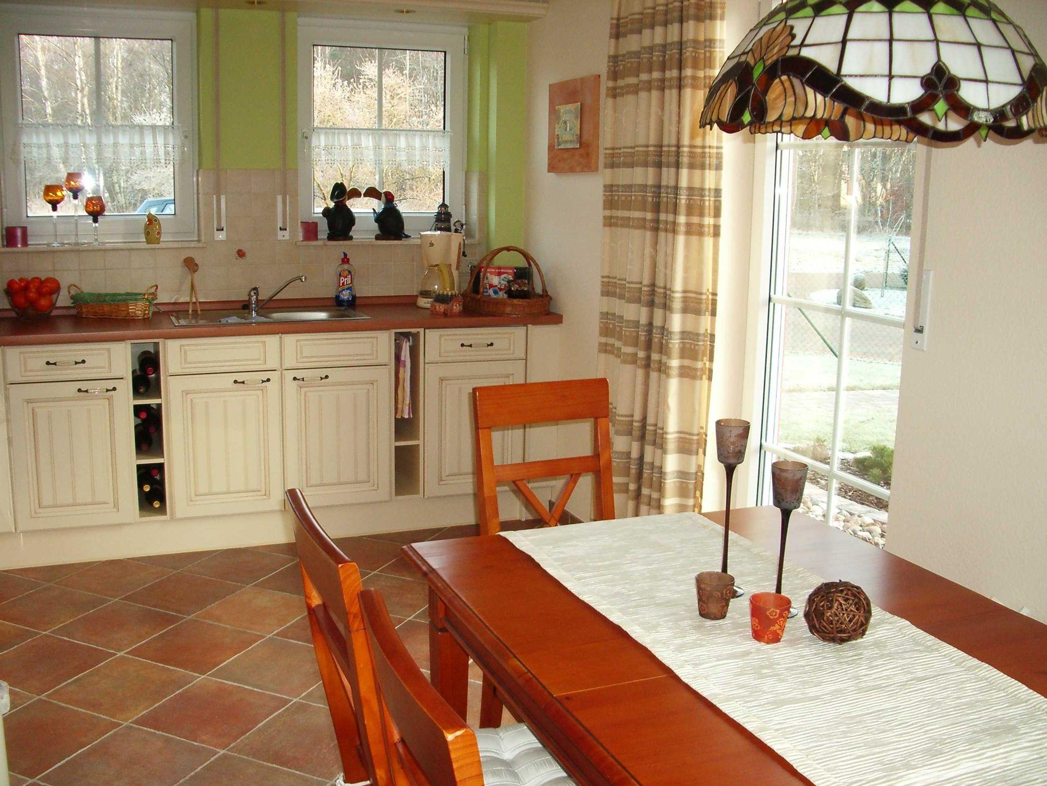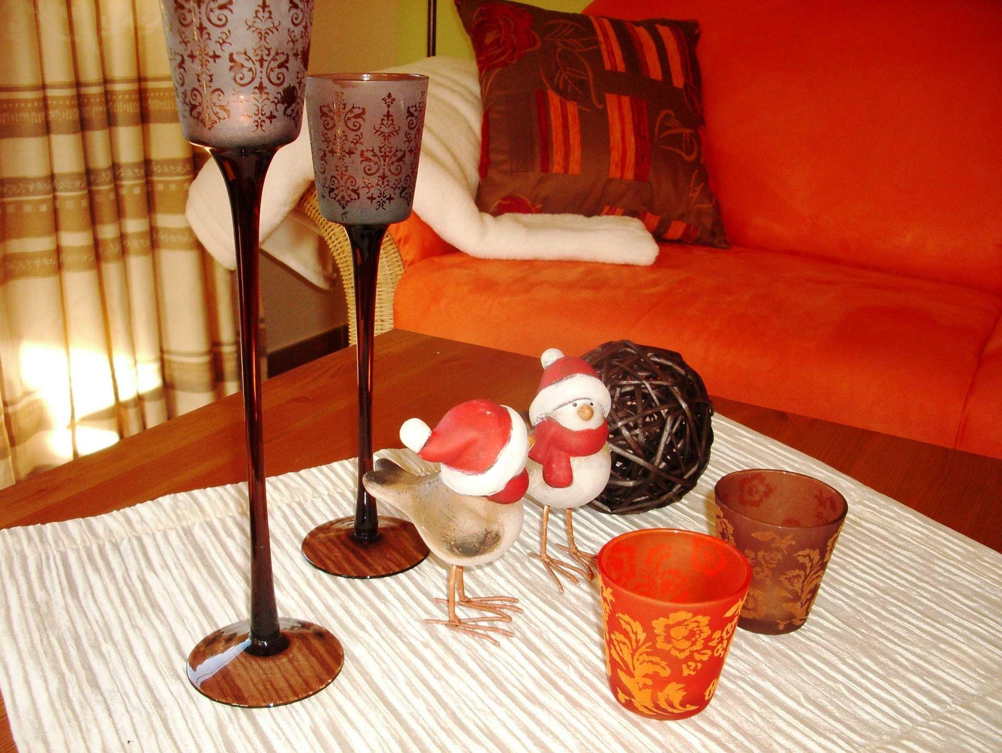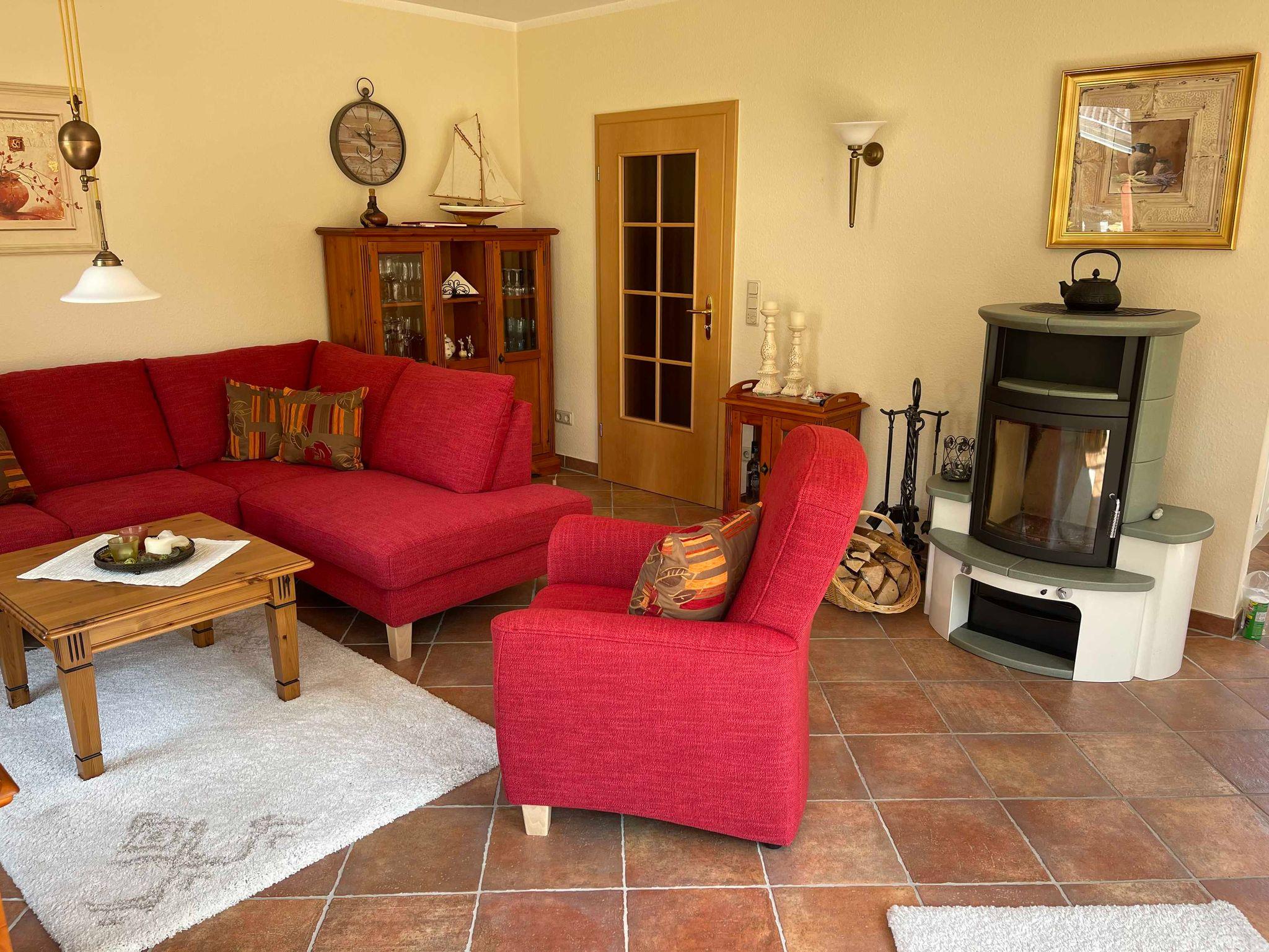Wohnzimmer im gemütlichen Landhausstil mit Echtholzmöbeln, Kaminofen, SAT- Fernseher, Stereoanlage mit DVD Player.