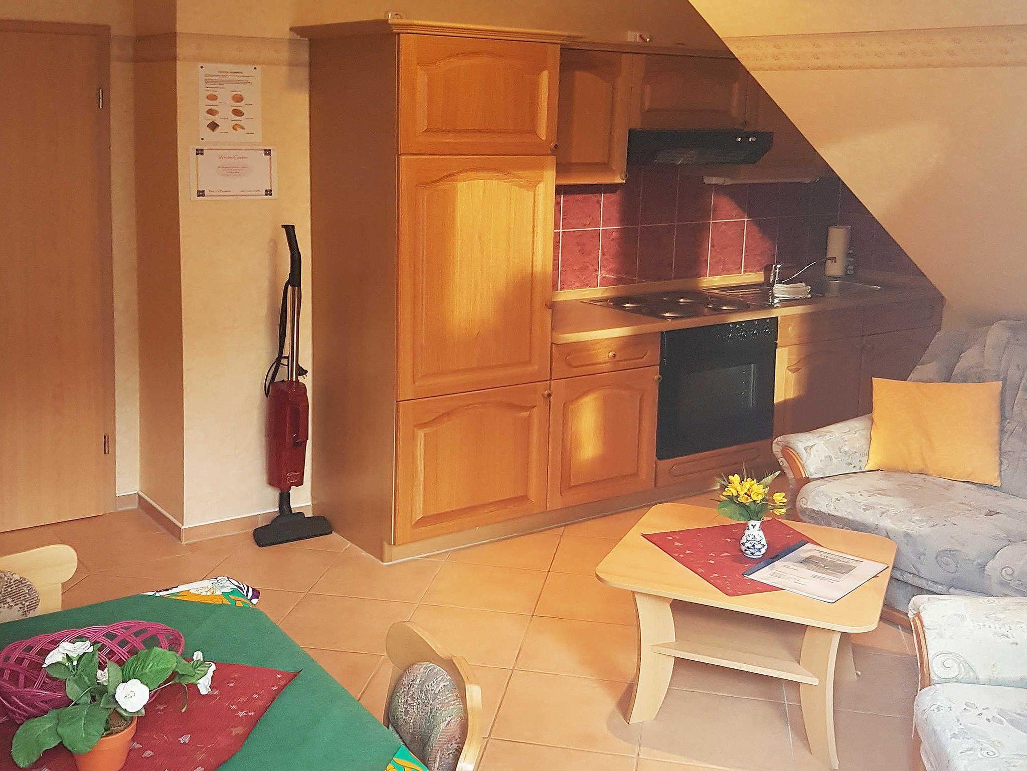 2 Raum-Wohng. bis 2 Pers., 1 SZ, Küche, Wohnzimmer, Bad, mit Dusche/WC, Flur, Terrasse o. Balkon. Frühstücksbüfett mit Voranmeldung möglich und auch Abendessen à la carte. Haustiere nur auf Anfrage!