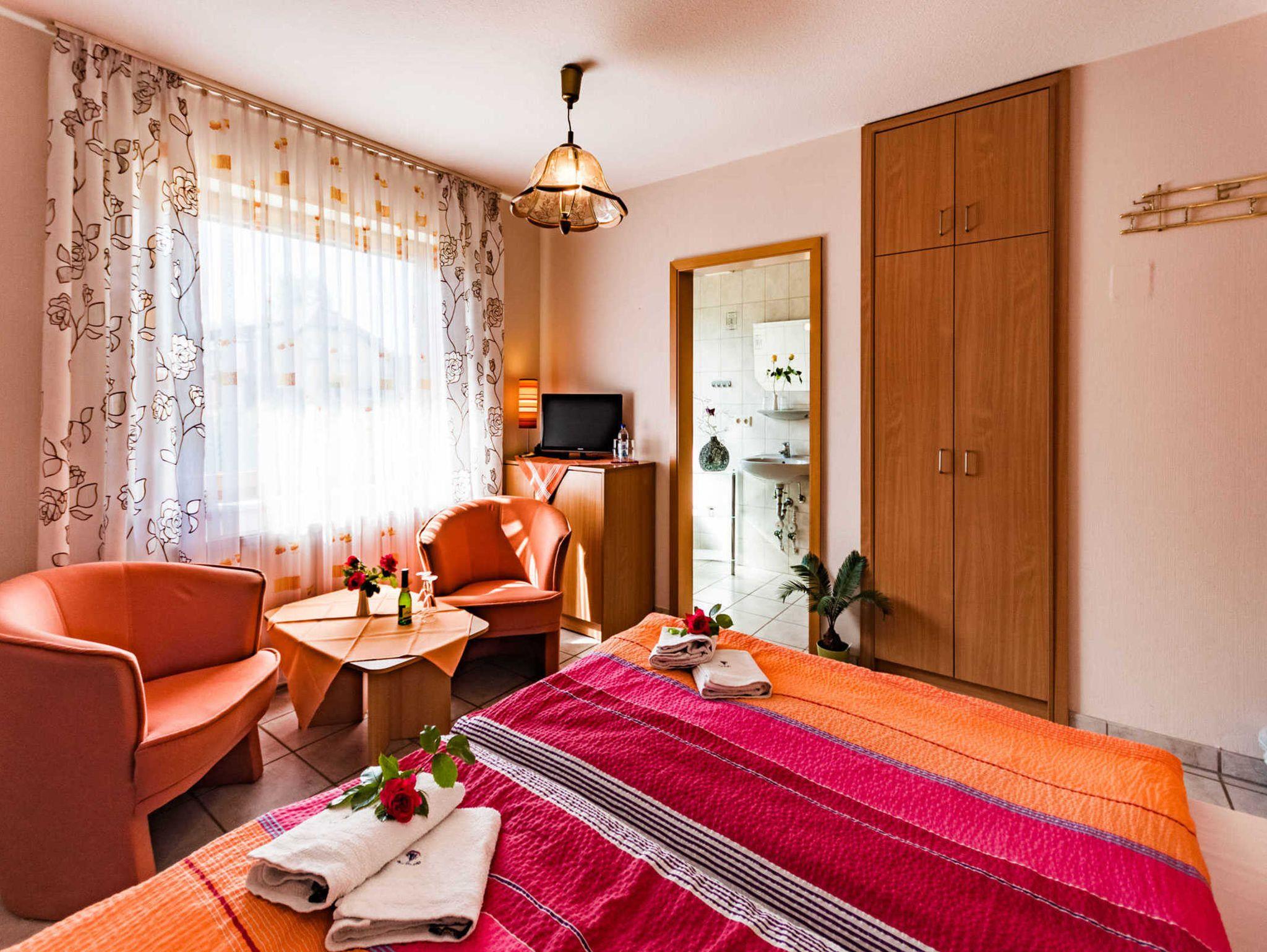 Nichtraucherzimmer; Raucherzimmer nach Absprache durch Zimmerwechsel möglich. TV- und Telefonanschluß, Sitzgruppe mit Tisch und teilweise eine zusätzliche Couch, Doppelbett mit Bandscheibenmatratzen, DU/WC gefliest, ruhige u. sonnige Lage, inklusive Bettwäsche und Handtücher. Behindertenfreundlich und Rollstuhlgerecht dazu bitte anfragen.