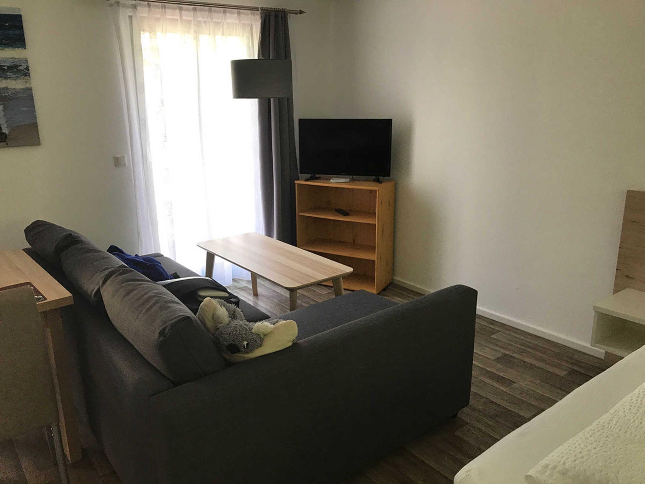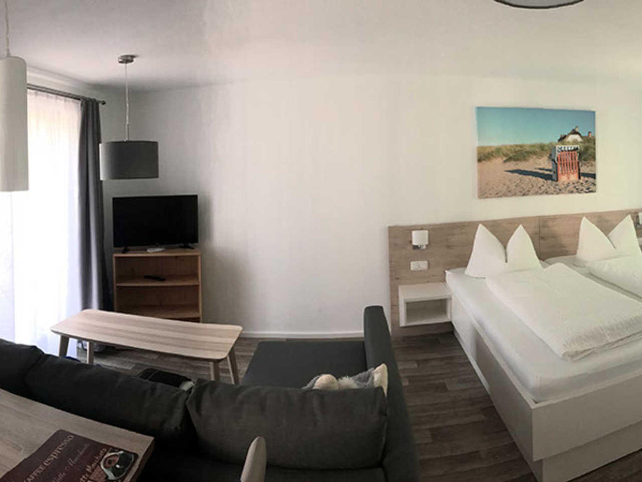 1 Wohn/Schlafbereich mit Doppelbett, Sofa, TV