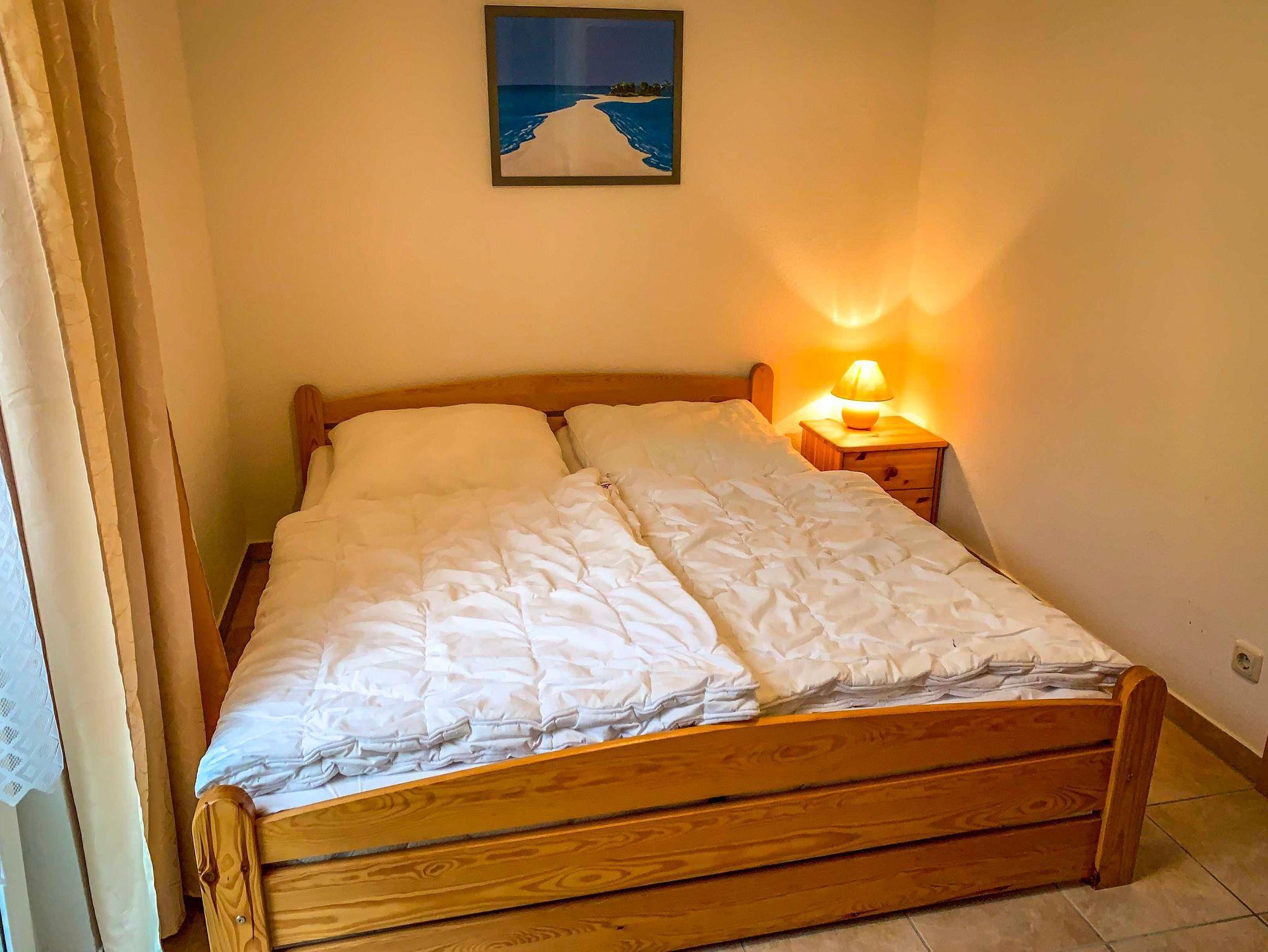 Die anderen beiden Wohnungen befinden sich im Erdgeschoss. Diese verfügen über ein Schlafzimmer mit Doppelbett und ein weiteres Schlafzimmer mit einem Einzelbett sowie einem Etagenbett. Den Gästen dieser Wohnungen steht eine Terrasse mit Sitzmöbeln zur Verfügung.