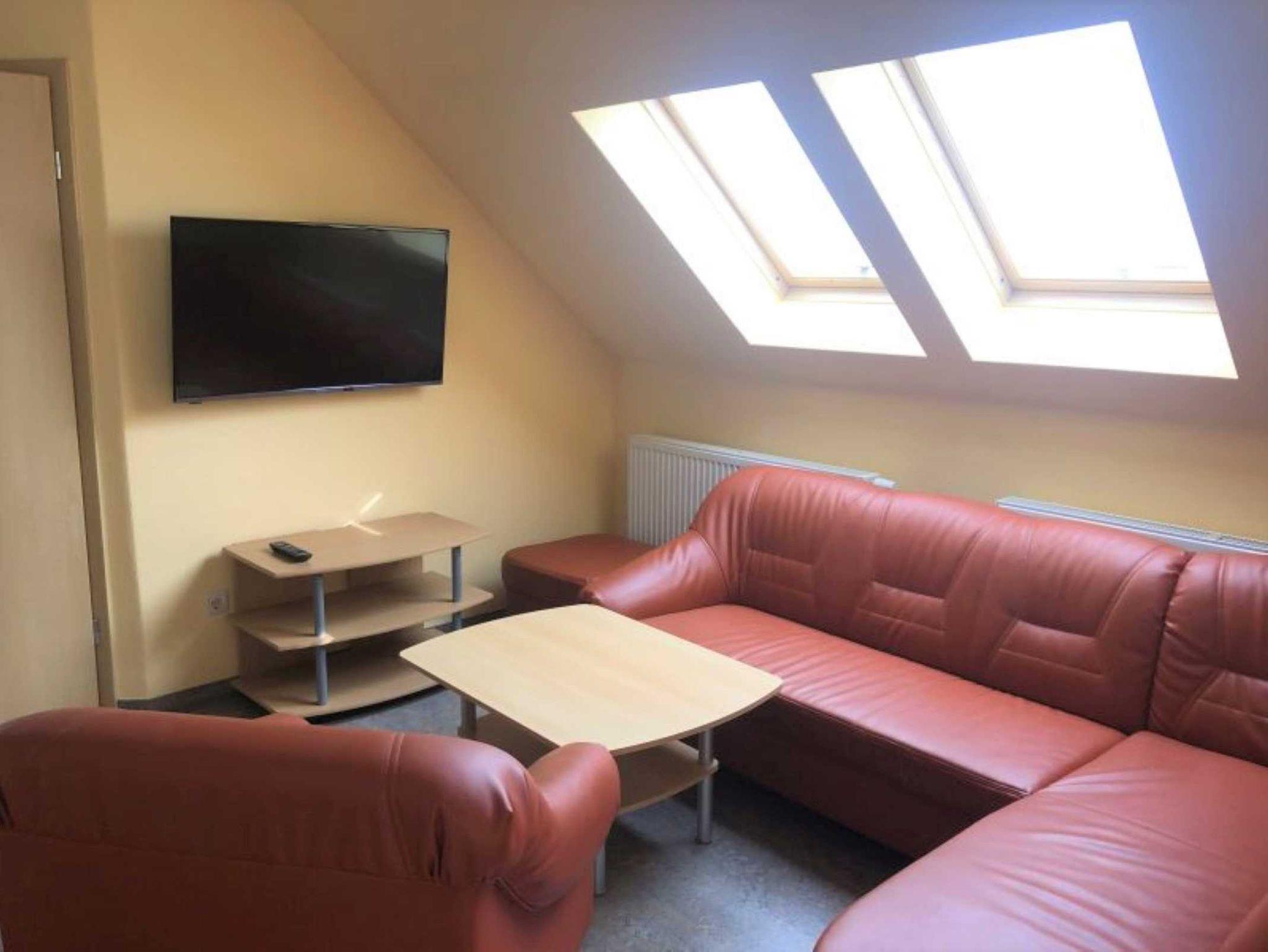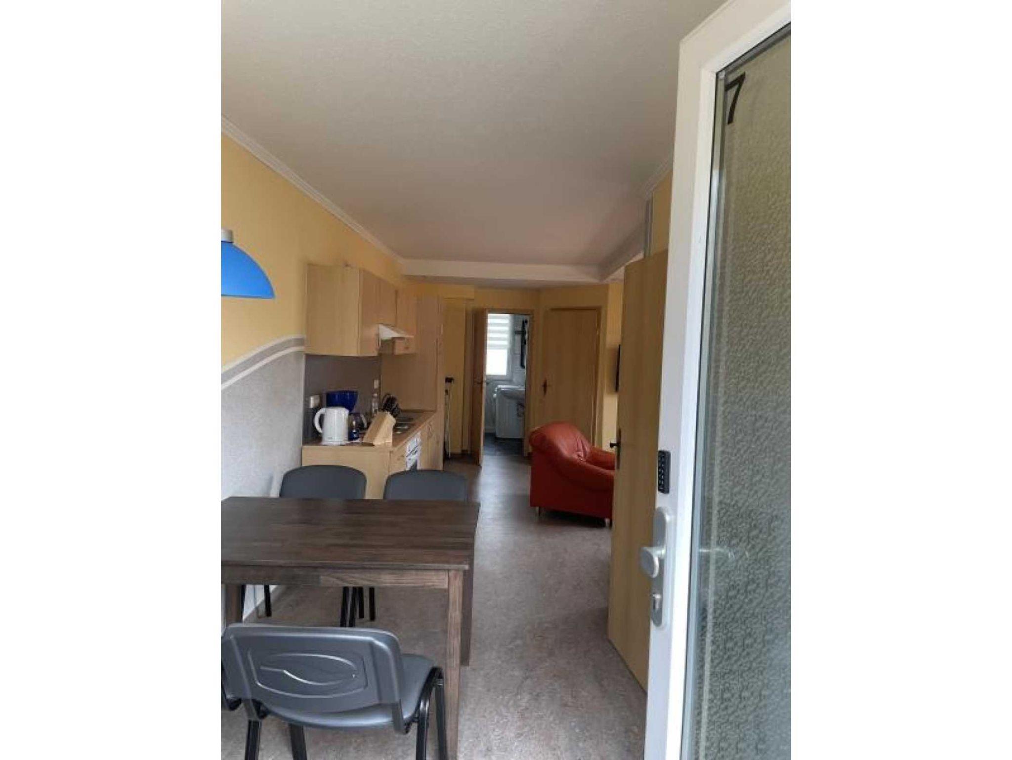 Die Ferienwohnung befindet sich im 1. OG und ist über eine Außentreppe zu erreichen. Sie verfügt über zwei Schlafzimmer (1x Doppelbett, 1x 2 Einzelbetten und zus. TV), einer voll ausgestatteten Küche mit Backofen, Kühlschrank mit Gefrierfach, Wasserkocher, Toaster und Kaffeemaschine. Der Wohn- und Essbereich verfügt über einen Flat-TV und einen Kamin für gemütliche Stunden. Das Badezimmer ist mit Dusche/WC, Waschmaschine und Fön ausgestattet. Die Fußböden sind teilweise mit Teppich im Wohn- und Schlafbereich, mit Linoleum im Küchen- und Essbereich und mit Fliesen im Bad ausgelegt. Die Wohnung hat eine separate Sitzmöglichkeit im Außenbereich. Ein PKW-Stellplatz und WLAN stehen Ihnen kostenfrei zur Verfügung.
