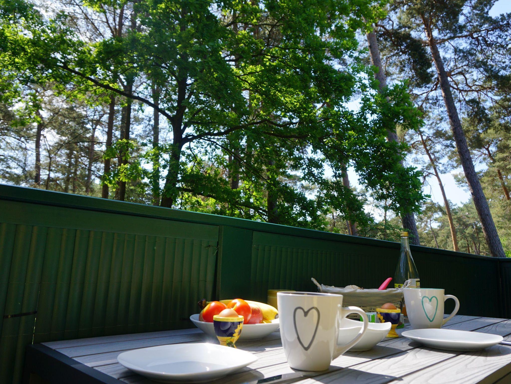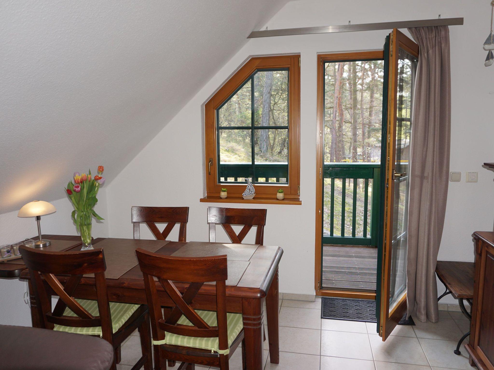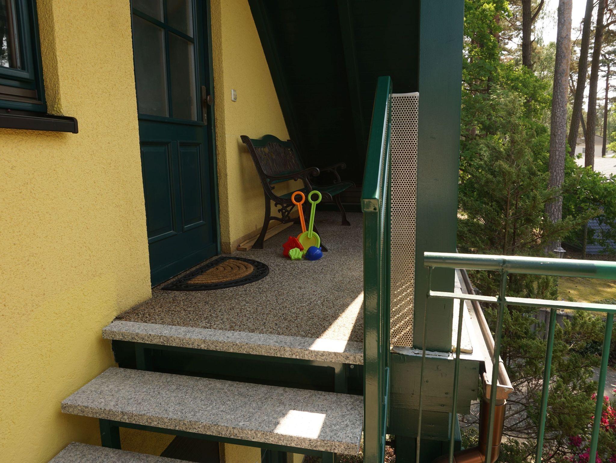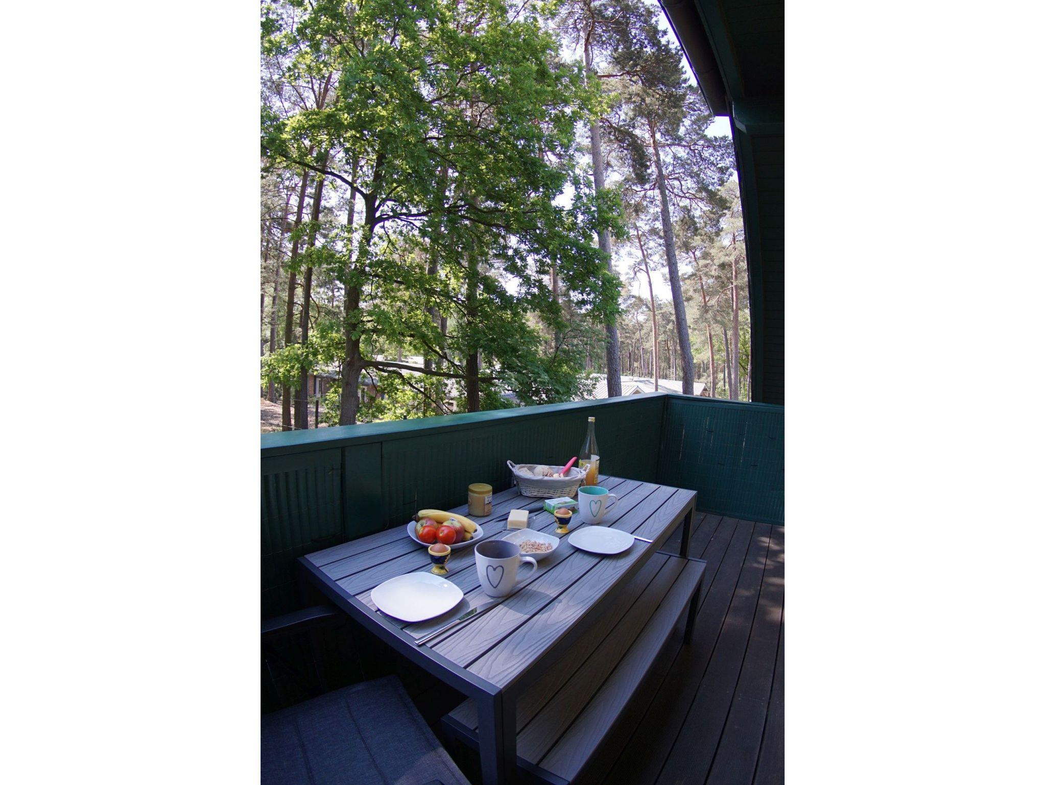 Der Balkon lädt mit Blick in den Dünenwald zum Verweilen ein. Im Außenbereich befindet sich ein PKW-Stellplatz, der im Mietpreis enthalten ist.