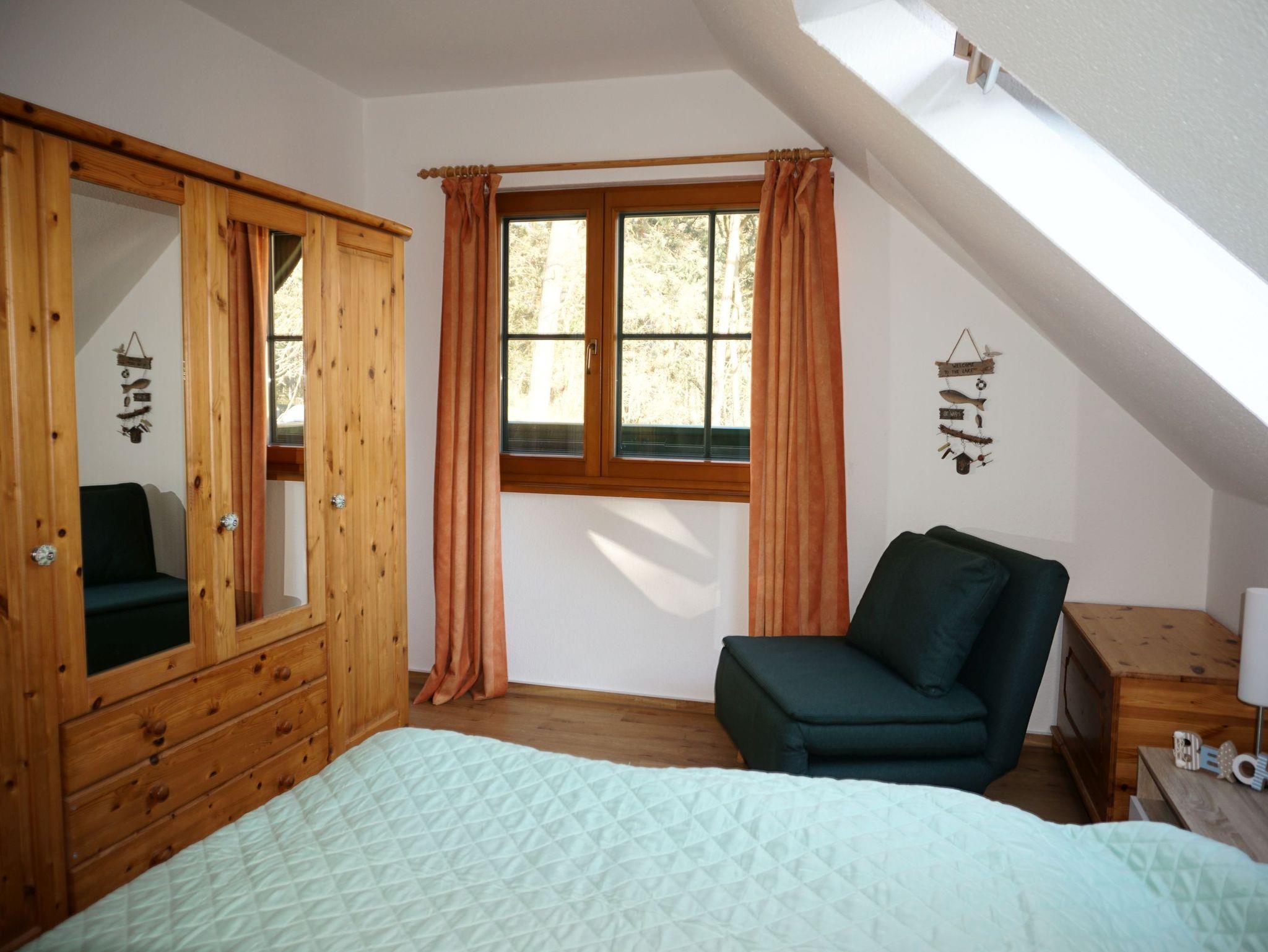 Das Wohnzimmer ist mit einer bequemen Leder-Eck-Couch ausgestattet. Der Schlafraum verfügt über ein Doppelbett (1,8 m x 2 m). Ein Lounge-Sessel, der zum Schlafen ausgeklappt werden kann (Liegefläche ca. 0,85 m x ca. 1,90 m), bietet die Möglichkeit zur Aufbettung für ein Kind im Schlafzimmer neben dem Doppelbett.