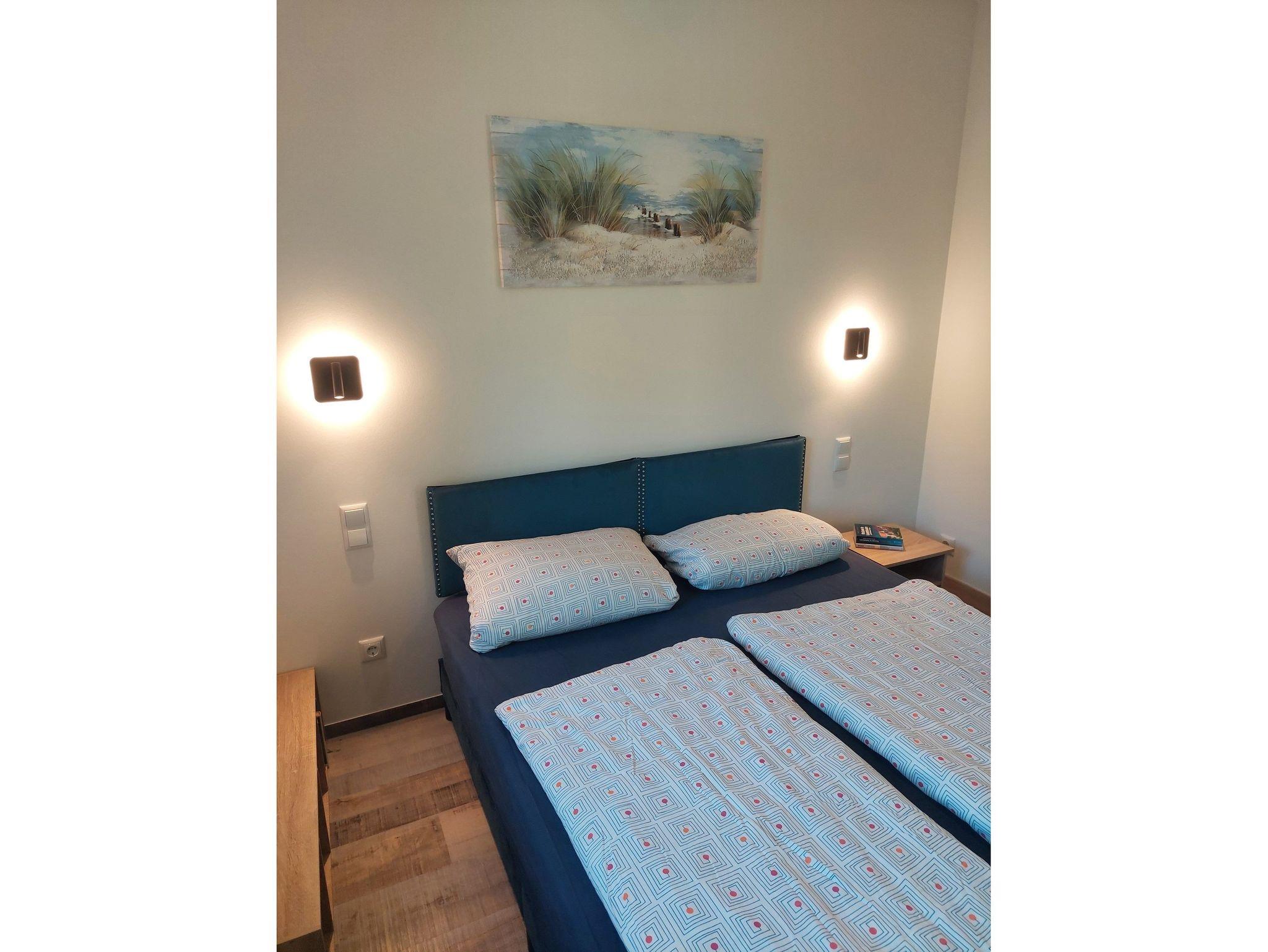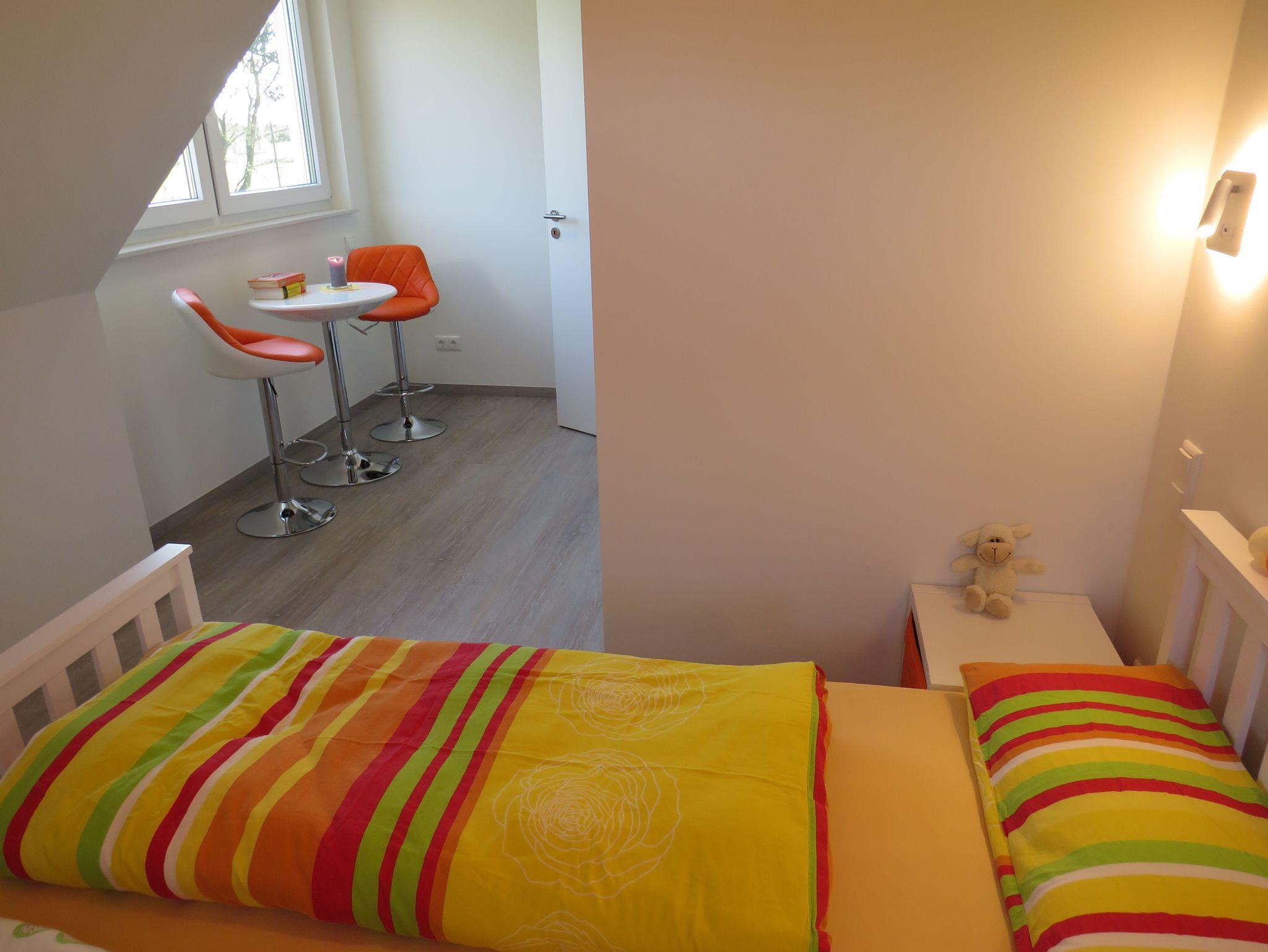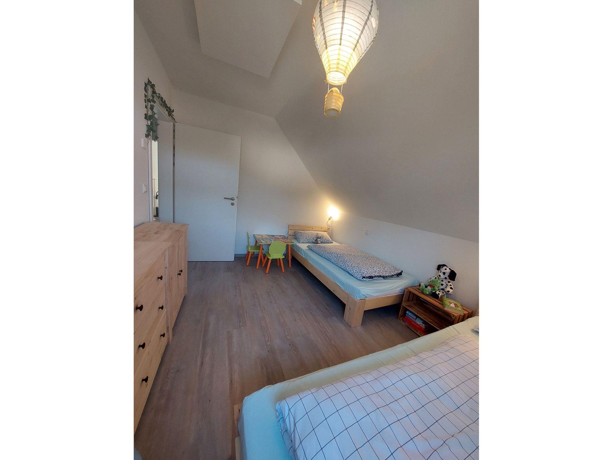Modern ausgestattetes Ferienhaus mit großer teilüberdachter Terrasse auf der Südseite. Ein Schlafzimmer mit Doppelbett (1,6 x 2 m) befindet sich im Erdgeschoss, ein weiteres mit einem Doppelbett (1,6 x 2 m) im Obergeschoss. Dort befindet sich auch ein Kinderzimmer mit zwei verschiebbaren Einzelbetten (2 x 0,9 x 2 m).
