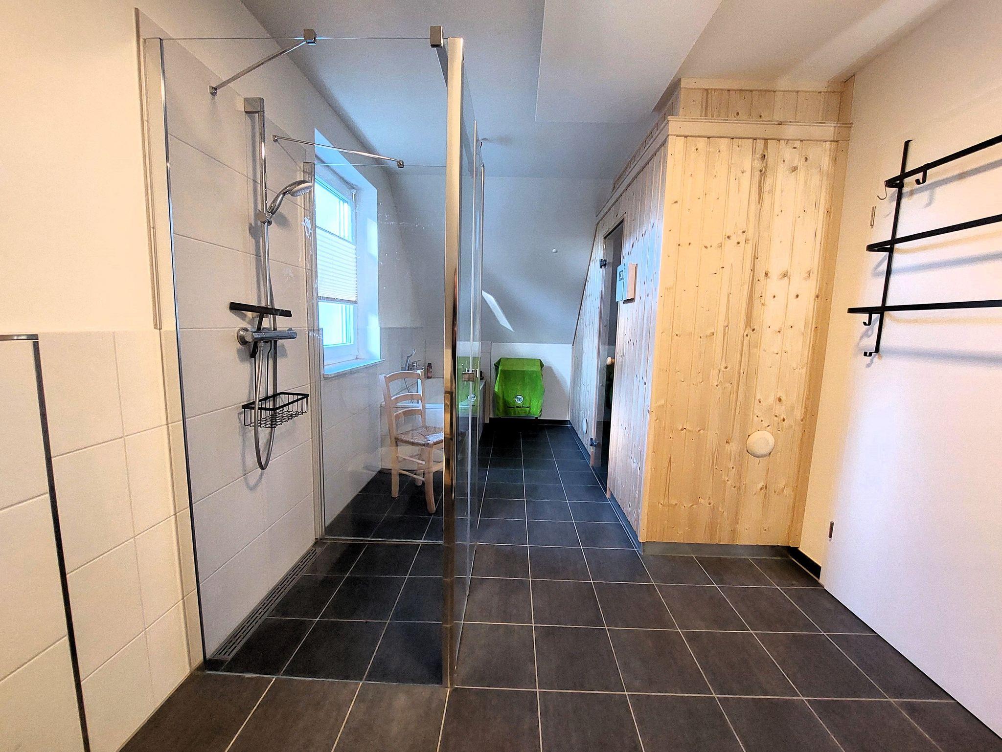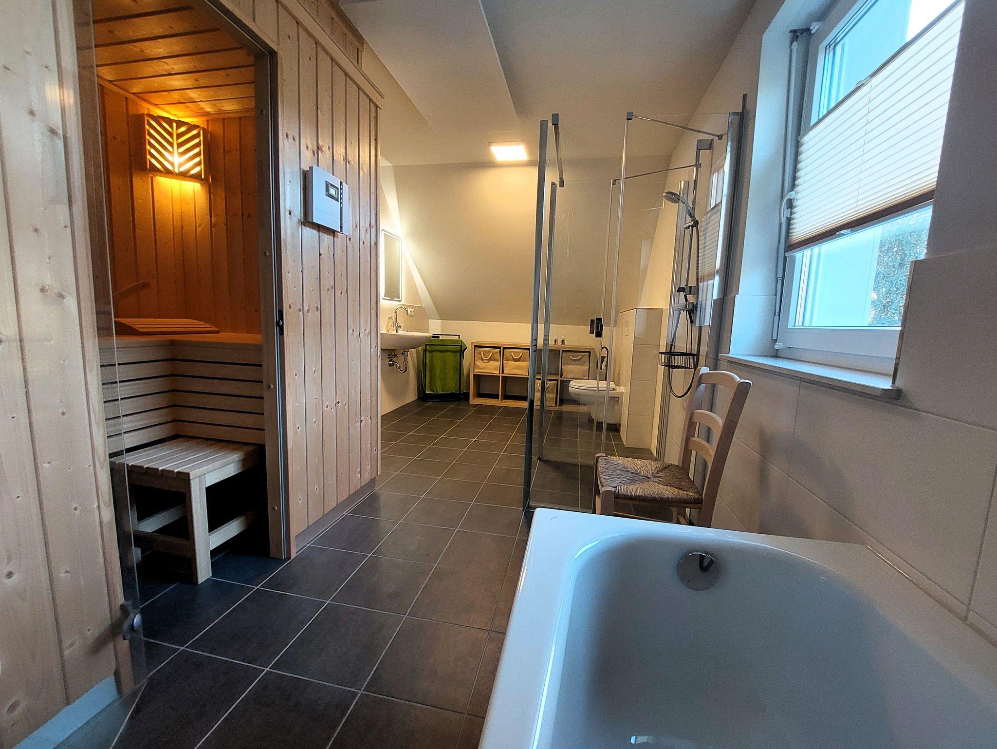 Das geräumige Familienbad im Obergeschoss besitzt neben der Dusche auch eine Badewanne und eine Sauna. Das zusätzliche Bad im Erdgeschoss hat ebenfalls eine Dusche. Somit finden Gäste mit eingeschränkter Mobilität alle notwendigen Räume im Erdgeschoss.