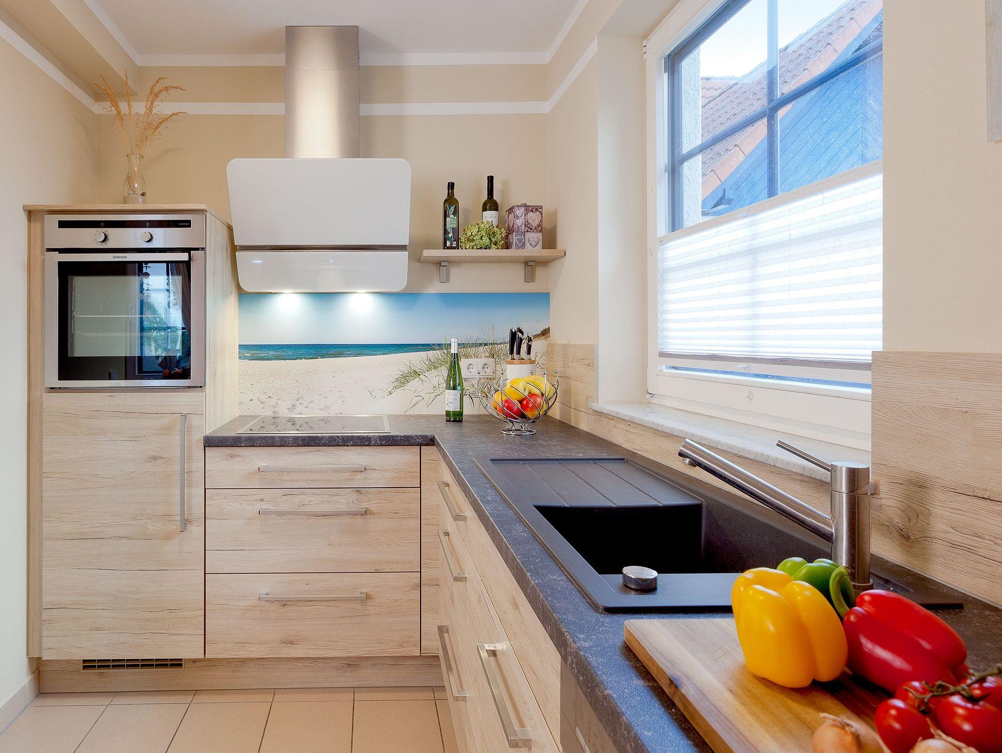 • Küchenzeile: Herd, Backofen, Kühlschrank mit Tiefkühlfach, Geschirrspülmaschine, Kaffeemaschine, Toaster, Wasserkocher