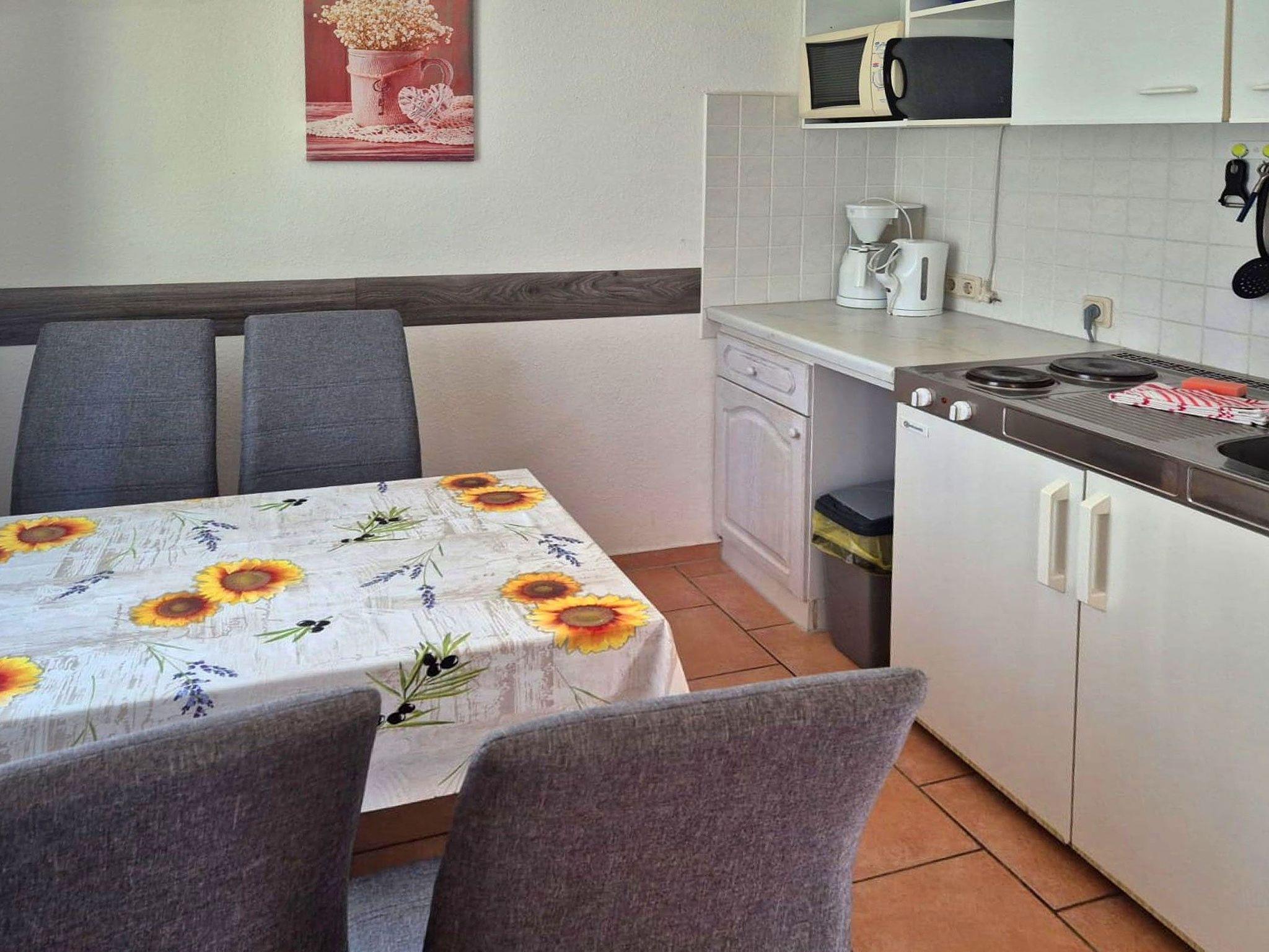 Küchenzeile mit 4 Plattenherd, Mikrowelle, Kühlschrank, Kaffeemaschine, Wasserkocher, Toaster, Eßtisch