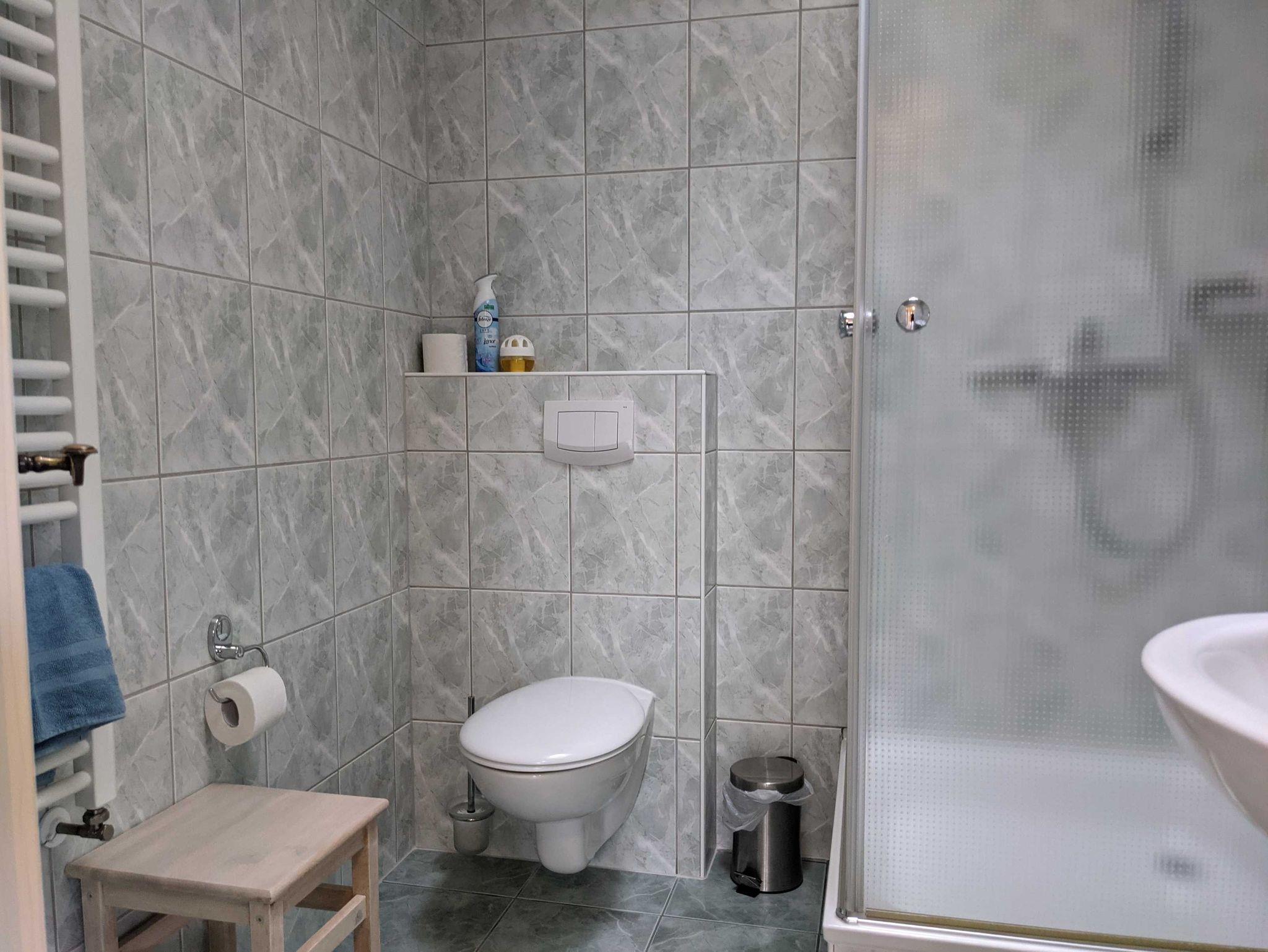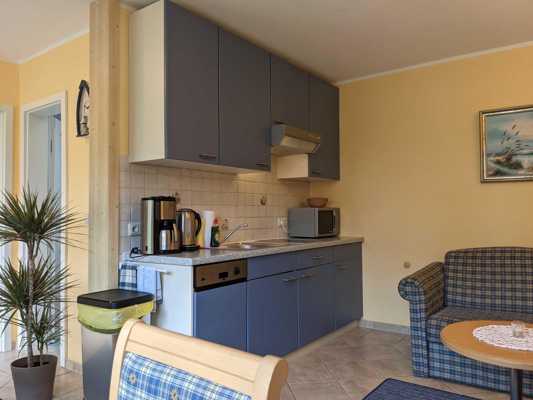 Unsere 2-Raum-Wohnung ist ca. 40 m² groß und besteht aus einem Wohnbereich sowie voll ausgestatteter Küchenzeile mit 2 Ceranfeldern, Mikrowelle, Toaster, Kaffeemaschine, Wasserkocher, Kühlschrank und Spülmaschine und einem separatem Schlafraum mit Doppelbett. Das Bad/WC ist mit einem Fön, einem befülltem Seifenspender und einem Handtuchtrockner ausgestattet.