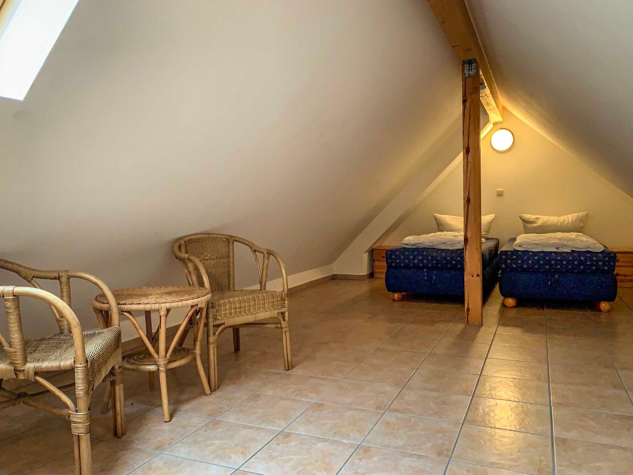 Zwei der Ferienwohnungen befinden sich im 1. Obergeschoss und sind über eine Außentreppe zugänglich. Diese Wohnungen haben ein Schlafzimmer mit Doppelbett auf der ersten Etage und ein zweites Schlafzimmer mit zwei Einzelbetten im Spitzboden, das über eine Raumspartreppe erreicht wird. Bitte beachten Sie, dass diese Treppe sehr steil ist und für Personen mit körperlichen Einschränkungen oder kleinere Kinder ungeeignet sein könnte. Jede dieser Wohnungen bietet außerdem einen Balkon, der mit Sitzmöbeln ausgestattet ist.