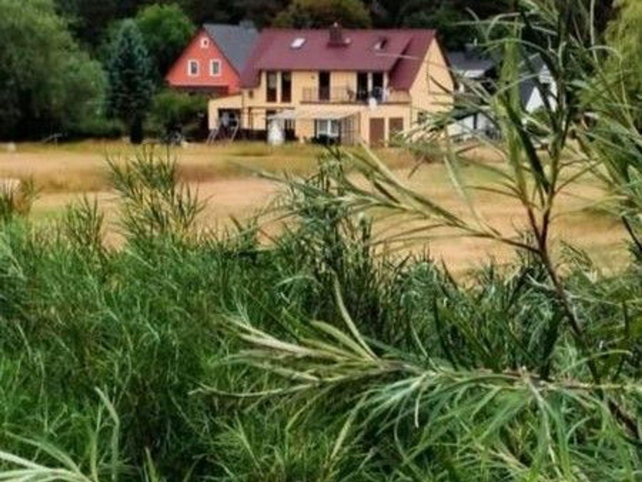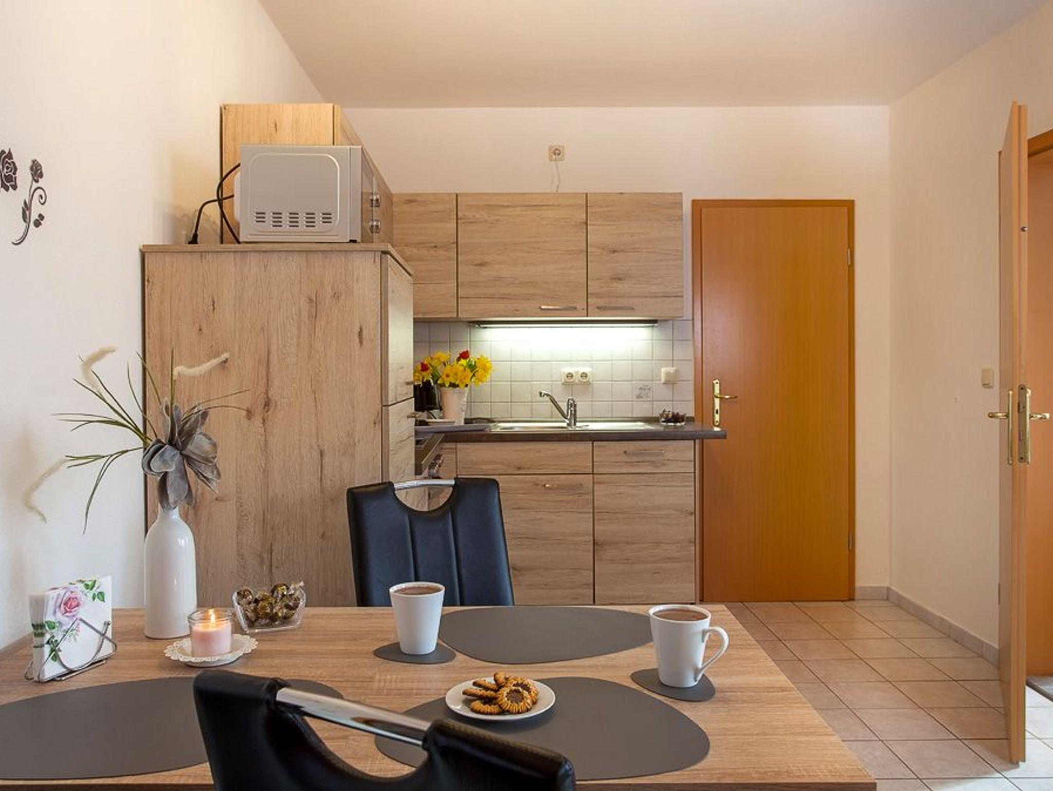 Die Wohnung befindet sich im EG und verfügt über Wohnzimmer mit Flachbildschirm, Sofa, Sssel, Leselampe. Schlafzimmer mit Doppel- und Einzelbett, DU/WC, Küche mit Kühlschrank inkl. Gefrierfach, Cerankochfeld, Backofen, Geschirrspüler, Mikrowelle, Kaffeemaschine, Wasserkocher, Toaster, Koch- und Eßgeschirr. Die Wohnung hat, außer im Schlafzimmer, Fußbodenheizung. Das Aufstellen eines Reisebettchens ist leider nicht möglich. Zur Wohnung gehört eine möblierte Terrasse im Garten dazu, mit einem freien Blick über die Wiesen. Der Parkplatz kostet 1,00 € die Nacht und befindet sich auf dem Grundstück! Ein Kinderbettchen kann nicht aufgestellt werden. Kinder ab 3 Jahren sind gestattet.