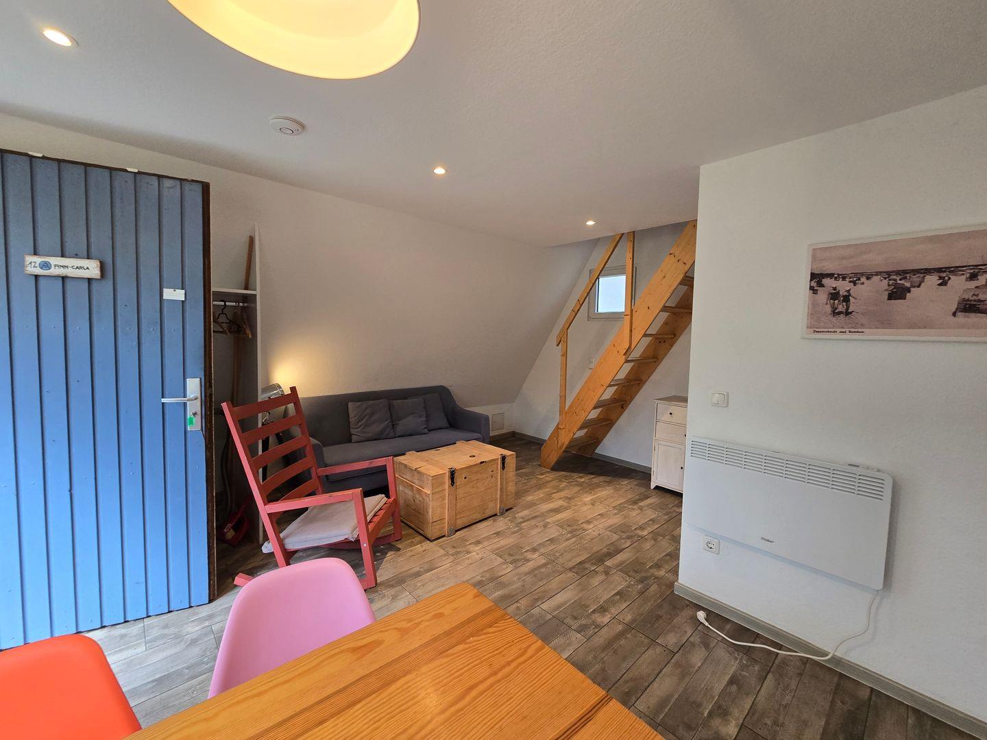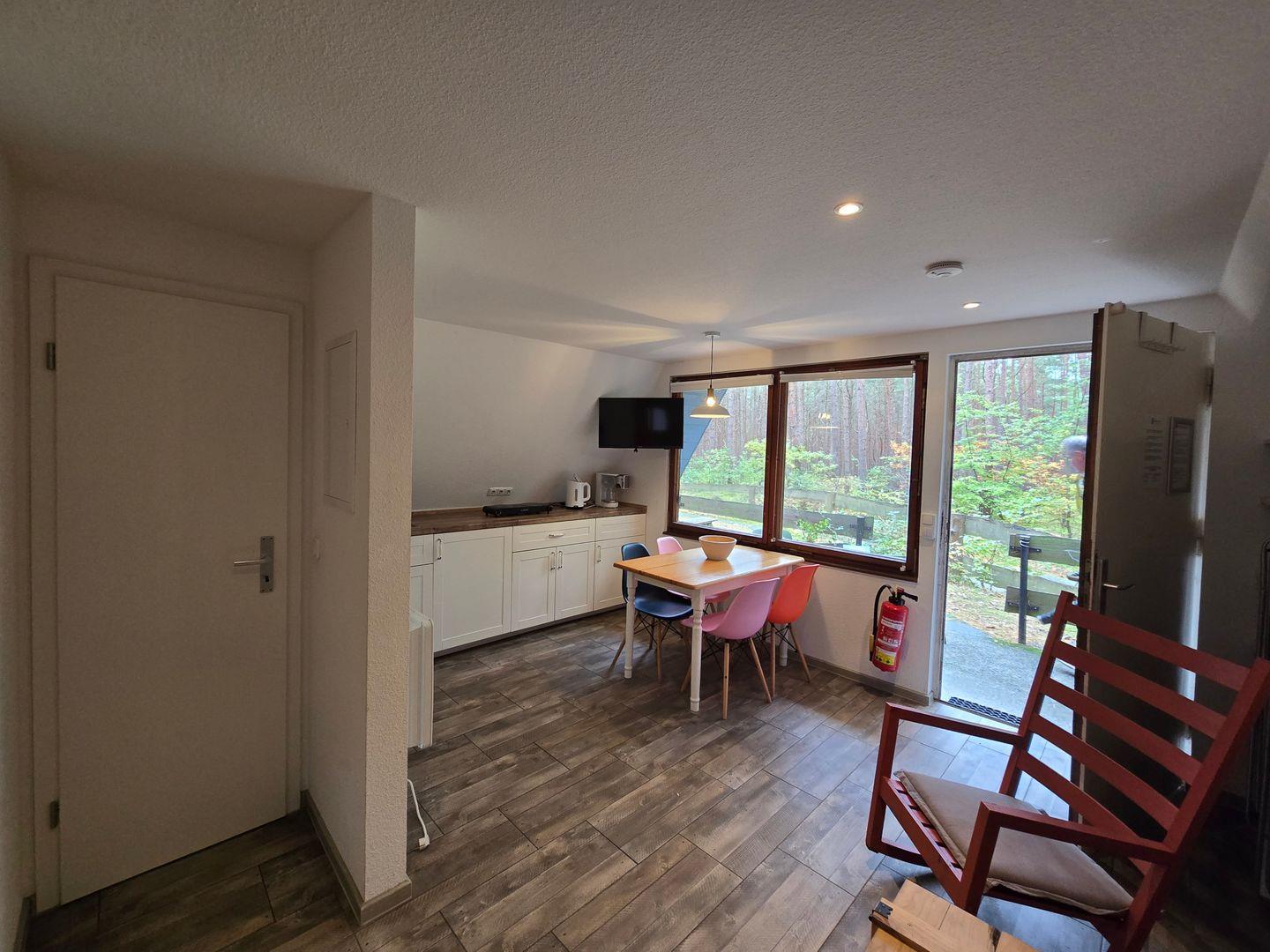 Drinnen warten ca. 30 m², die mehr können, als man denkt. Im Wohnzimmer treffen Sofa, Tisch und Stühle auf eine große Terrassentür, die den Wald direkt ins Haus holt. Die Schlafgalerie unterm Dach ist kuschelig und luftig zugleich – vier Betten für Erwachsene oder Kinder. IAlles schlicht, praktisch, ein bisschen skandinavisch – und mit Heizung für kühle Abende.