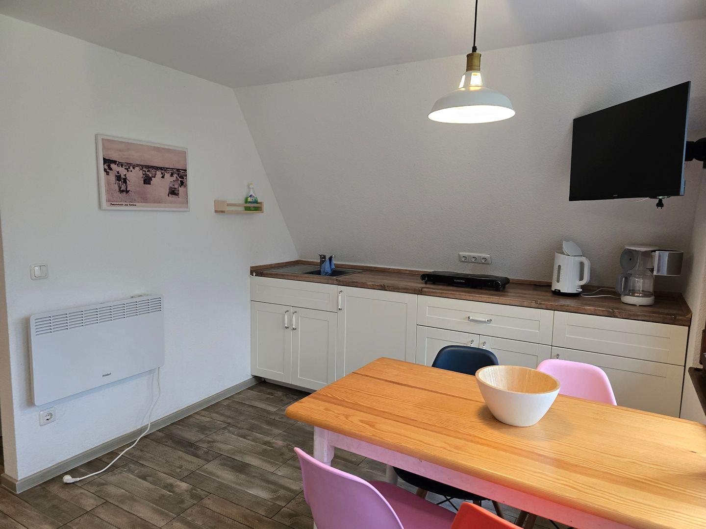 Die kleine Küchenzeile hat alles, was es für große Urlaubsgerichte braucht: Herd mit zwei Platten, Kühlschrank mit Gefrierfach, Kaffeemaschine, Toaster, Wasserkocher – dazu Geschirr und Besteck für vier Personen. Sollte einmal etwas fehlen: einfach melden, wir sorgen dafür. Daneben das eigene Duschbad mit WC – klein, aber fein und ganz für Sie allein.