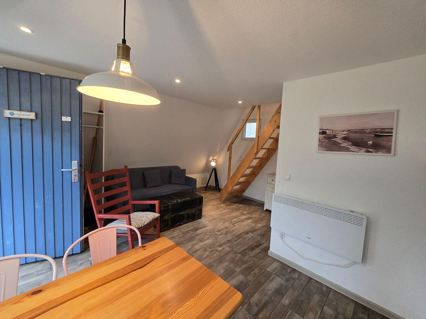 Drinnen warten ca. 30 m², die mehr können, als man denkt. Im Wohnzimmer treffen Sofa, Tisch und Stühle auf eine große Terrassentür, die den Wald direkt ins Haus holt. Die Schlafgalerie unterm Dach ist kuschelig und luftig zugleich – vier Betten für Erwachsene oder Kinder. IAlles schlicht, praktisch, ein bisschen skandinavisch – und mit Heizung für kühle Abende.
