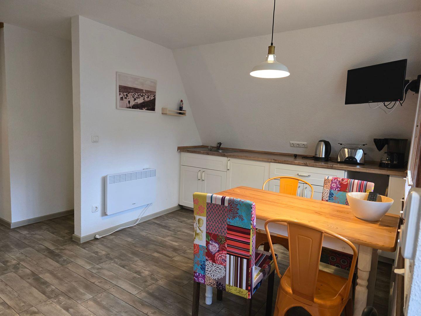 Die kleine Küchenzeile hat alles, was es für große Urlaubsgerichte braucht: Herd mit zwei Platten, Kühlschrank mit Gefrierfach, Kaffeemaschine, Toaster, Wasserkocher – dazu Geschirr und Besteck für vier Personen. Sollte einmal etwas fehlen: einfach melden, wir sorgen dafür. Daneben das eigene Duschbad mit WC – klein, aber fein und ganz für Sie allein.