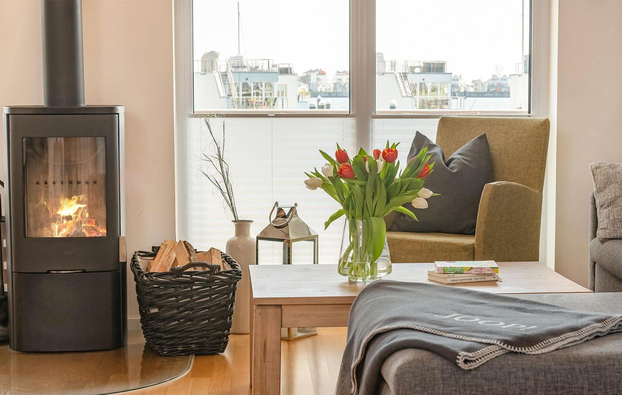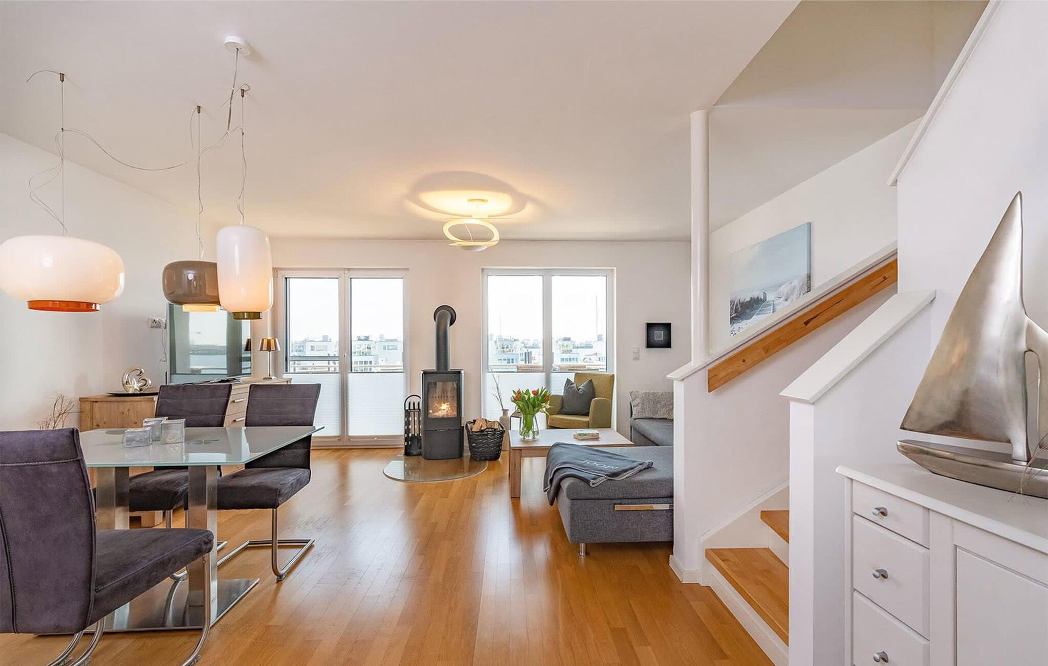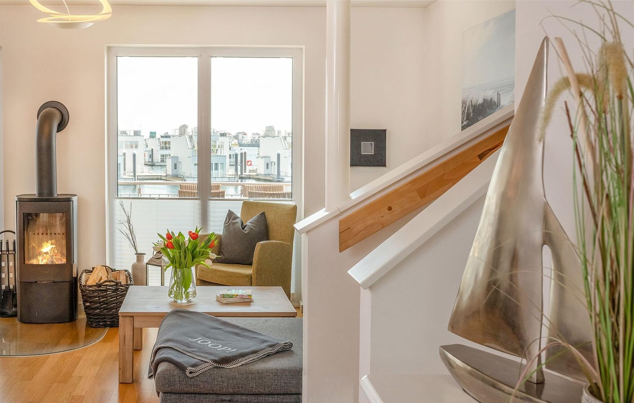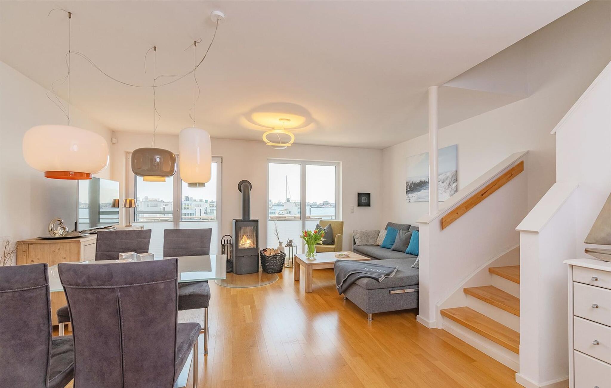 Das Ferienhaus Traumblick ist sehr hochwertig und stilvoll in moderner Form eingerichtet. Es bietet an anspruchsvoller Ausstattung alles für einen rundum gelungenen Urlaub am Meer. Der offene Wohn- /Essbereich im Erdgeschoss mit bodentiefen Fenstern, Sitzlandschaft und dem Esstisch ist der Mittelpunkt des Hauses. Hier finden gemütliche Momente vor dem Kaminofen statt und gemeinsame Mahlzeiten, die in der anliegenden voll ausgestatteten Küche gezaubert werden können.