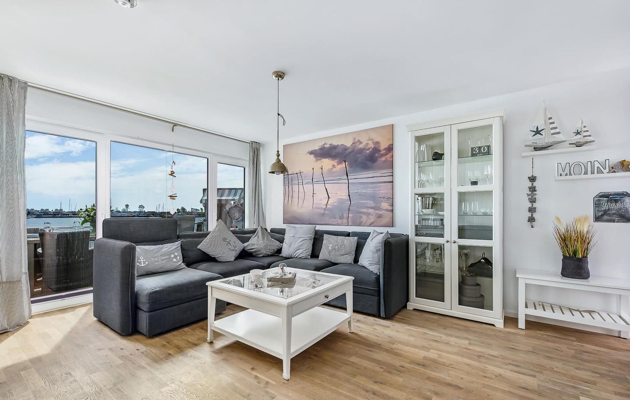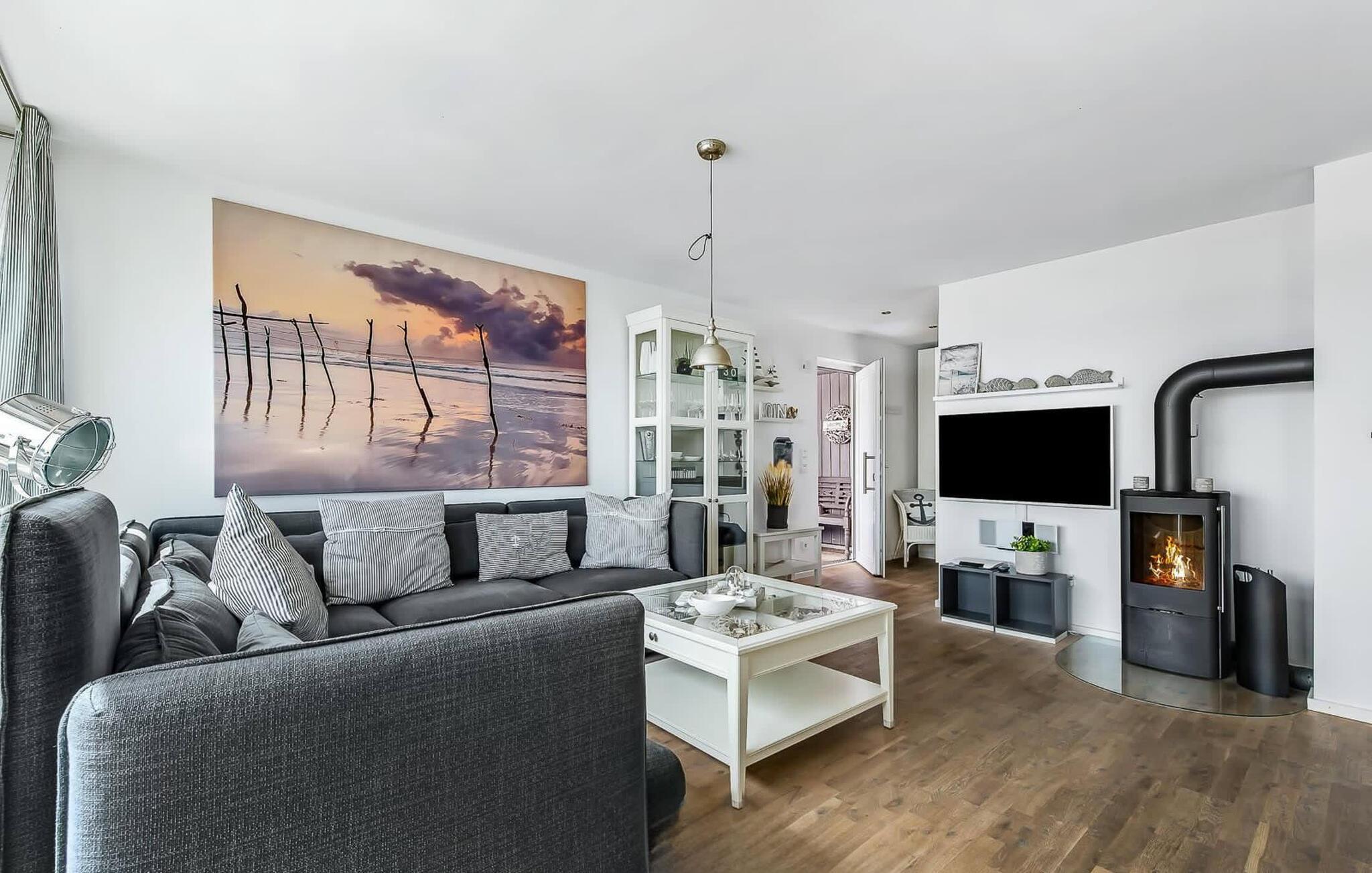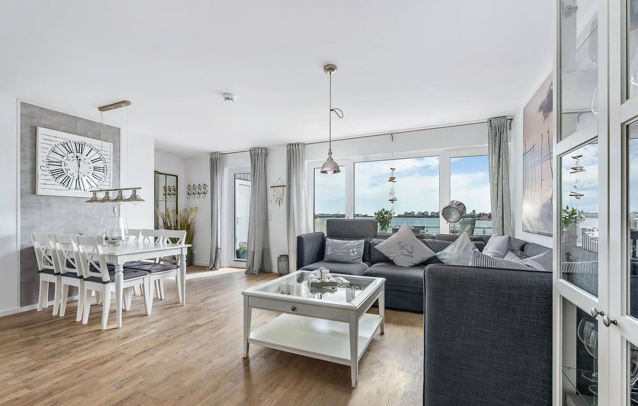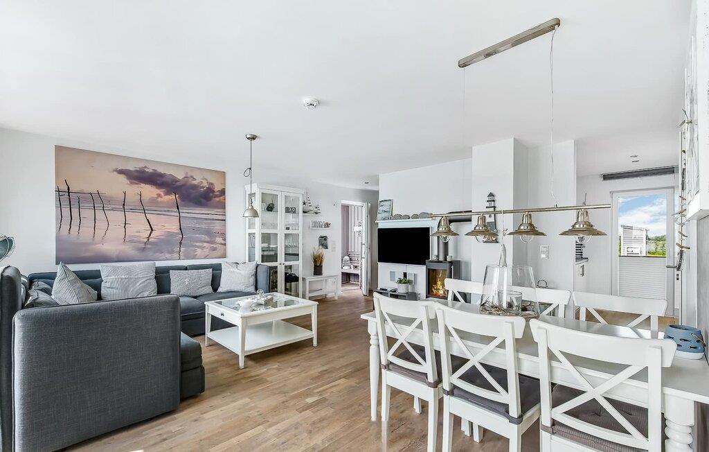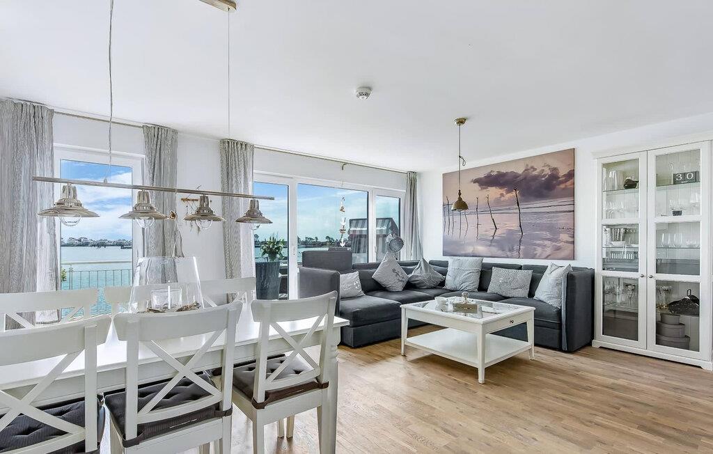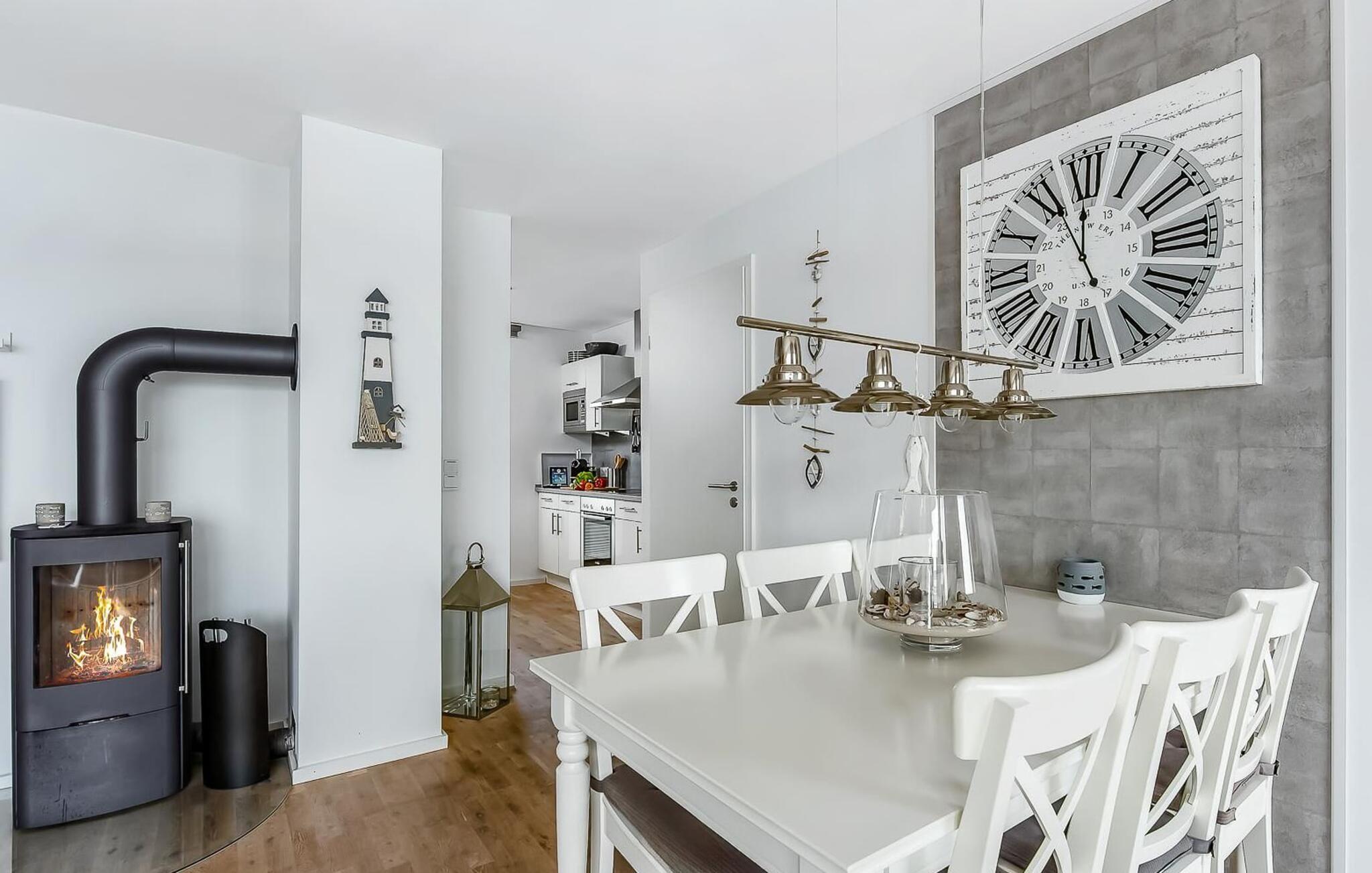 Ein großzügiger Wohn- /Essbereich mit bodentiefen Fenstern und Zugang zur Terrasse mit Panoramablick auf die Marina heißt einen in diesem Ferienhaus herzlich willkommen. Für besondere Gemütlichkeit sorgt hierbei ein Kaminofen. Die vollausgestattete Küche grenzt direkt an das Wohn- /Esszimmer und erlaubt absoluten Urlaubskomfort. Für Entertainment sorgt das Home Entertainment Programm.