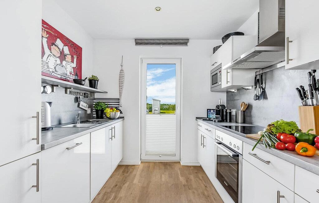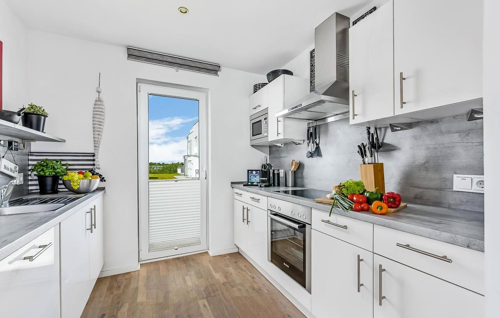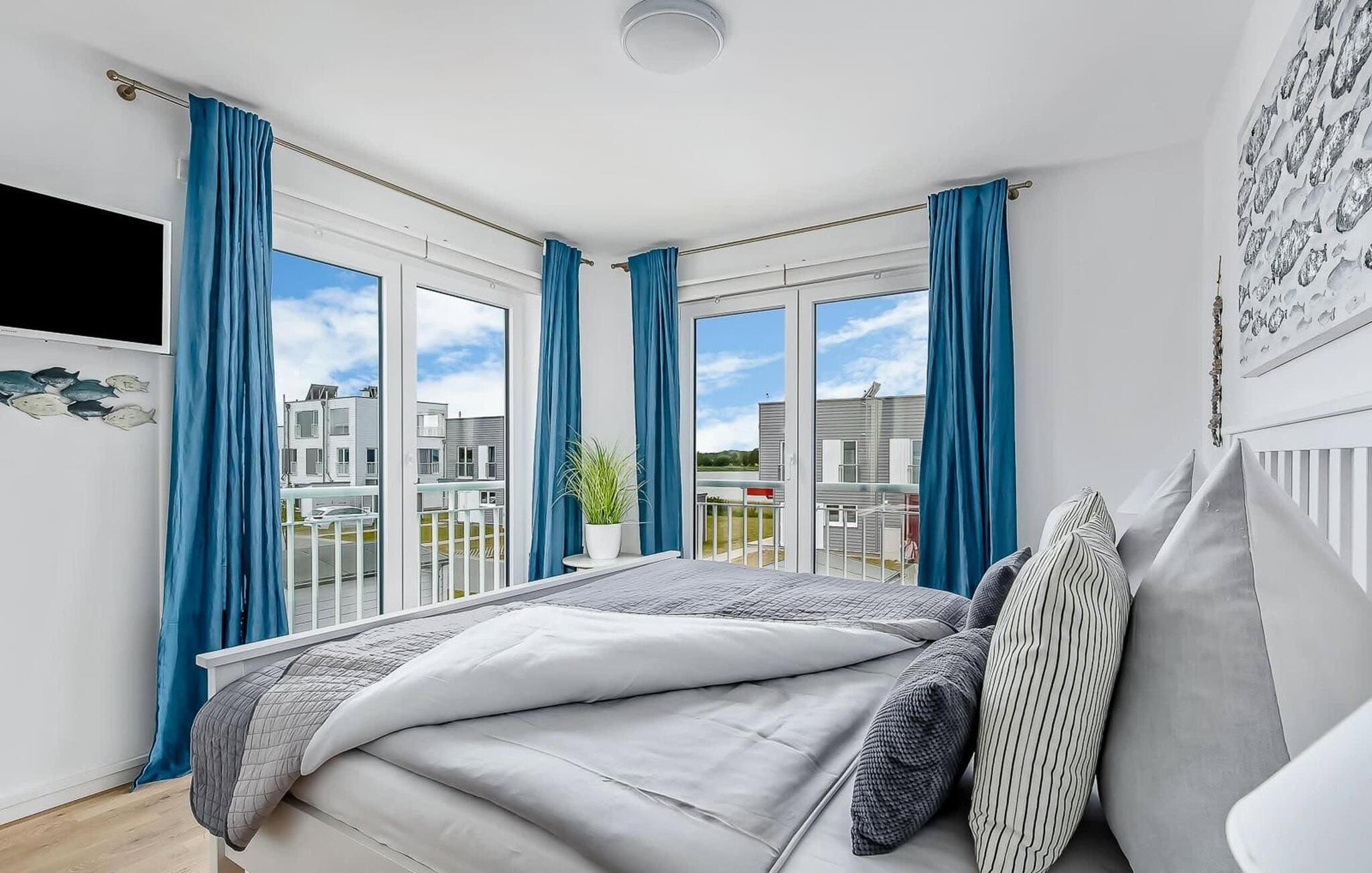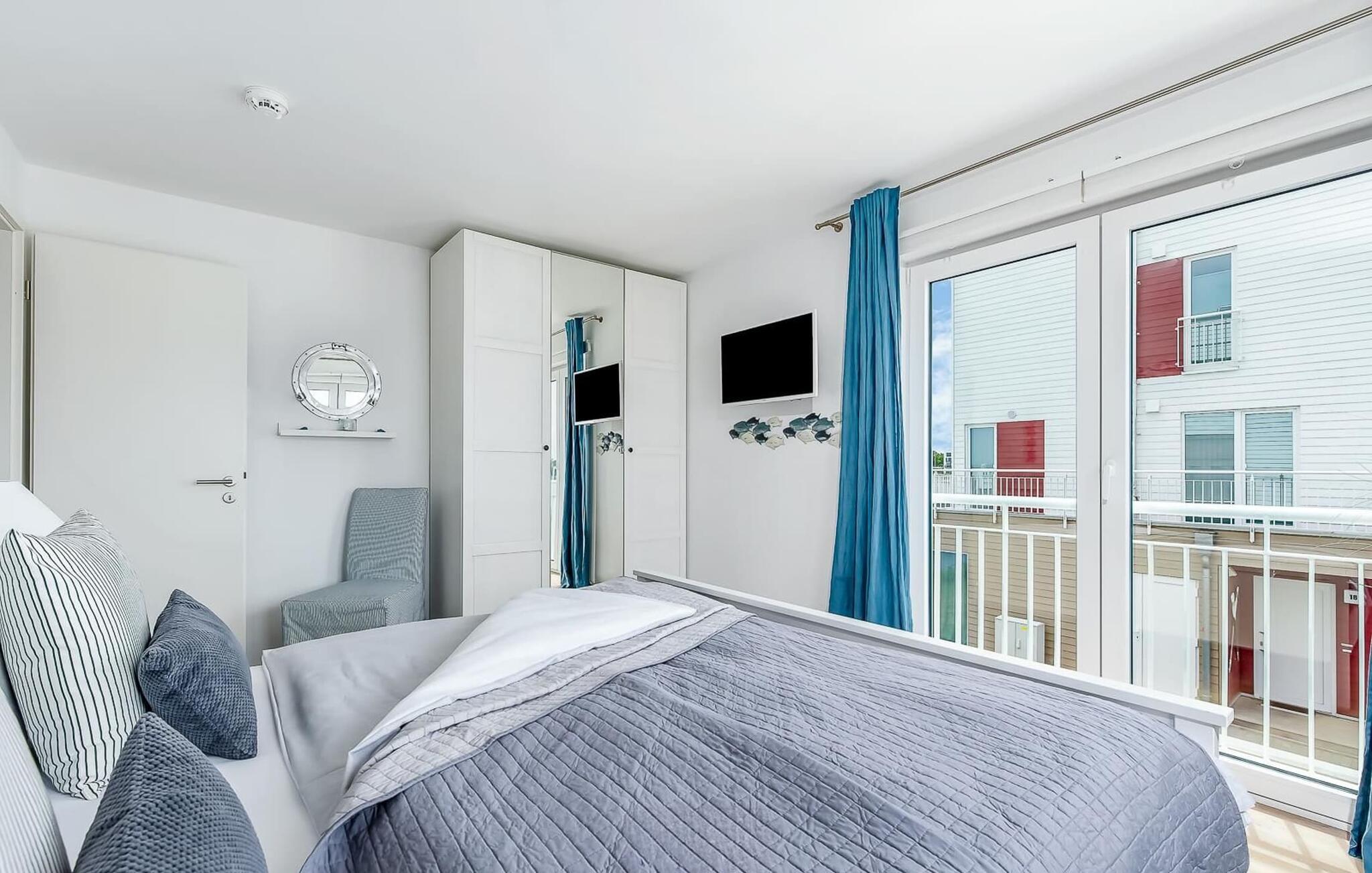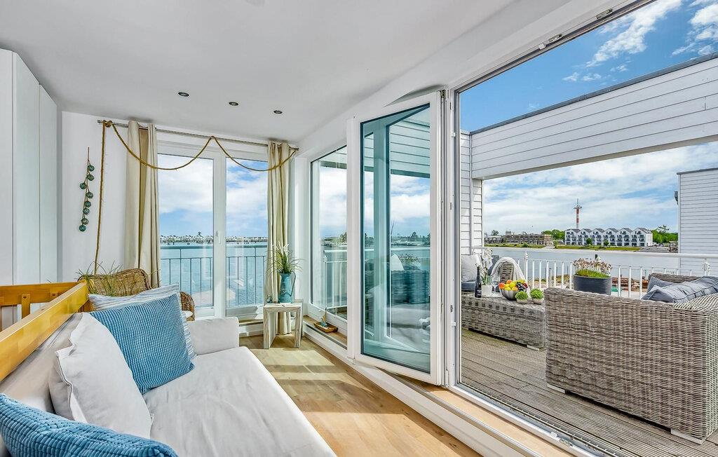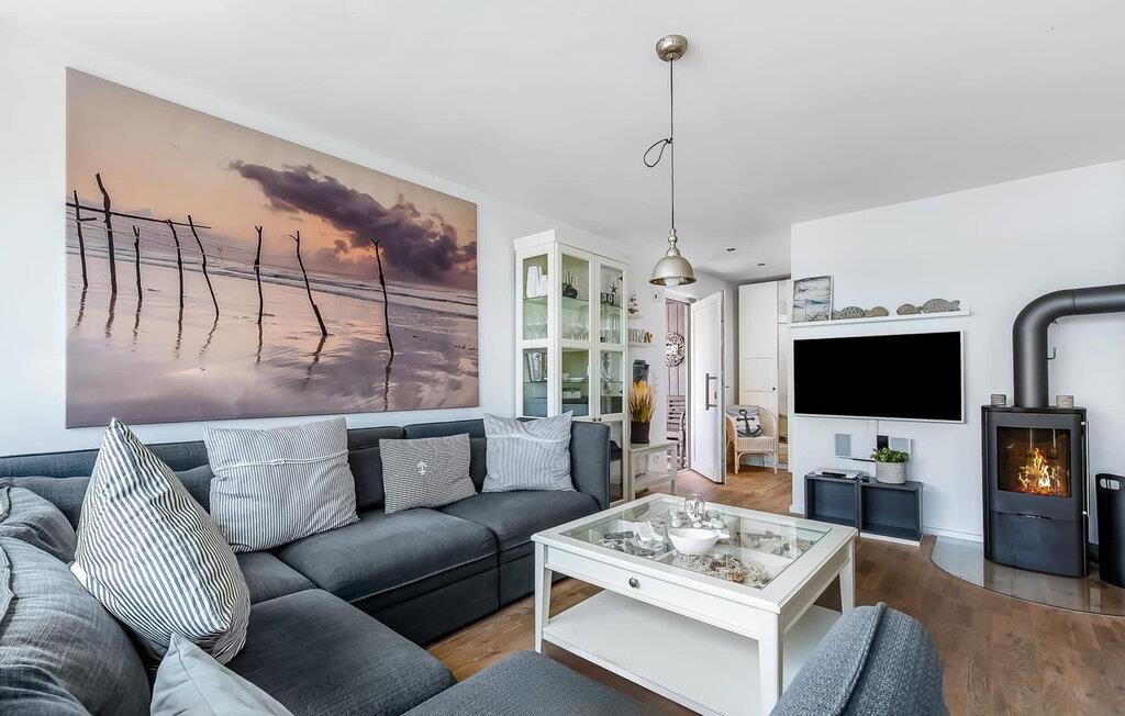 Ein großzügiger Wohn- /Essbereich mit bodentiefen Fenstern und Zugang zur Terrasse mit Panoramablick auf die Marina heißt einen in diesem Ferienhaus herzlich willkommen. Für besondere Gemütlichkeit sorgt hierbei ein Kaminofen. Die vollausgestattete Küche grenzt direkt an das Wohn- /Esszimmer und erlaubt absoluten Urlaubskomfort. Für Entertainment sorgt das Home Entertainment Programm.
