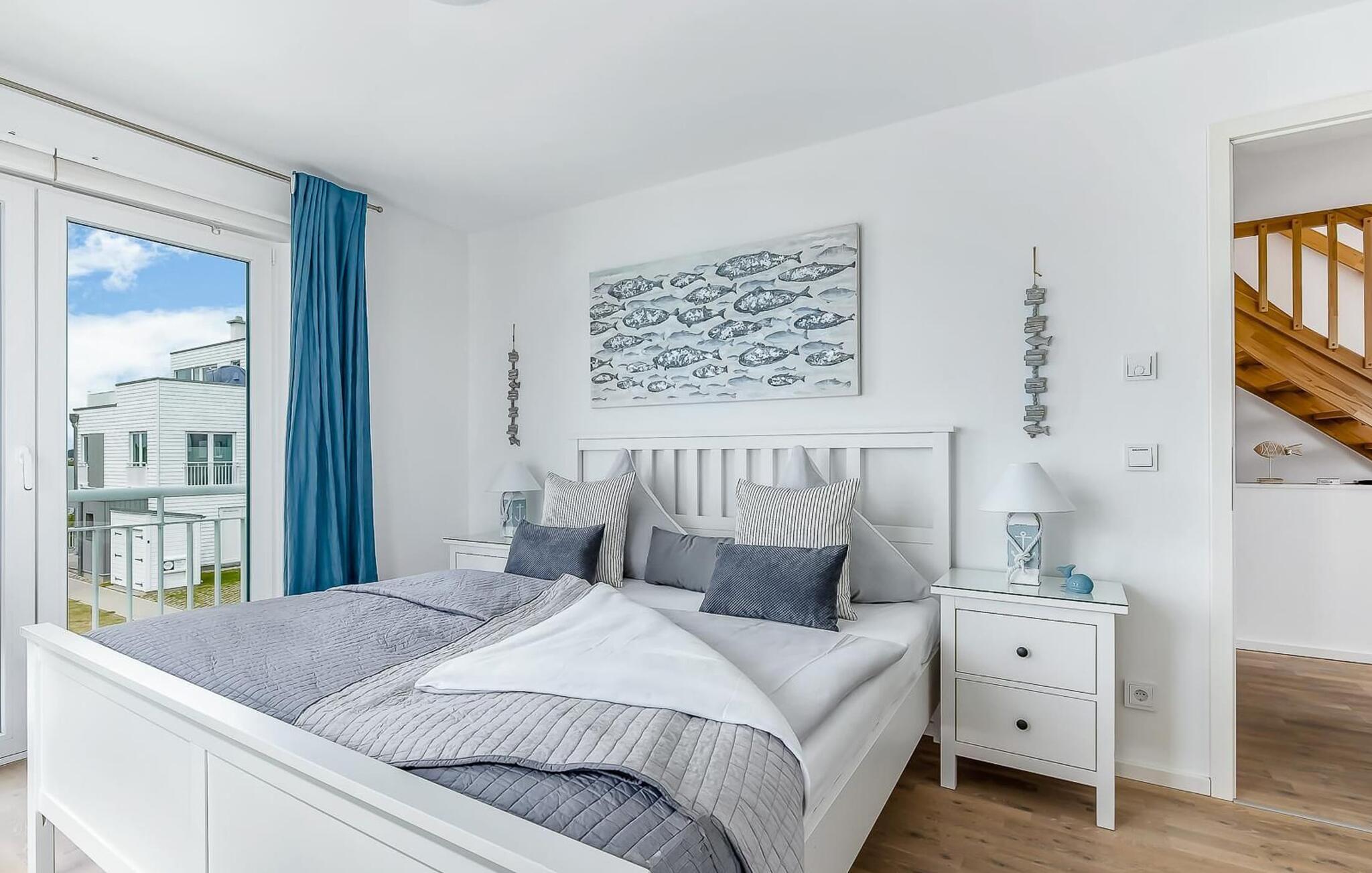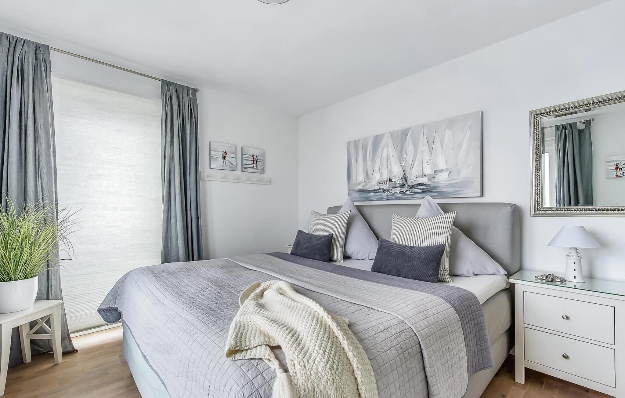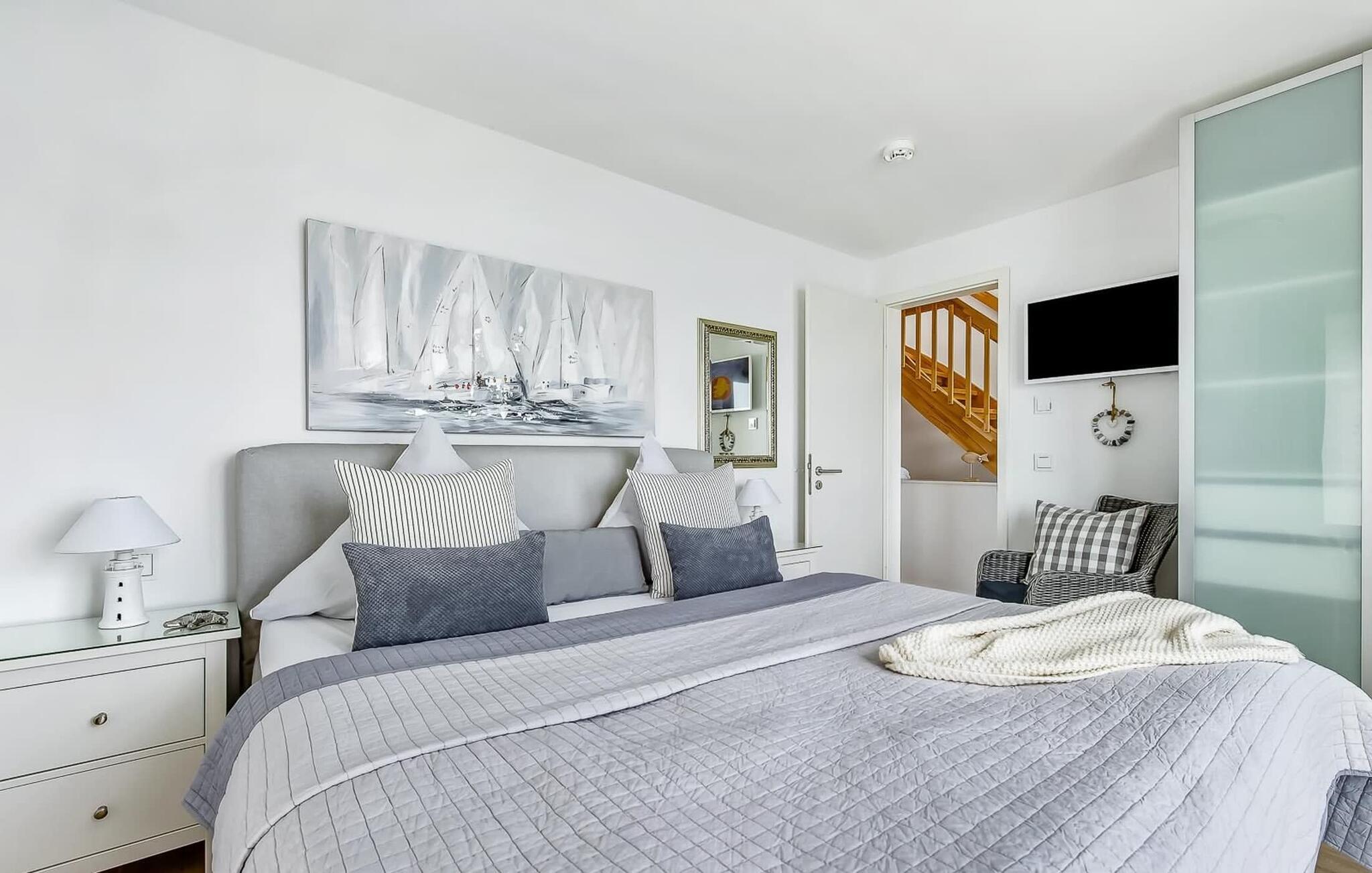 Im ersten Obergeschoss befinden sich zwei helle Schlafzimmer mit Wasserblick, eines zur Hafenseite und eines zur Schleiseite hin ausgerichtet. Für Wellnessmomente sorgt auf dieser Ebene das voll ausgestattete Badezimmer mit Relax-Whirlwanne und Blick auf die Schlei.