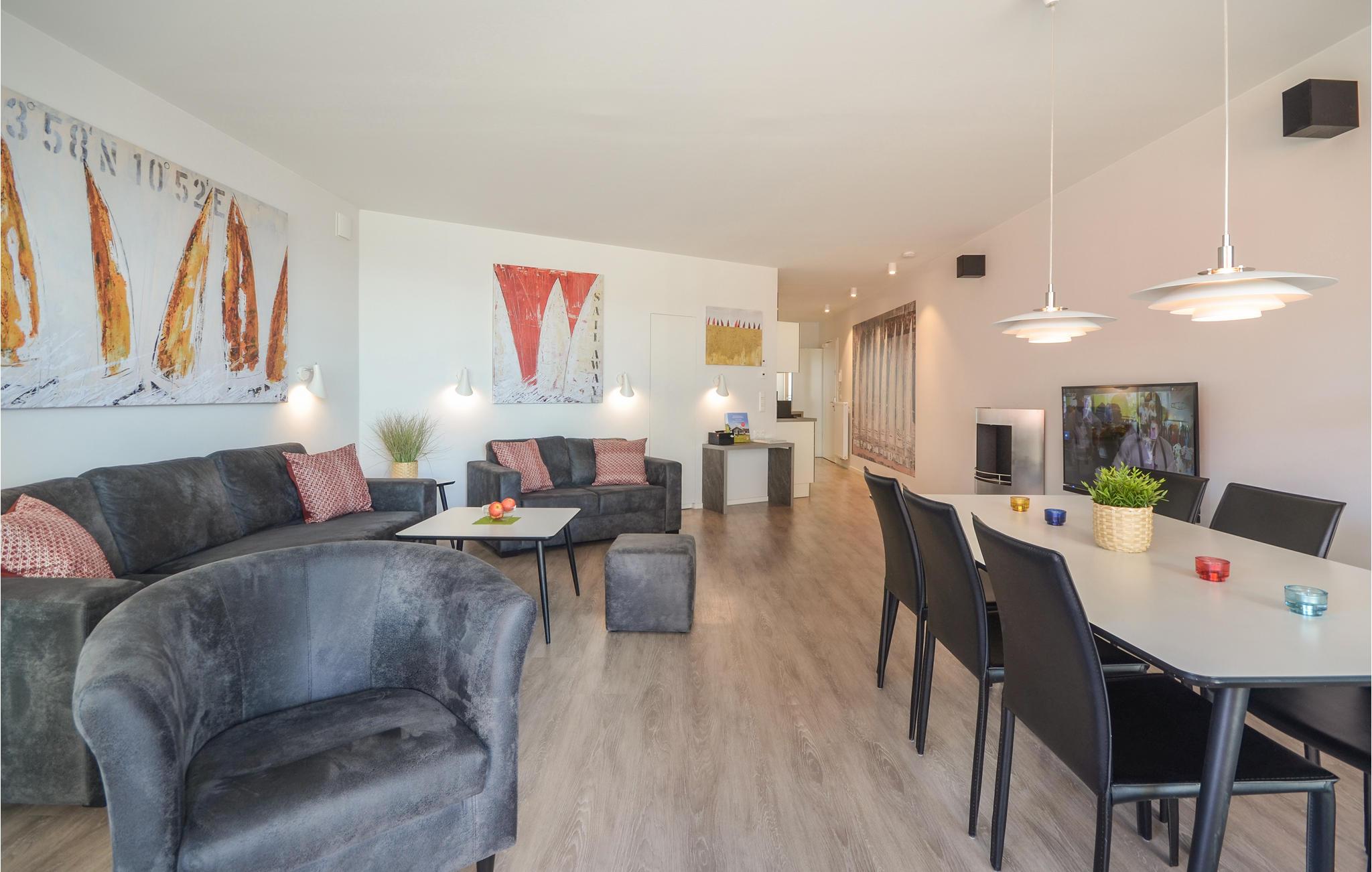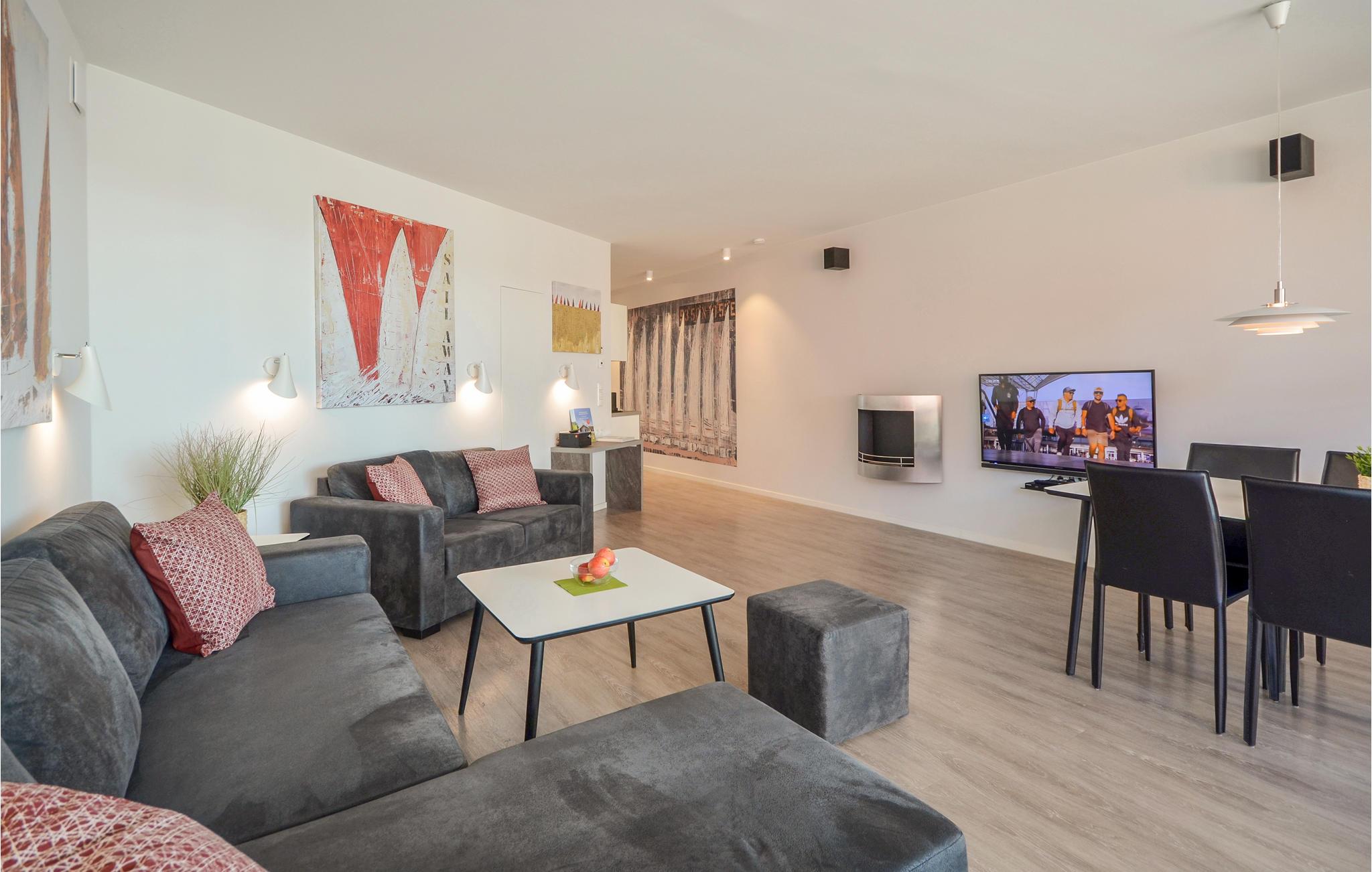 Die Wohnung ist stilvoll, hochwertig und modern eingerichtet. Ein besonderes Highlight ist das Bad, Ihr persönlicher kleiner Wellnessbereich mit Sauna, Whirlpool und Dampfbad mit integrierter Doppelregendusche. Das Wohlfühlprogramm setzt sich im Wohnbereich fort, denn die flackernden Flammen des Bioethanolkamins tauchen den Raum in ein besonders gemütliches Licht. Das Sofa lässt sich mit wenigen Handgriffen in zwei bequeme Schlafmöglichkeiten umwandeln.