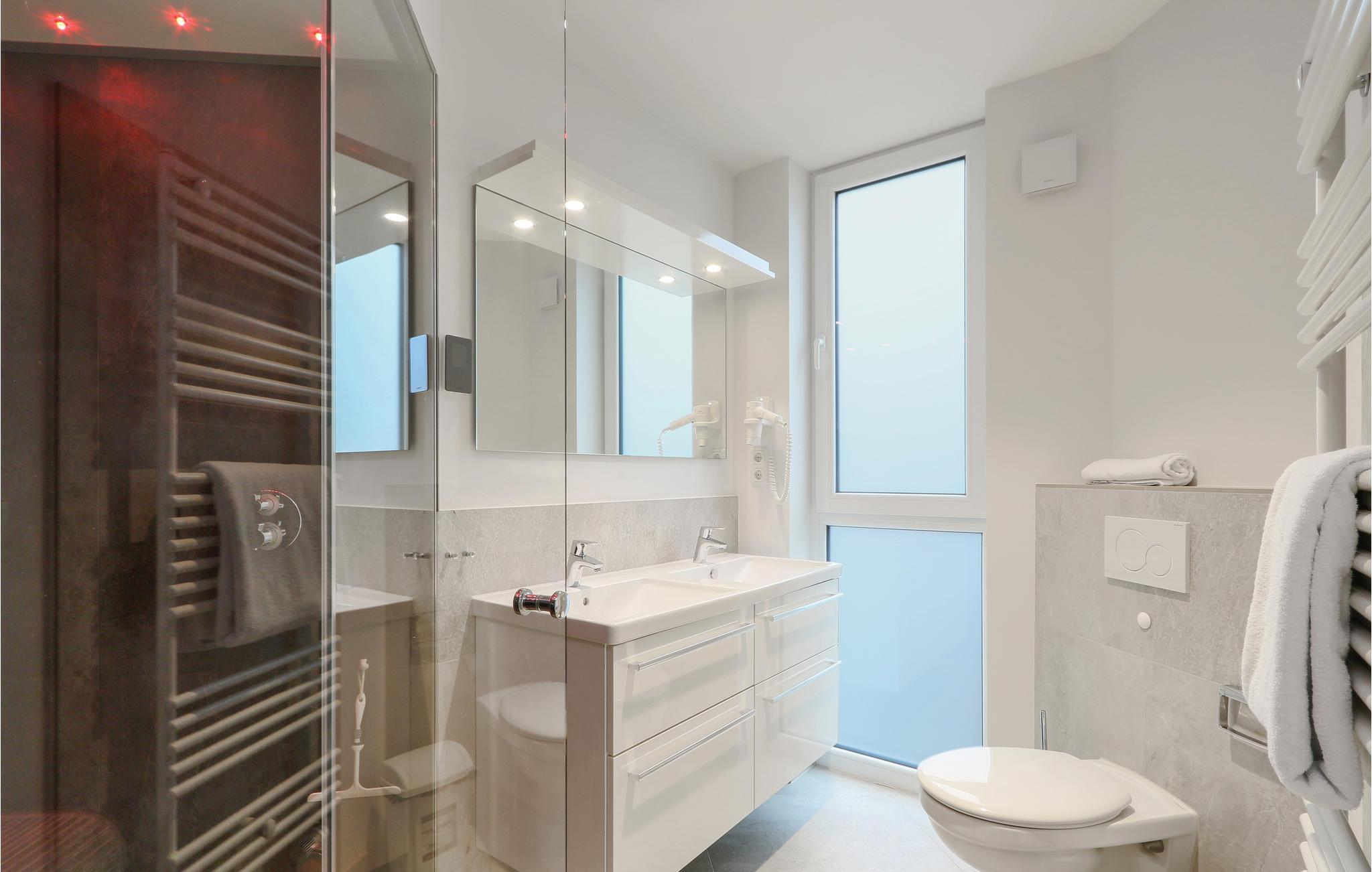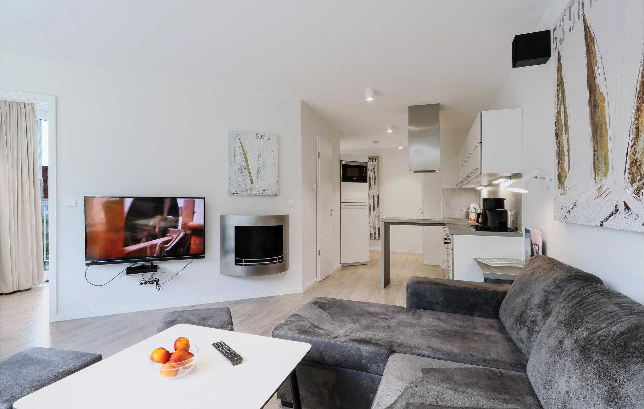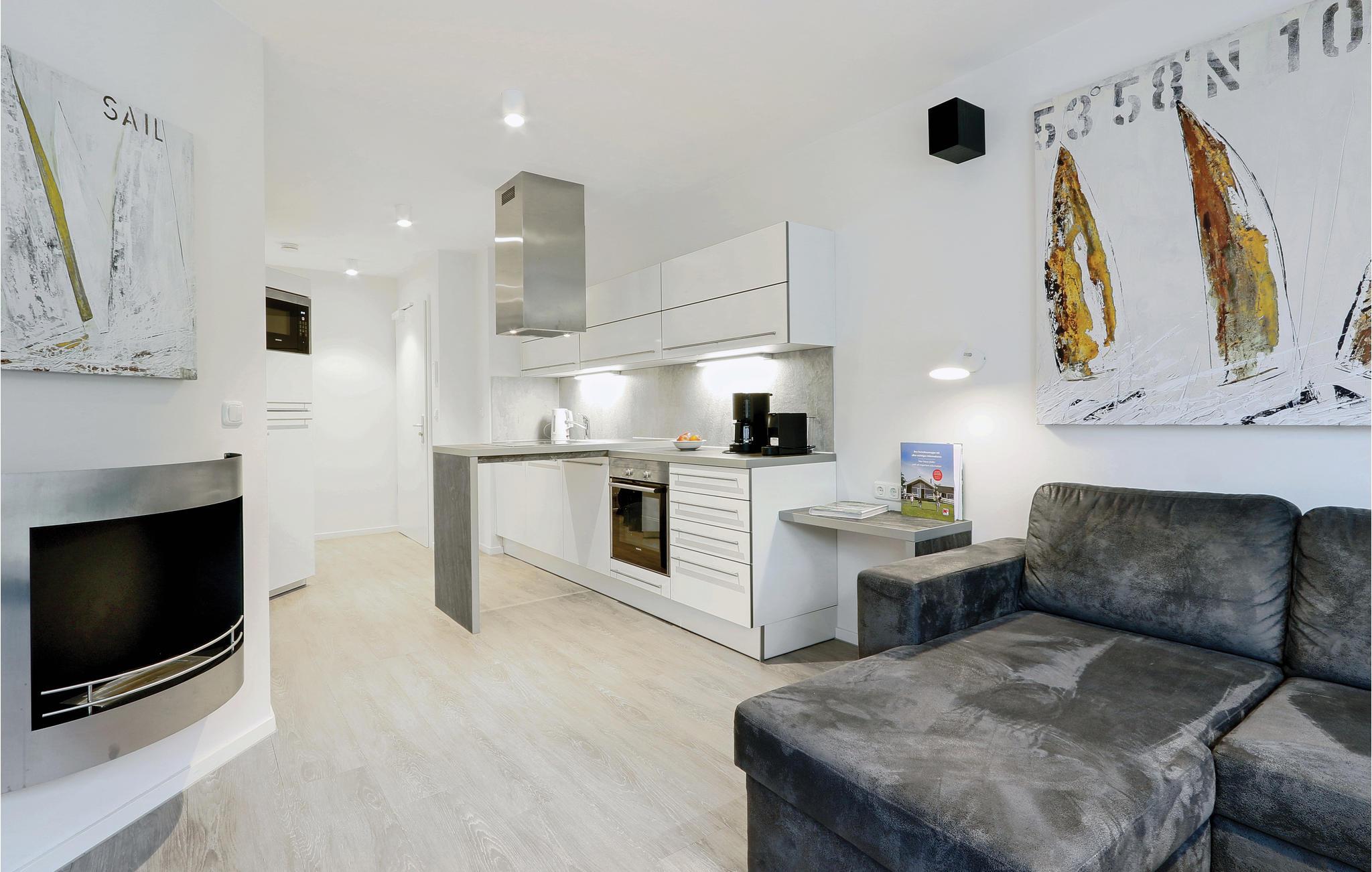 Beide Schlafzimmer sind mit jeweils einem geräumigen Doppelbett ausgestattet. Eine weitere Schlafmöglichkeit finden Sie im Wohnbereich. Hier bietet das Schlafsofa Platz für zwei weitere Personen. Im Badezimmer erwartet Sie eine private Wellness-Oase mit Fußbodenheizung und Dampfbad mit Regendusche. Lassen Sie hier einen stürmischen Tag an der See ausklingen. Hierfür eignet sich auch der Bioethanolkamin, der im Wohnzimmer ein gemütliches Ambiente schafft.