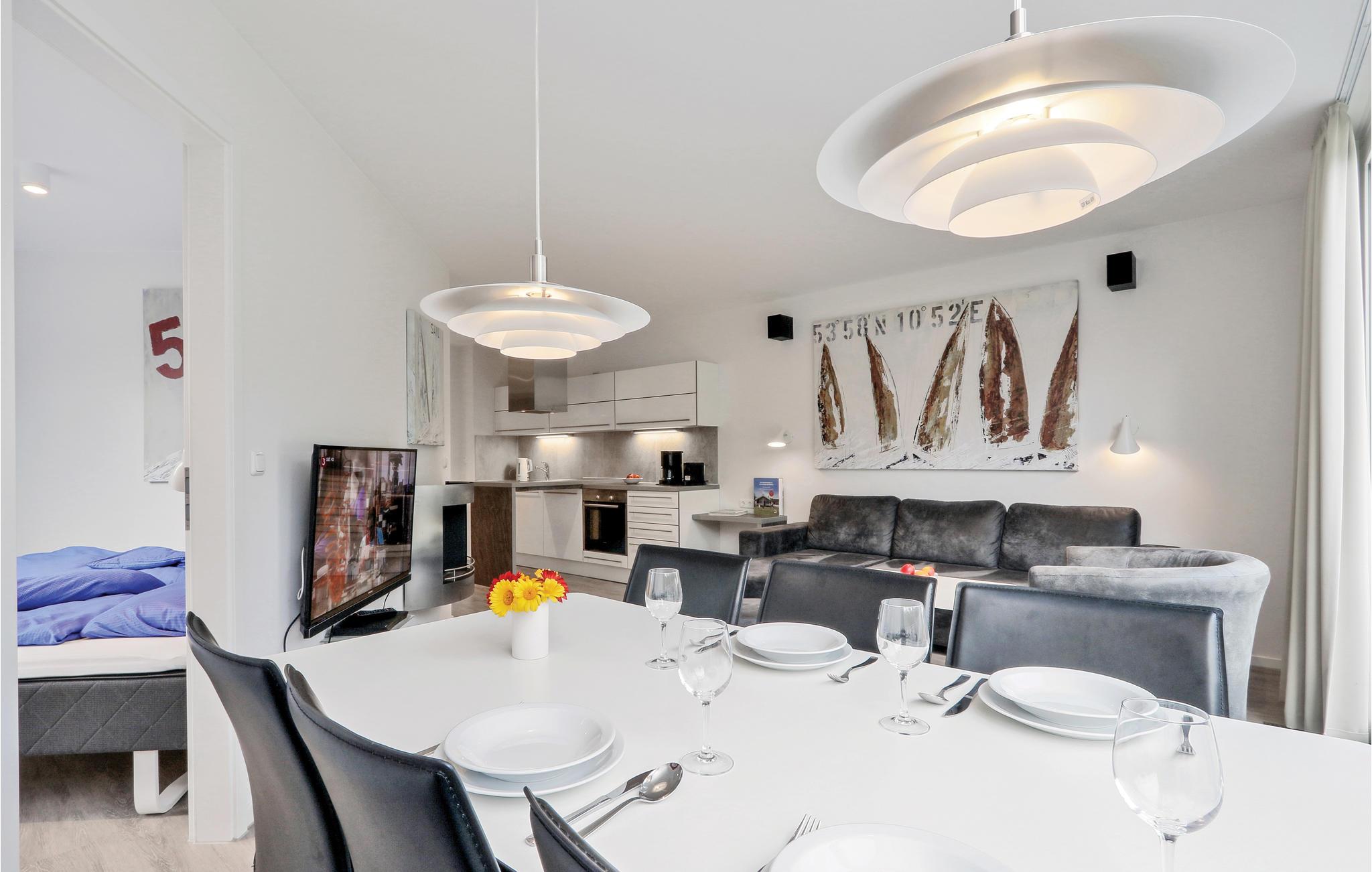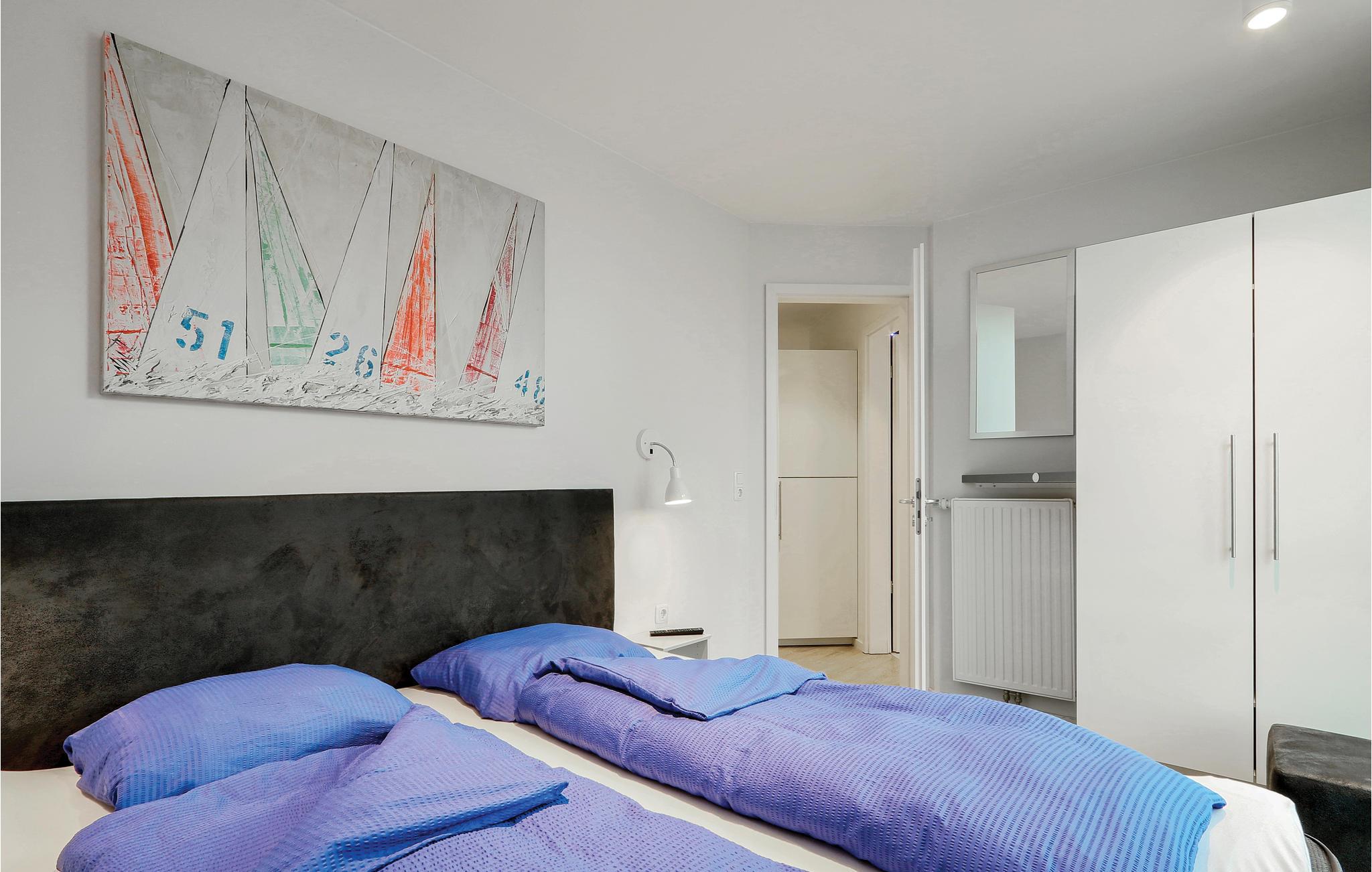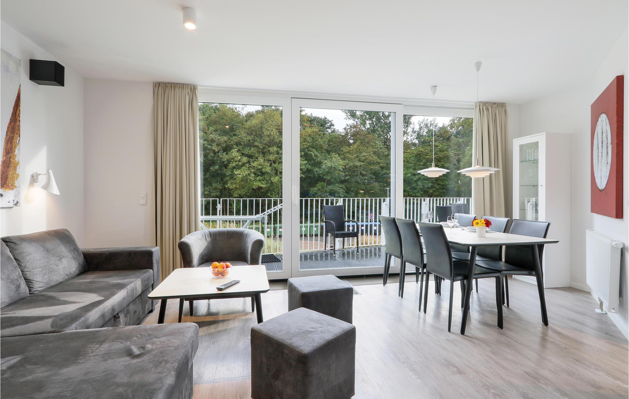 Beide Schlafzimmer sind mit jeweils einem geräumigen Doppelbett ausgestattet. Eine weitere Schlafmöglichkeit finden Sie im Wohnbereich. Hier bietet das Schlafsofa Platz für zwei weitere Personen. Im Badezimmer erwartet Sie eine private Wellness-Oase mit Fußbodenheizung und Dampfbad mit Regendusche. Lassen Sie hier einen stürmischen Tag an der See ausklingen. Hierfür eignet sich auch der Bioethanolkamin, der im Wohnzimmer ein gemütliches Ambiente schafft.