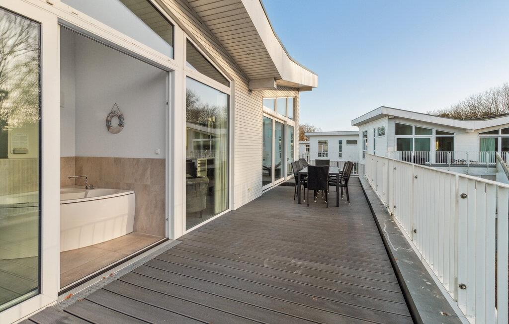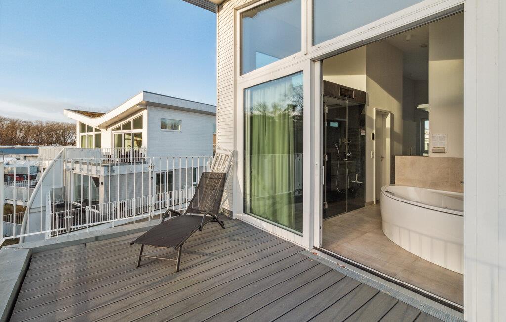 Luxuriöses Penthouse in Travemünde BeachBay mit Dachterrasse, Whirlpool und Blick auf Sanddünen.