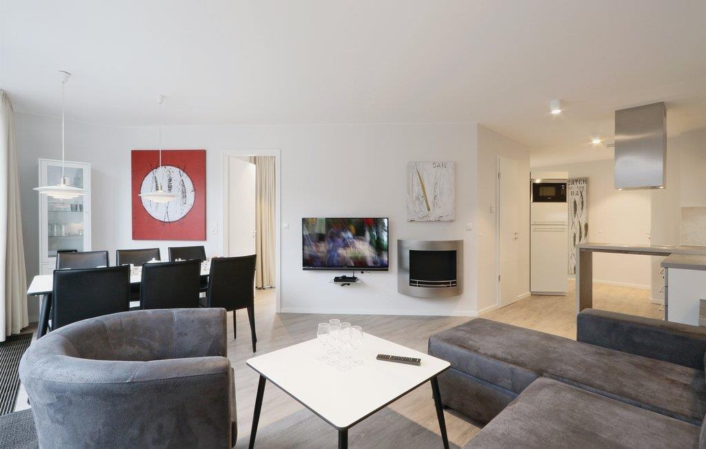 Beide Schlafzimmer sind mit jeweils einem geräumigen Doppelbett ausgestattet. Eine weitere Schlafmöglichkeit finden Sie im Wohnbereich. Hier bietet das Schlafsofa Platz für zwei weitere Personen. Im Badezimmer erwartet Sie eine private Wellness-Oase mit Fußbodenheizung und Dampfbad mit Regendusche. Lassen Sie hier einen stürmischen Tag an der See ausklingen. Hierfür eignet sich auch der Bioethanolkamin, der im Wohnzimmer ein gemütliches Ambiente schafft.