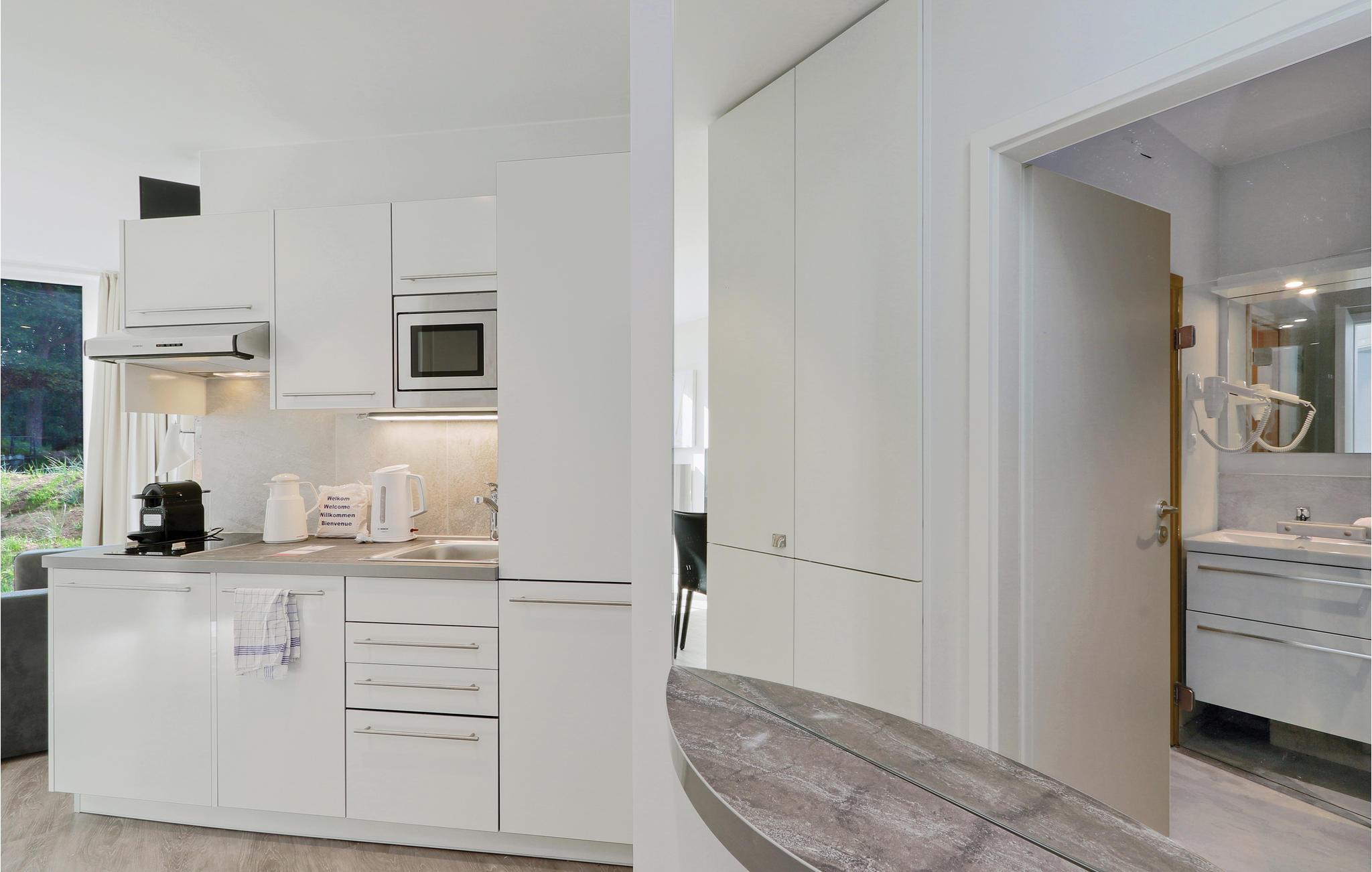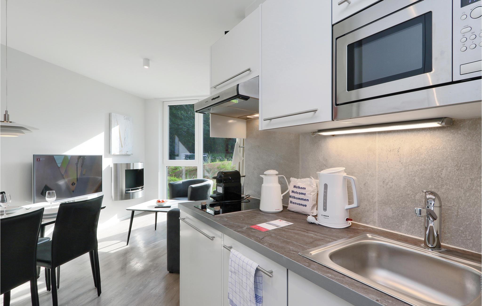 Der Wohnbereich verfügt über einen Erker aus Glas, dadurch ist die Ferienwohnung besonders hell und lichtdurchflutet. Hier befinden sich ebenfalls die Küchenzeile, das Schlafsofa sowie der Bio-Ethanolkamin. Die überdachte Terrasse erreichen Sie vom separaten Schlafzimmer aus. In der Küche finden Kaffeeliebhaber eine Nespresso-Maschine (Kapseln bitte selbst mitbringen), sowie Thermoskanne und Handfilter zum Selbstbrühen, falls Sie doch den klassischen Filterkaffee bevorzugen.