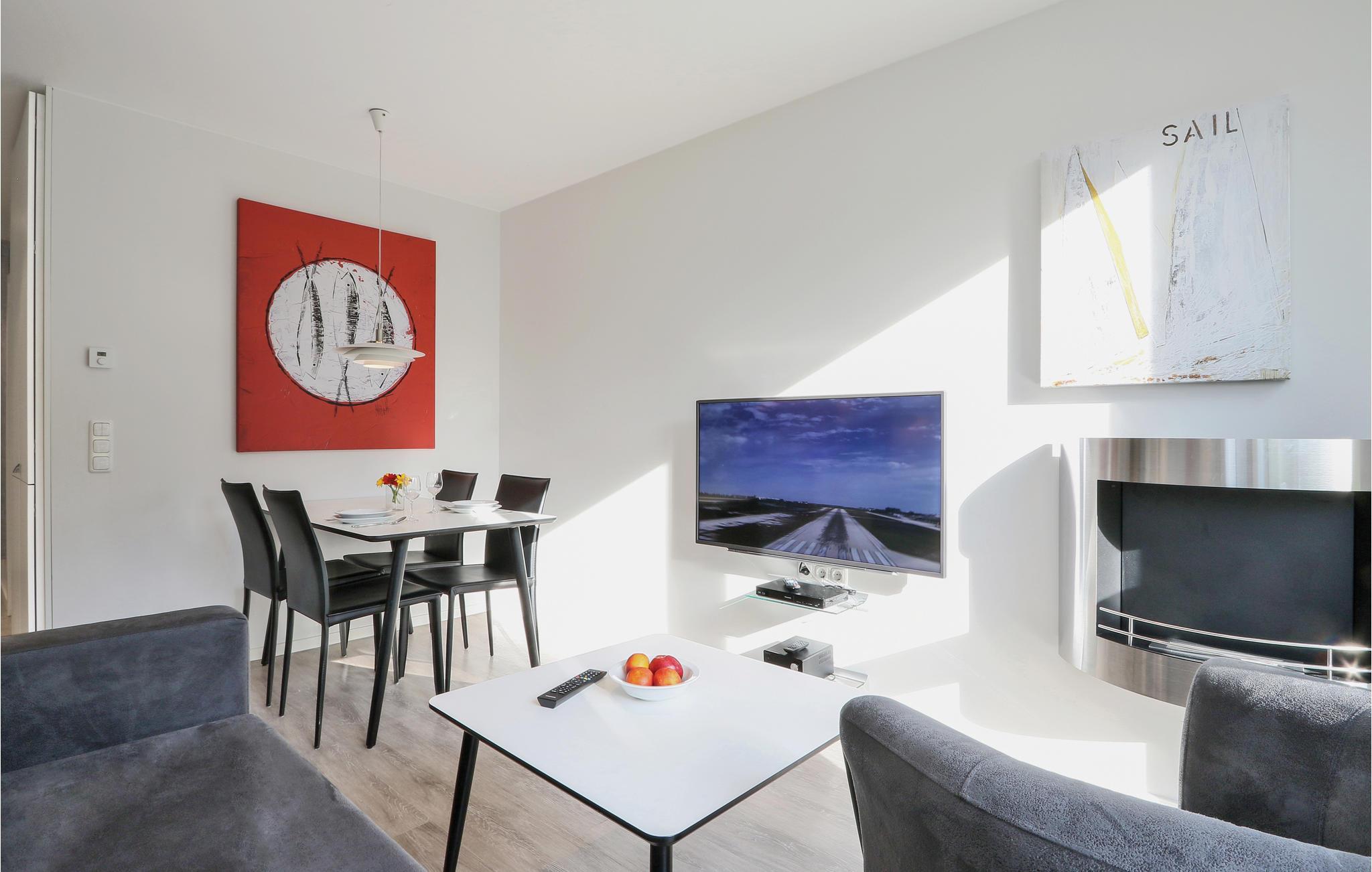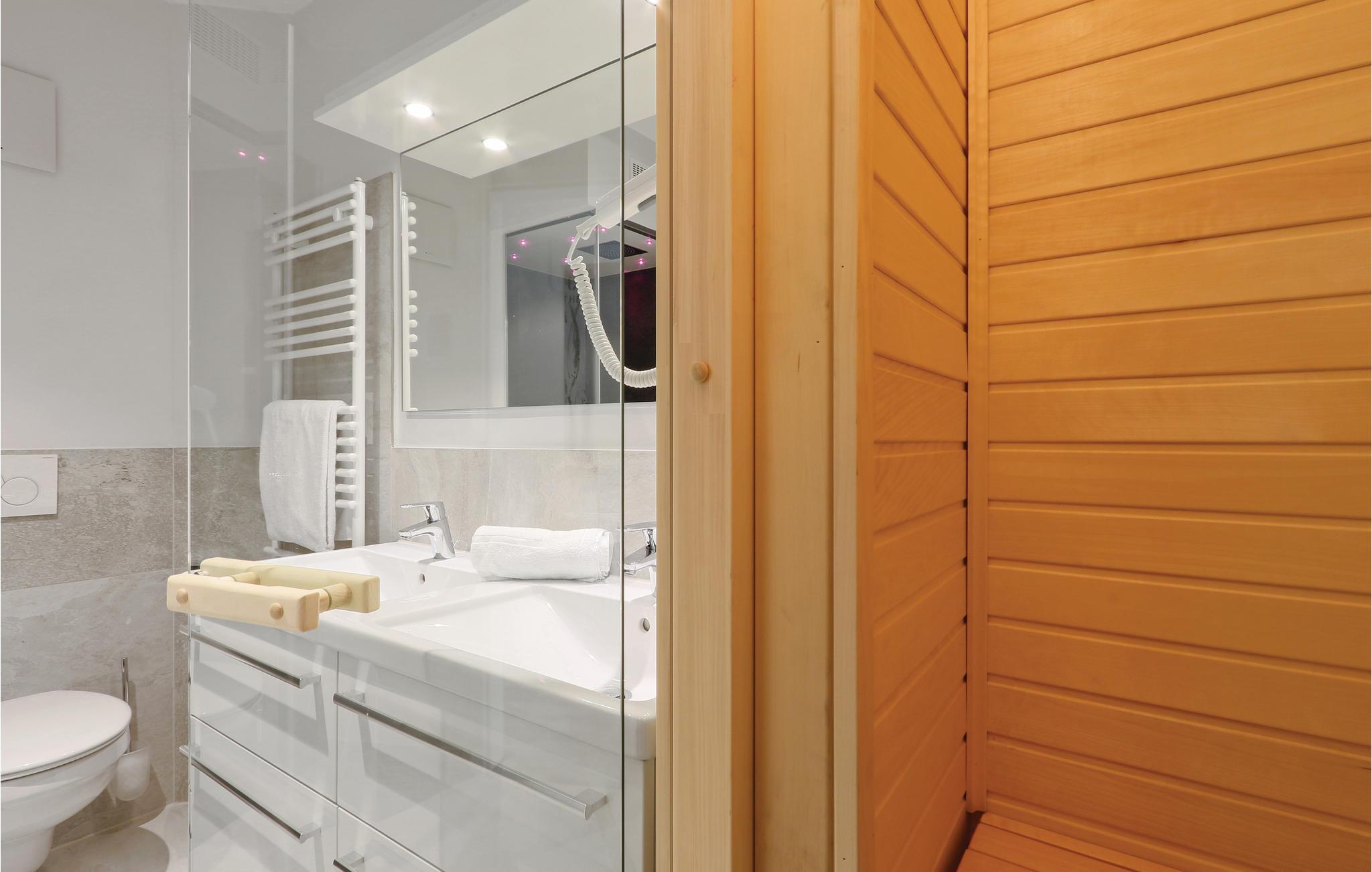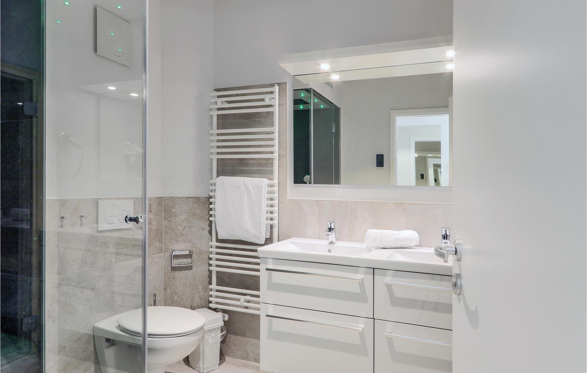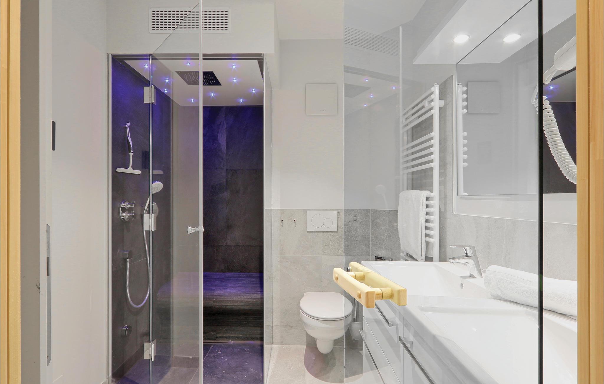Das Badezimmer präsentiert sich als Ihr privater Wellness-Bereich. Hier können Sie es sich in der Infrarotsauna gemütlich machen oder im Dampfbad mit Regendusche entspannen. Die Ferienwohnung verfügt außerdem über ein modernes Entertainmentsystem mit Blu-Ray-Player, zwei Flatscreen-TV und einer Musikanlage mit MP3-Anschluss.