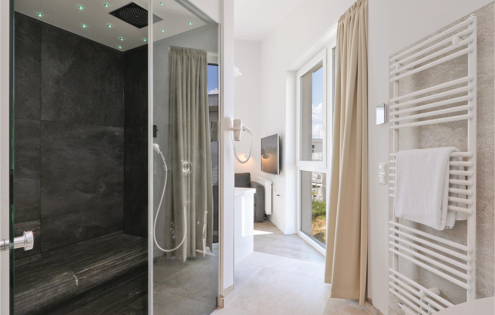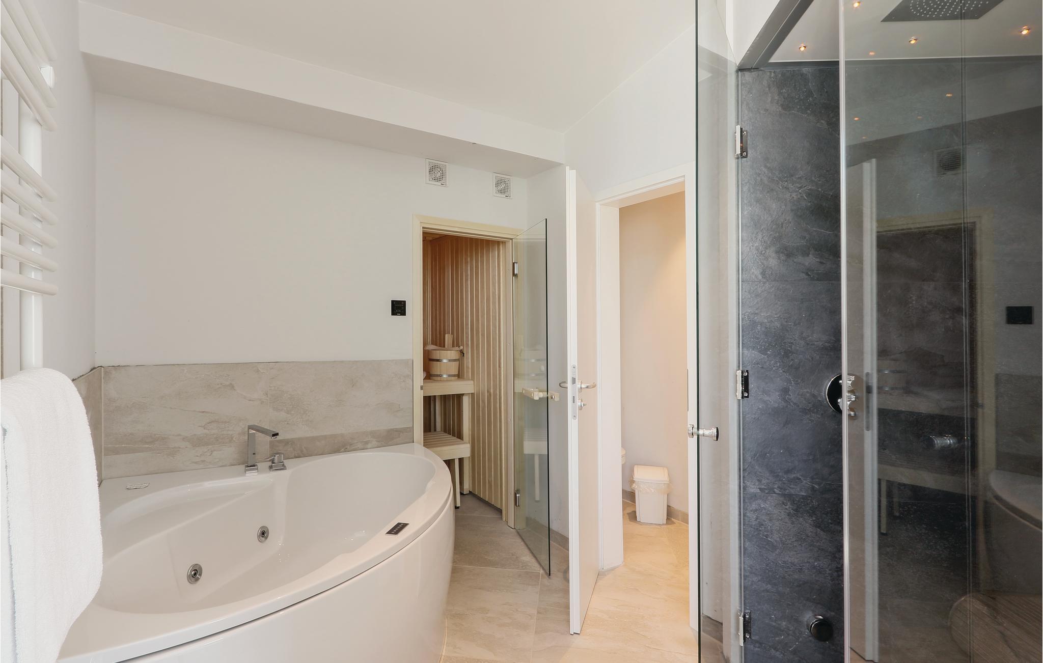 Das Badezimmer präsentiert sich Ihnen als privater Wellnessbereich mit Dampfbad und Doppelregendusche. Entspannen Sie außerdem in der Sauna oder im Whirlpool.